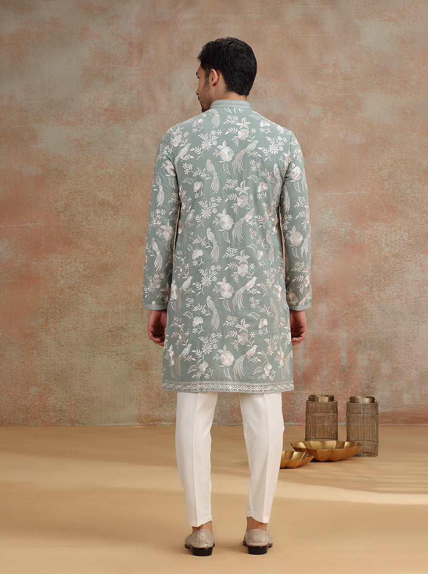 Details: Step into elegance with TULA's exquisitely crafted men's kurta pajama set, perfect for pre-wedding functions and festive occasions. Made from a premium silk blend fabric, this ensemble promises a luxurious experience with its smooth and comfortable feel. The kurta features intricate DORI embroidery and a distinctive printed pattern, adding a layer of sophistication to your traditional wear. Designed in a classic straight cut with a regular fit, it complements all body types effortlessly. The modern mandarin collar enhances the kurta's appeal, offering a stylish yet traditional vibe. Whether you're attending a pre-wedding event or a festive celebration, this kurta pajama set from TULA ensures you make a lasting impression. Embrace timeless elegance and impeccable style with TULA's green kurta pajama, an essential addition to any discerning wardrobe.