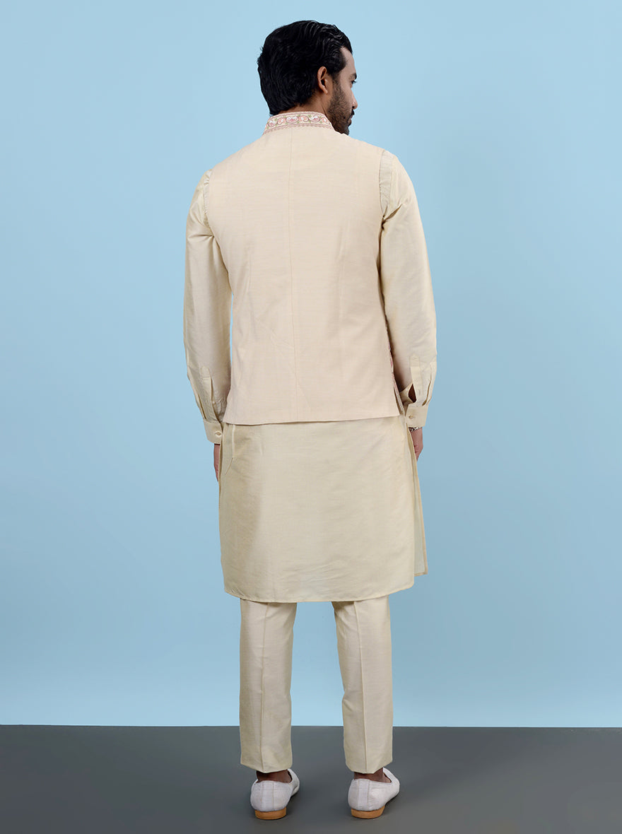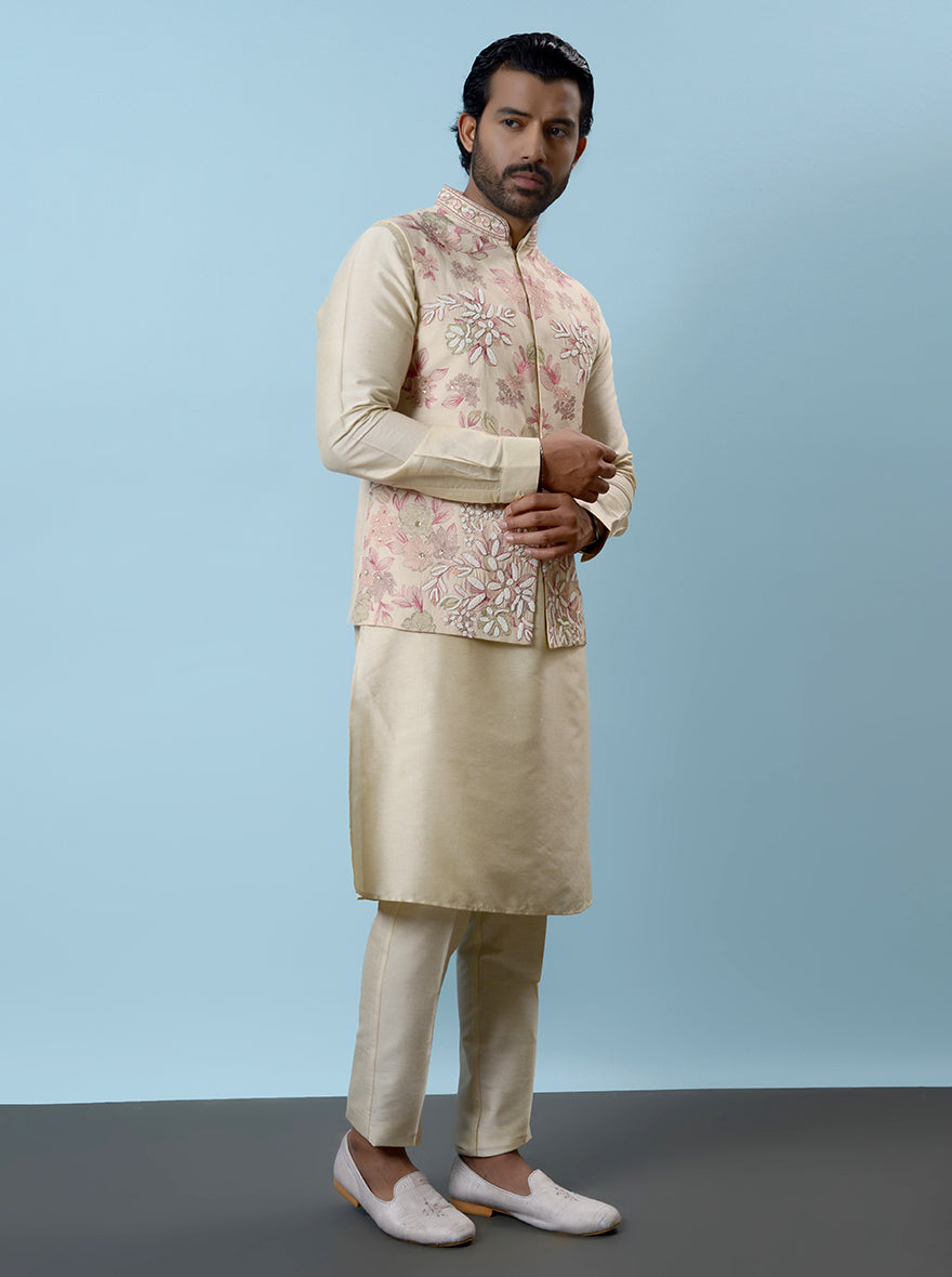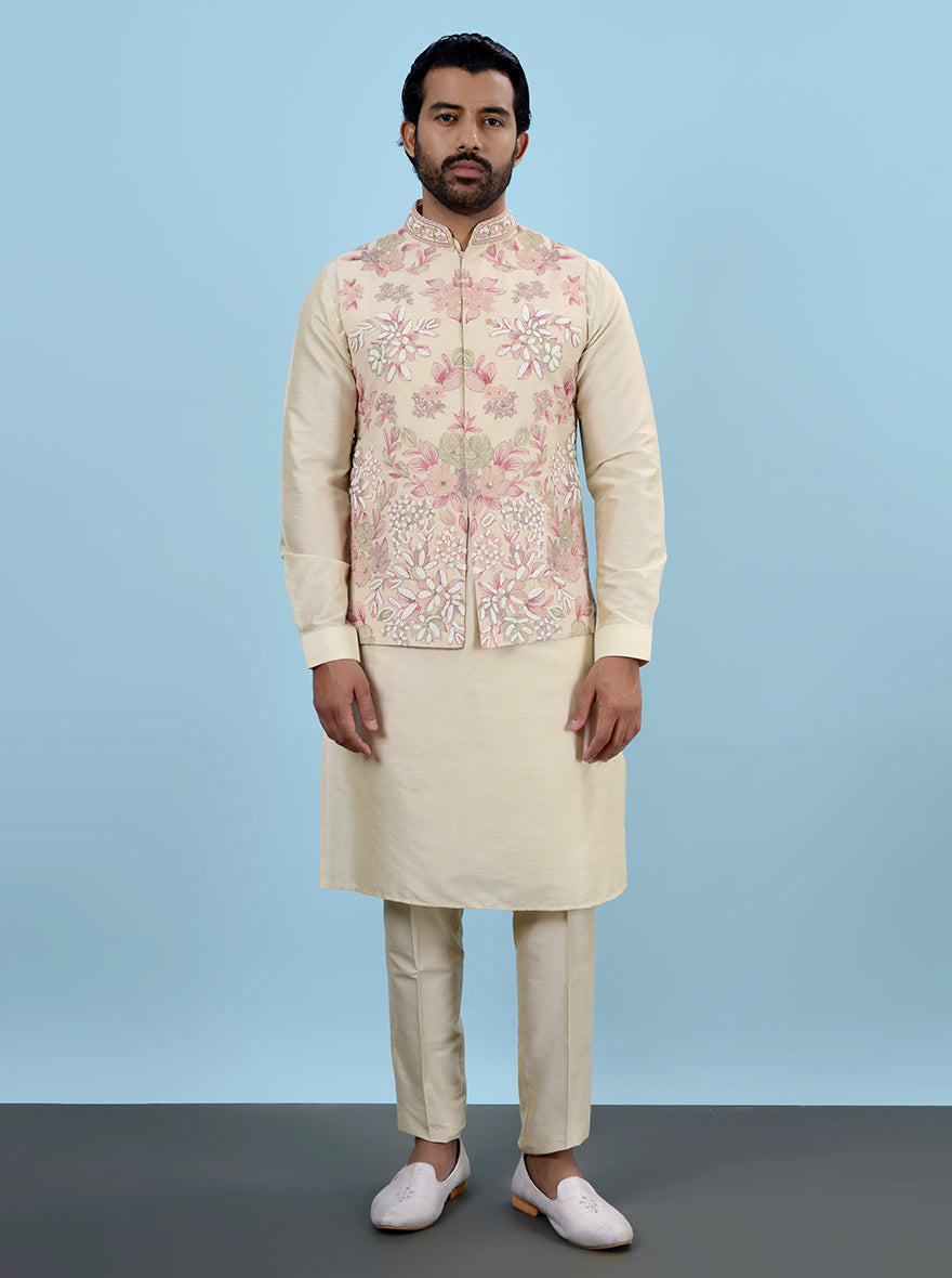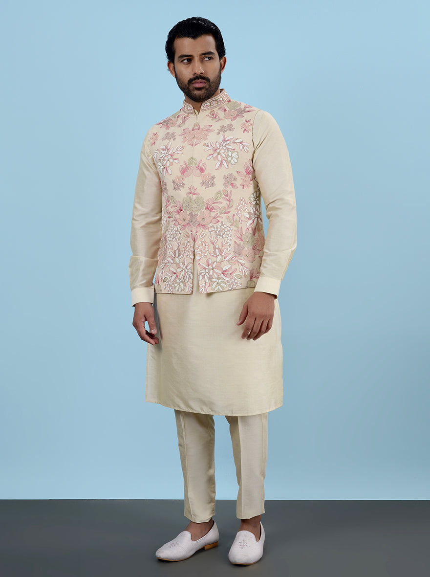 Details: Step out in style with our TULA Kurta Set with Koti designed for gruh shanti, father at wedding. Made from premium silk, this regular fit fit suit features embroidery, making it perfect for any special occasion. Enhance your wardrobe with this essential piece.
