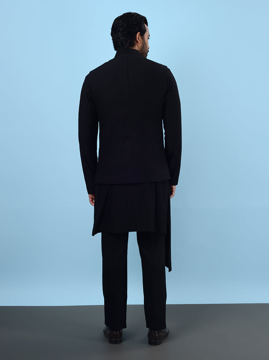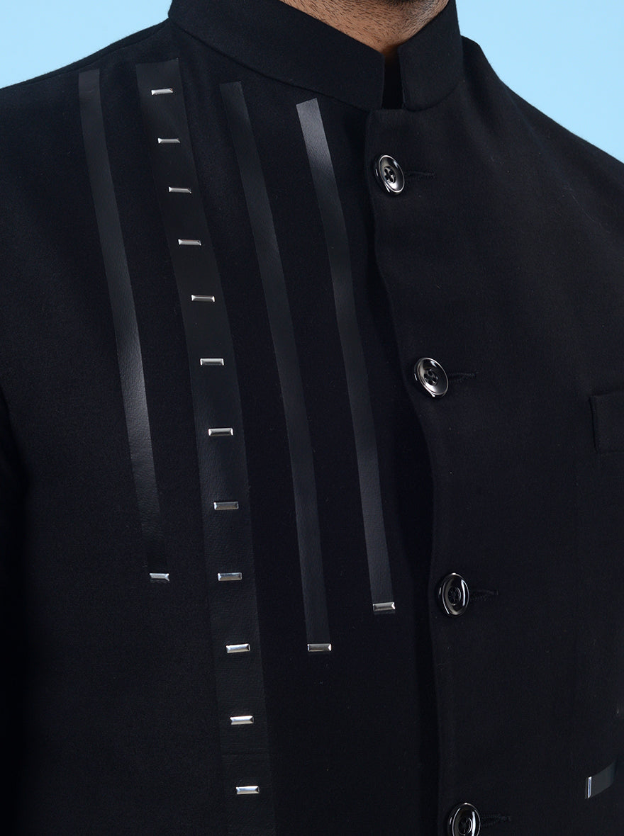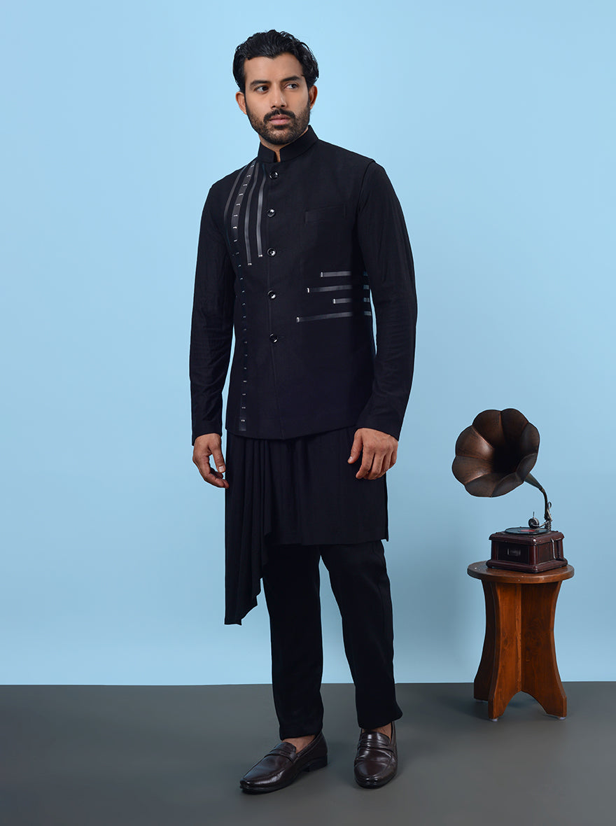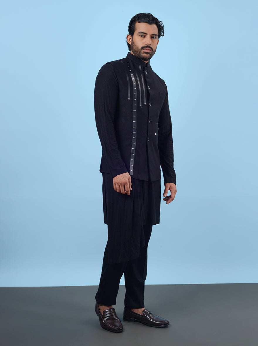 Details: Introducing the TULA Kurta Set with Koti, a perfect blend of style and comfort. Tailored from Cotton Stretch and featuring a Regular Fit fit, this piece is ideal for your wardrobe. Adorned with placement embroidered and detailed leather,metal work machine Work With, it offers a unique aesthetic that stands out in any gathering. Whether it's for Black or a formal event, this Kurta Set with Koti is versatile enough to suit various occasions. Experience the perfect mix of traditional craftsmanship and contemporary fashion with our meticulously designed piece.