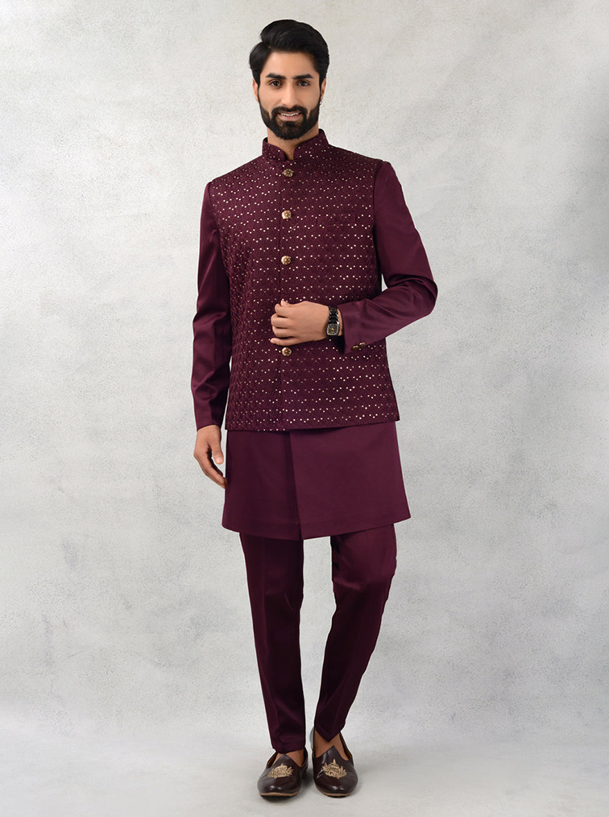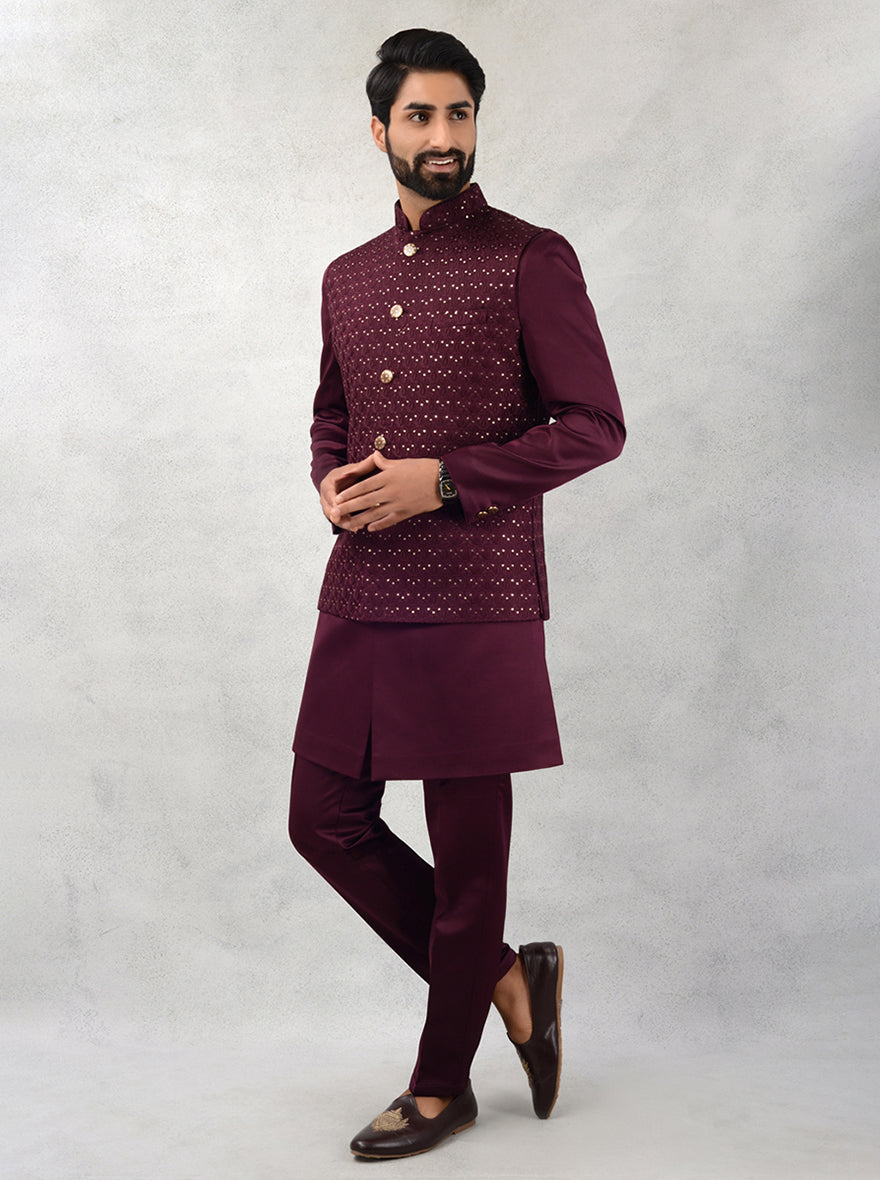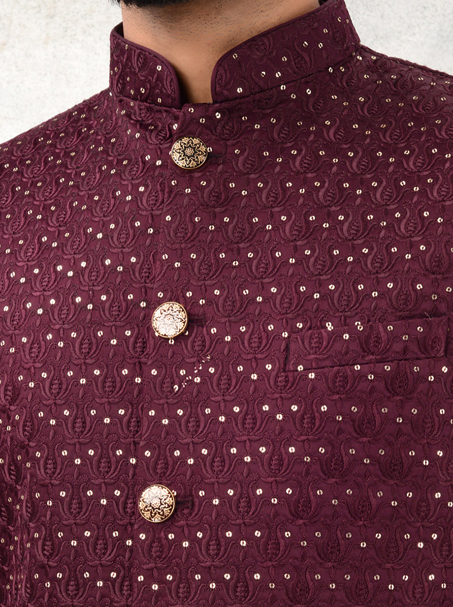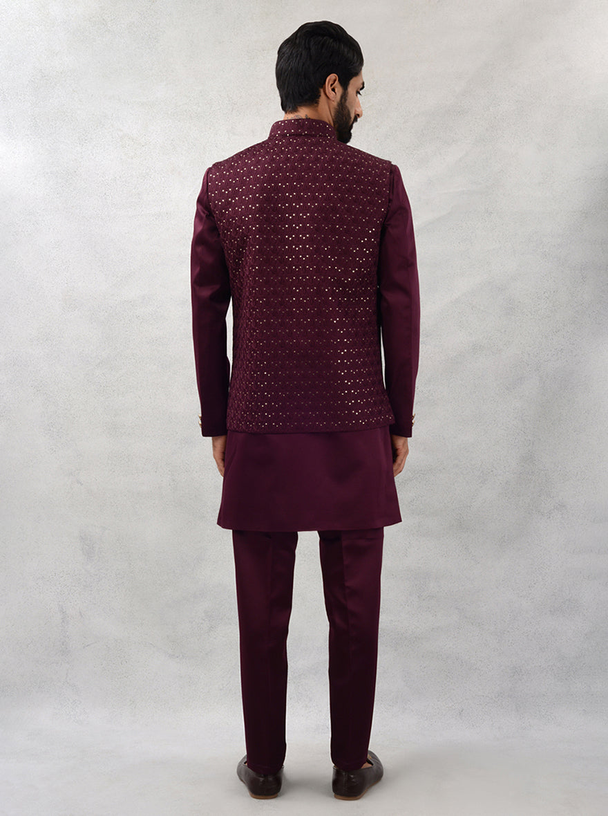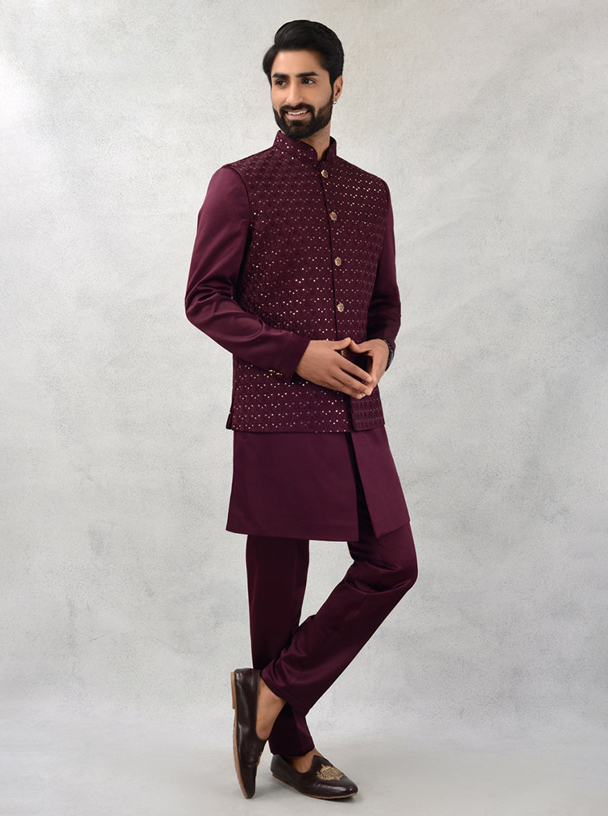 Details: Experience the epitome of grace and style with TULA's Kurta Set with Koti. Our meticulously crafted ensemble effortlessly merges timeless elegance with contemporary trends, ensuring you shine with confidence and comfort. Delicately curated with utmost care, this ensemble exudes the perfect blend of classic charm and modern aesthetics, offering you a wardrobe essential that truly matters. Indulge in the luxurious allure of our Satin Blend fabric, a testament to our commitment to top-quality materials. This fabric not only adds a touch of opulence to your ensemble but also ensures unparalleled comfort throughout any occasion. Designed to reflect your unique fashion sense, our Kurta Set with Koti allows your personal style to radiate brightly. Allow your style to make a statement with our intricately embroidered pattern. The resham and sequins work lend an exquisite and captivating touch, truly elevating your ensemble to new heights. With a classic, straight cut, our ensemble exudes sophistication and offers a flattering silhouette that enhances your natural grace. The enchanting wine color adds a touch of allure, making you the center of attention at any sangeet event. Rest assured, TULA's Kurta Set with Koti offers the perfect combination of style and comfort, ensuring you can move with ease and confidence. We understand the importance of finding dependable, friendly, and down-to-earth choices for special events, and our ensemble is designed with your satisfaction in mind. Upgrade your style and boost your confidence in every step you take with TULA. Our Kurta Set with Koti not only showcases sophistication but also embodies the essence of grace and elegance. Embrace the power of TULA and make a lasting impression at your next sangeet event.