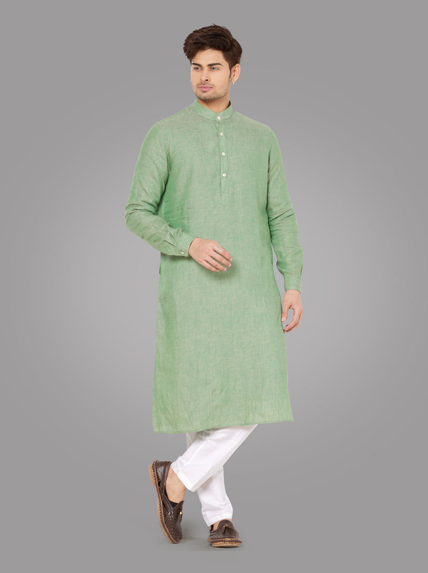 Details: Experience timeless elegance with the Modi Kurta in Deep Sage Green. Crafted from pure linen, this classic straight cut kurta offers a perfect blend of comfort and style. With its regular fit and full sleeves, it is designed to provide you with a relaxed and sophisticated look on semi-casual occasions. The Modi Kurta features a deep sage green color, adding a touch of freshness and uniqueness to your wardrobe. Made from high-quality pure linen fabric, it offers exceptional breathability and comfort, making it ideal for all-day wear. This kurta is meticulously crafted to ensure a comfortable fit and a flattering silhouette. Its regular fit allows for easy movement and ensures a relaxed feel, while the full sleeves provide coverage and a touch of elegance. The collar type is regular, adding a classic element to the design. The Modi Kurta is perfect for various occasions, including social gatherings, festive celebrations, and casual outings. Its versatile design makes it easy to pair with different bottoms, such as jeans, churidars, or even dhotis, allowing you to create multiple stylish looks. Elevate your style with the Modi Kurta and make a statement wherever you go. Its deep sage green color, pure linen fabric, and classic straight cut design make it a timeless addition to your wardrobe. Experience comfort, style, and sophistication with this must-have kurta.