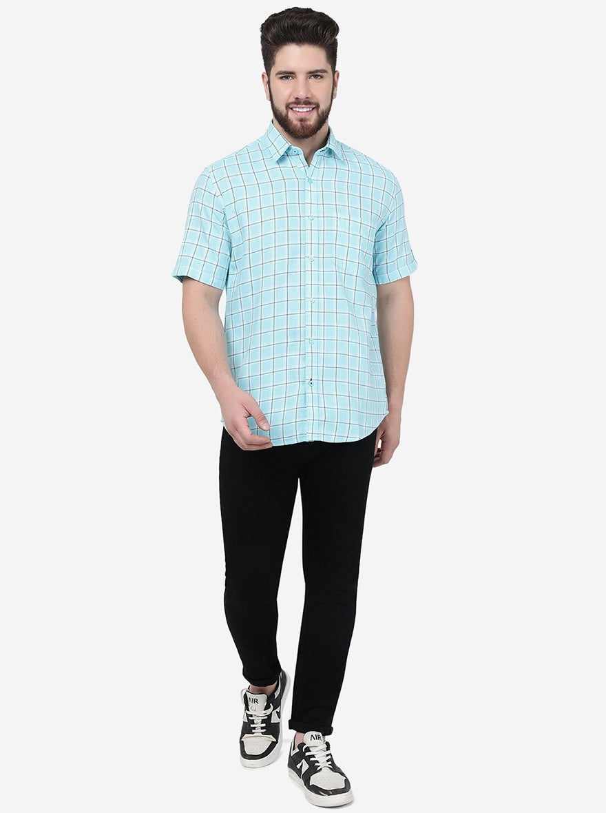 Aqua Blue Checked Smart Fit Semi Casual Shirt | Greenfibre