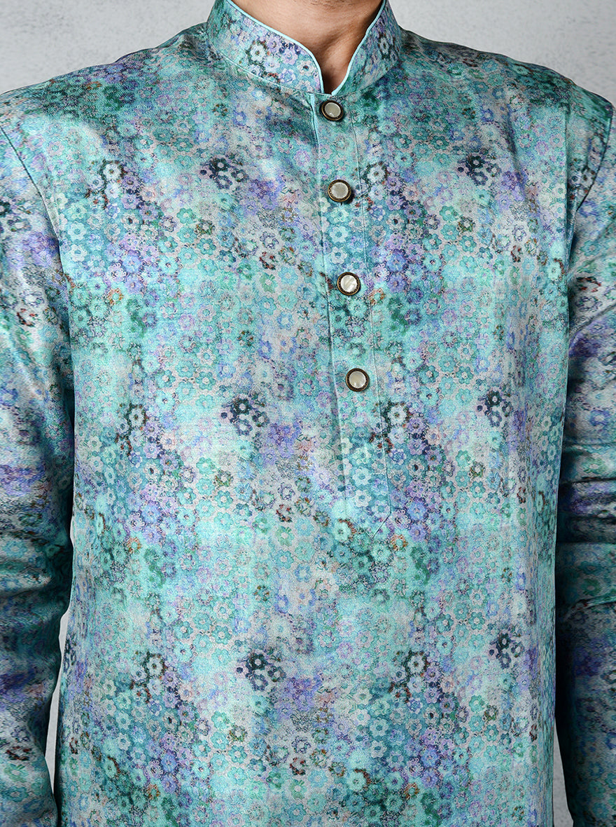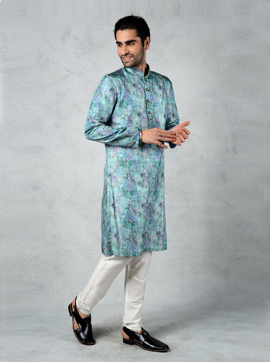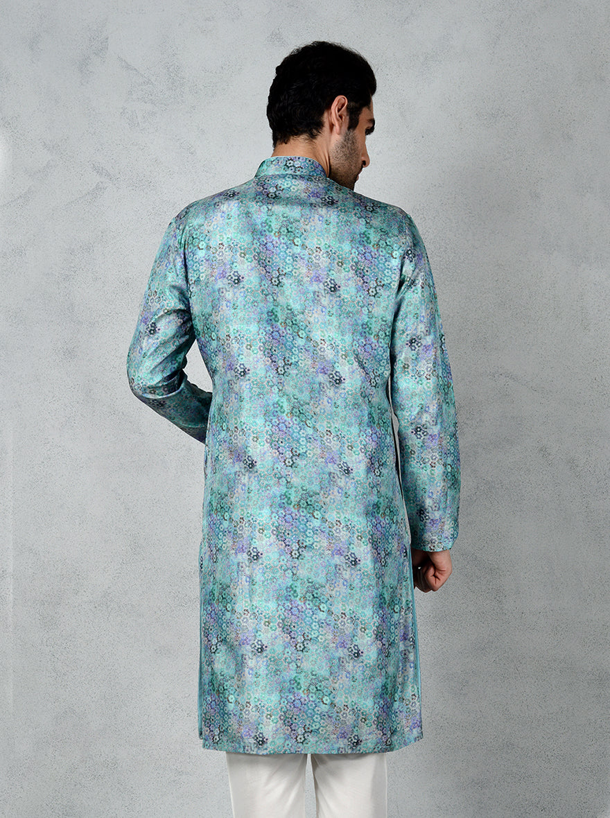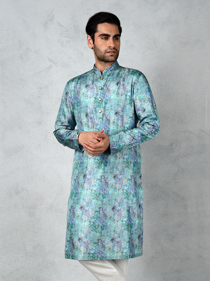 Details: Be the center of attention in every room with this scintillating aqua blue design by TULA. This regular-fit kurta is fabricated from tussar silk that delivers ultimate comfort along with luster. Featuring a mandarin collar, full sleeves, and white pearl buttons along with off-white aligarhi, this kurta set is an absolute must-have. Tag this monochromatic calico-printed kurta with a pair of mojris for festive occasions.