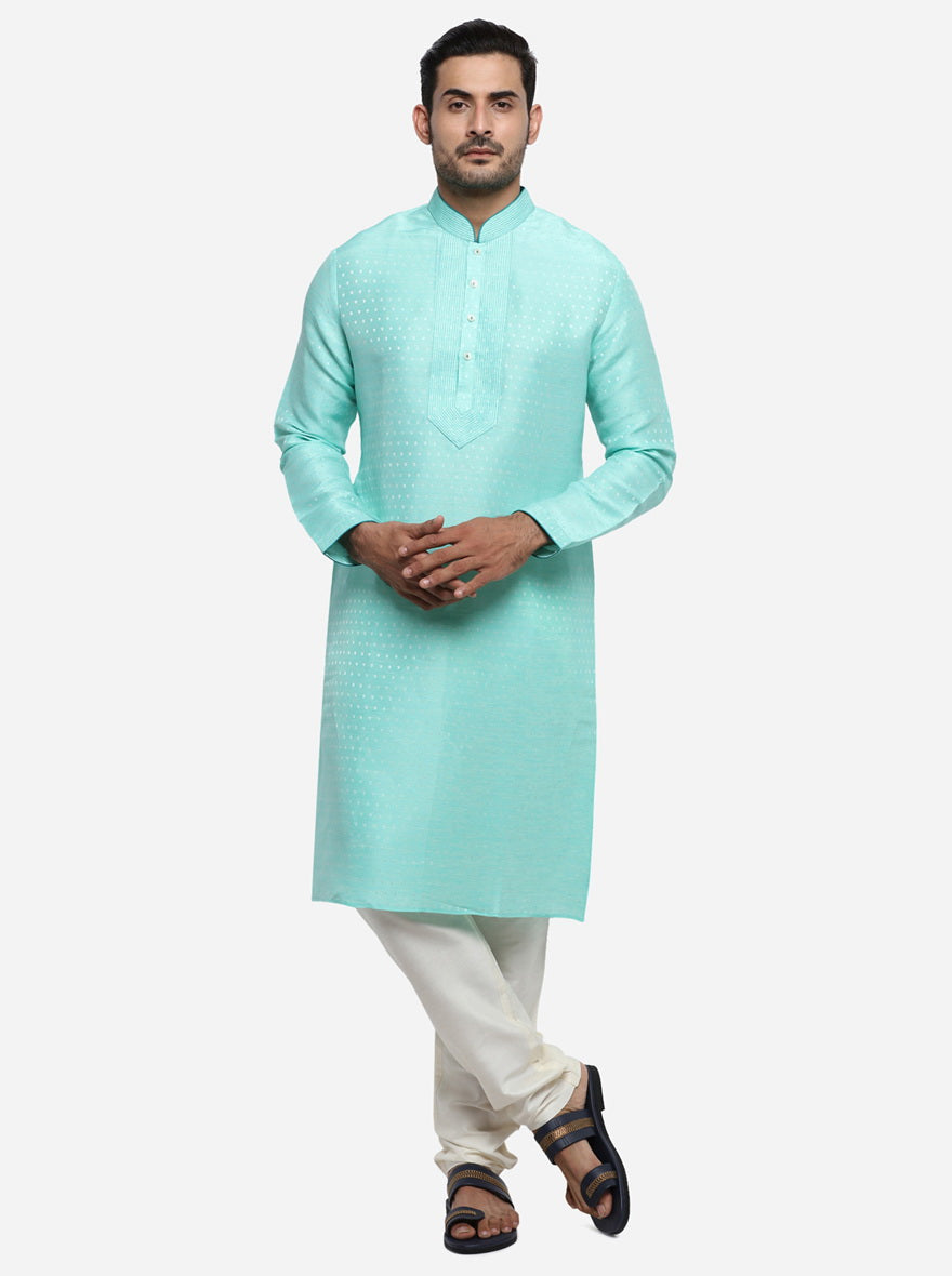 Details: Dress up in this super classy Self Textured Aqua Green KURTA SET Add a stylish edge to your ethnic wear collection by opting for this Self Textured Aqua Green KURTA SET This piece is stitched with basic features and lets you stay fashionable and comfortable all day long. Made to perfection, this KURTA SET is styled with basic features and offers all-day comfort. Own it. JadeBlue launches super comfortable for men's bottom wear they come tag less for additional comfort. This regular Silk Blend is super comfortable. It is a great wear for an all-day outing. Stay comfy in our super soft Men's bottom wear.