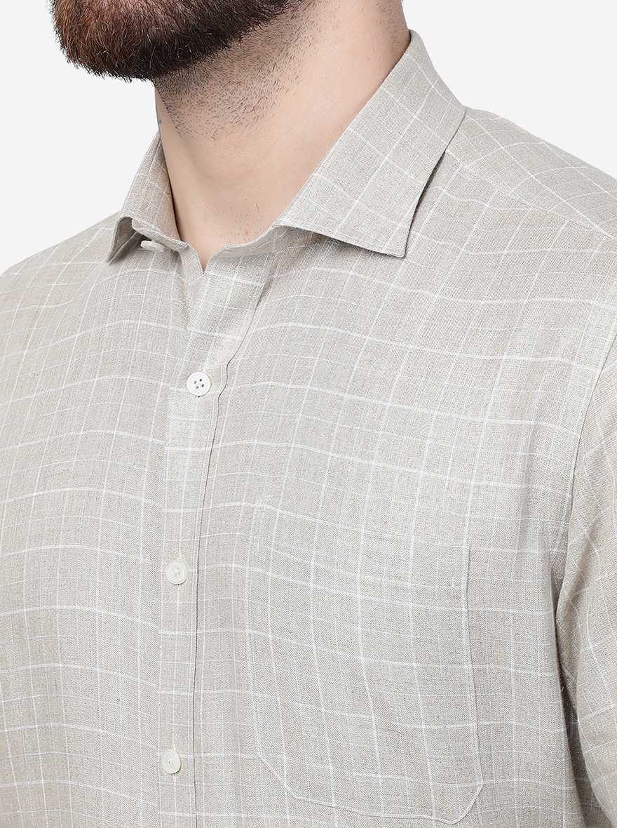 Details: This Beige Linen Formal Shirt from JadeBlue is popular among youth. Built with Linen fabric ensuring comfort and breathability all day. Offers a Regular fit for a comfortable look that has been elevated with a checked pattern. Features with a chest pocket, full sleeves, and a Regular shirt collar. Match it with the well-fitted trousers of your choice and a pair of oxford shoes and you are ready to go.