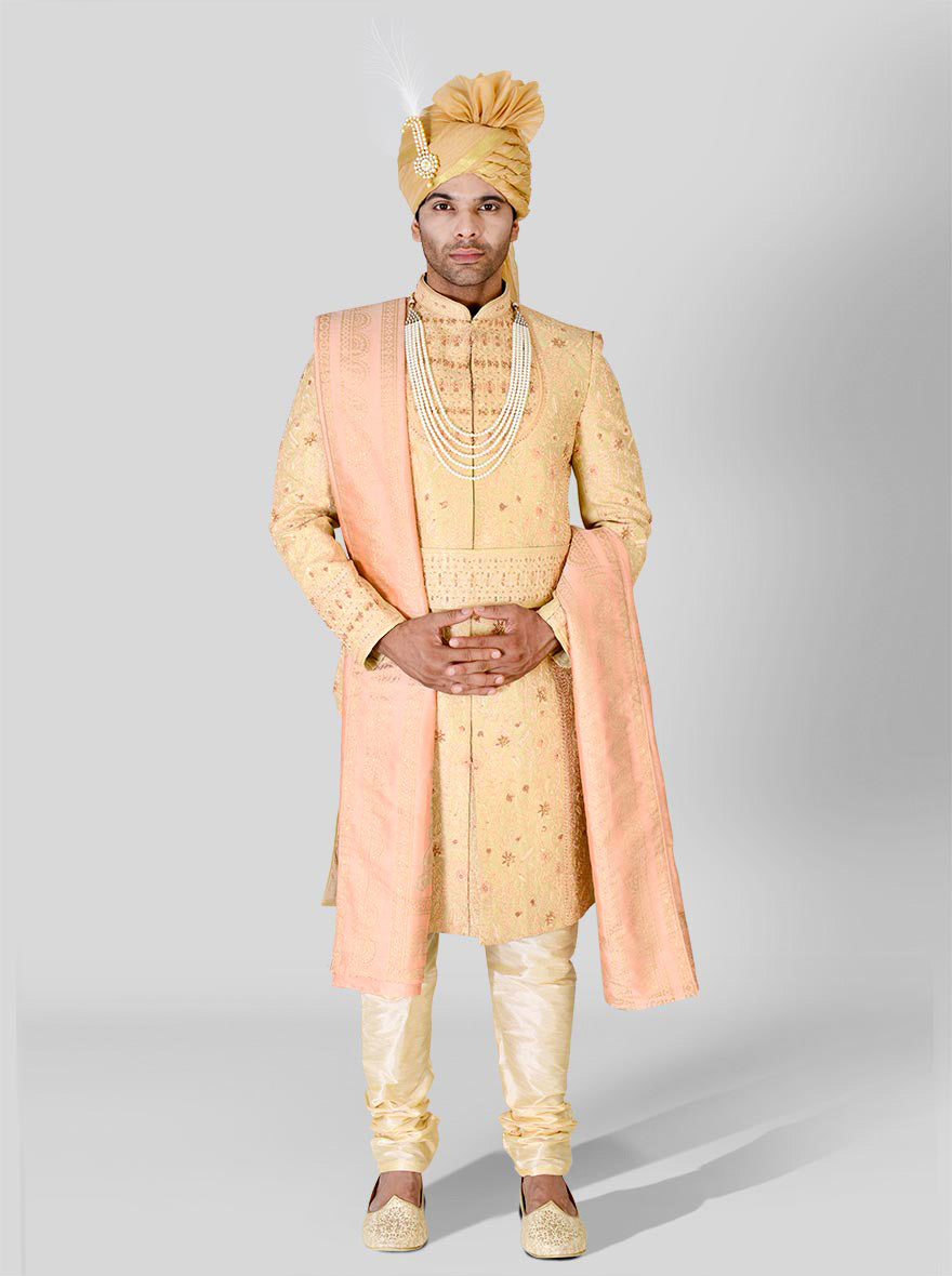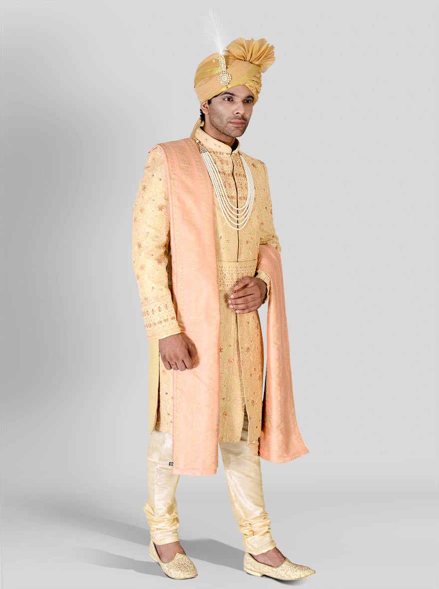 Style Tip: This regular fit ethnic wear is styled with golden churidar, saafa, khes, neckpiece and kalangi. Achieve a fashion-forward look by clubbing it with light peach churidar and suede loafers. Best suitable for wedding days.