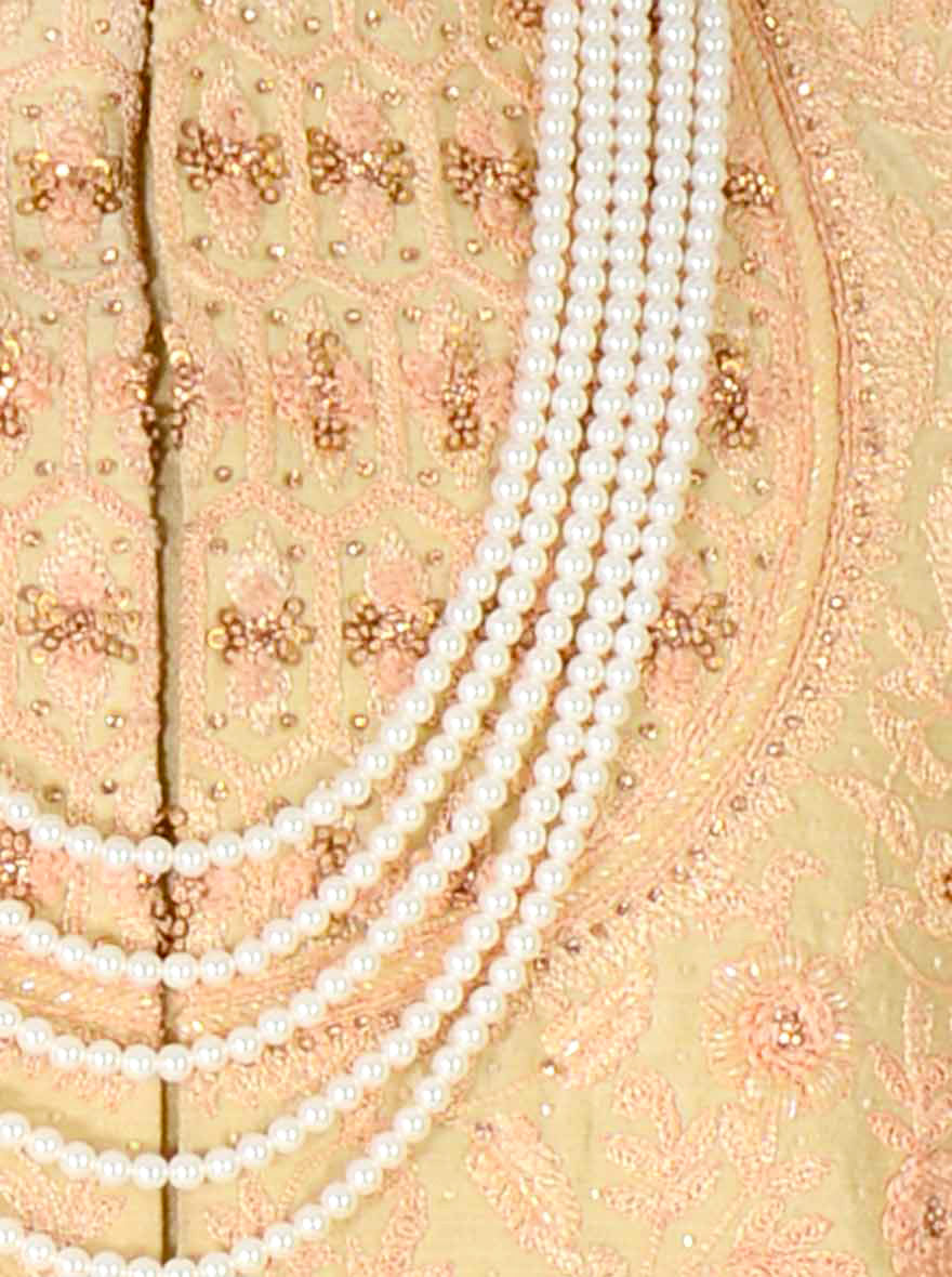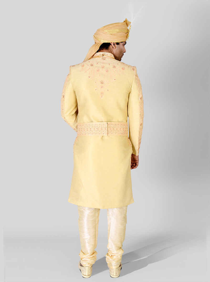 Details: This fashionable beige and golden sherwani from Azania will prove to be a fashionable affair. It is made from silk fabric and features mandarin collar and side slits. This piece is a must-have in your wardrobe.