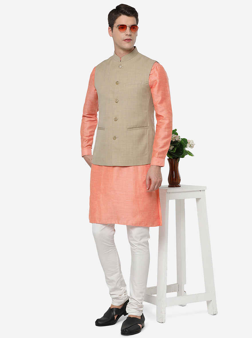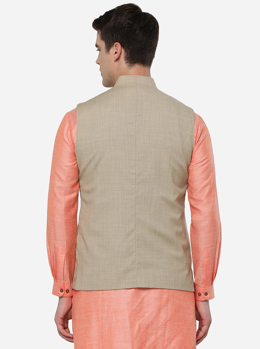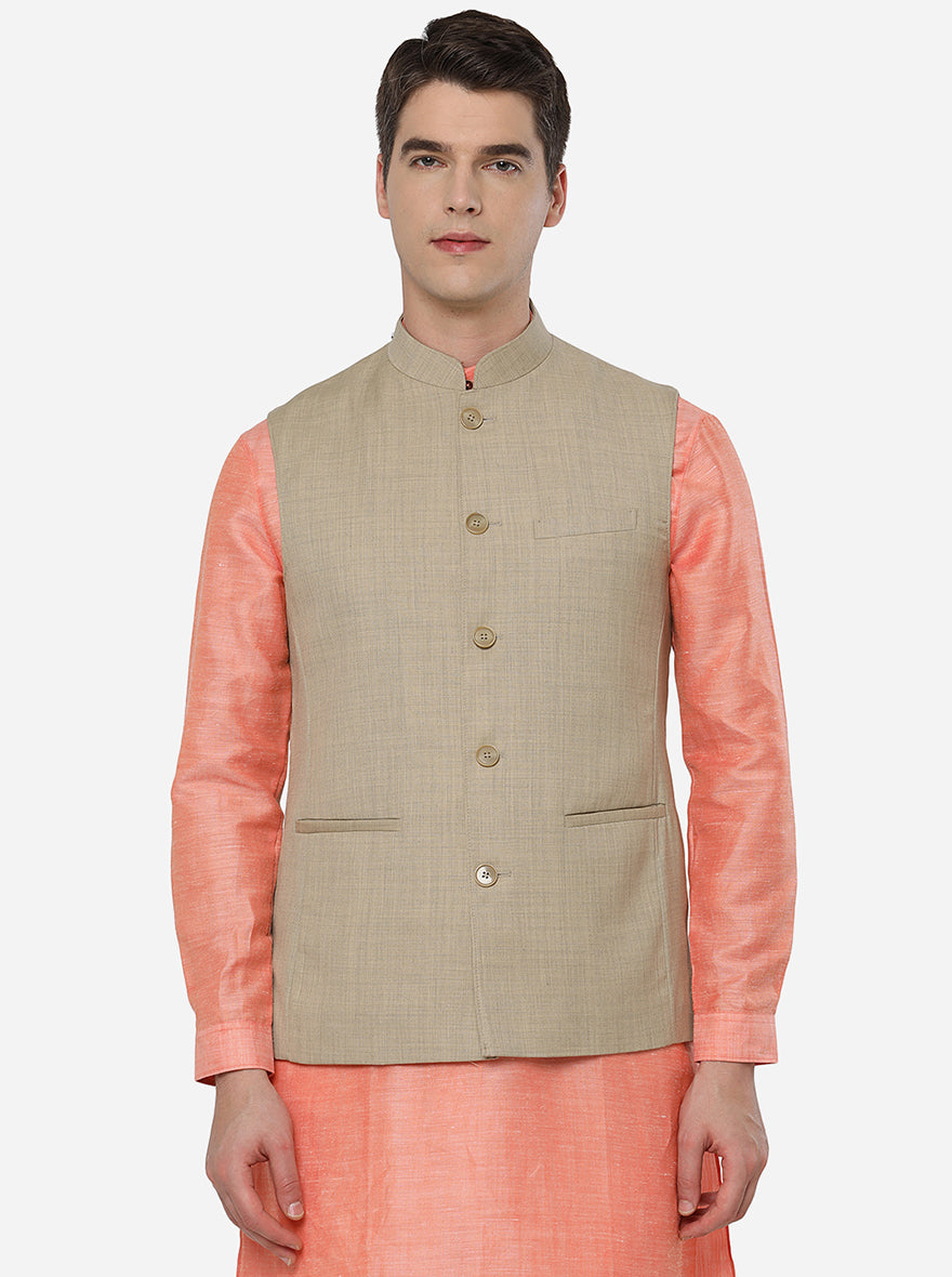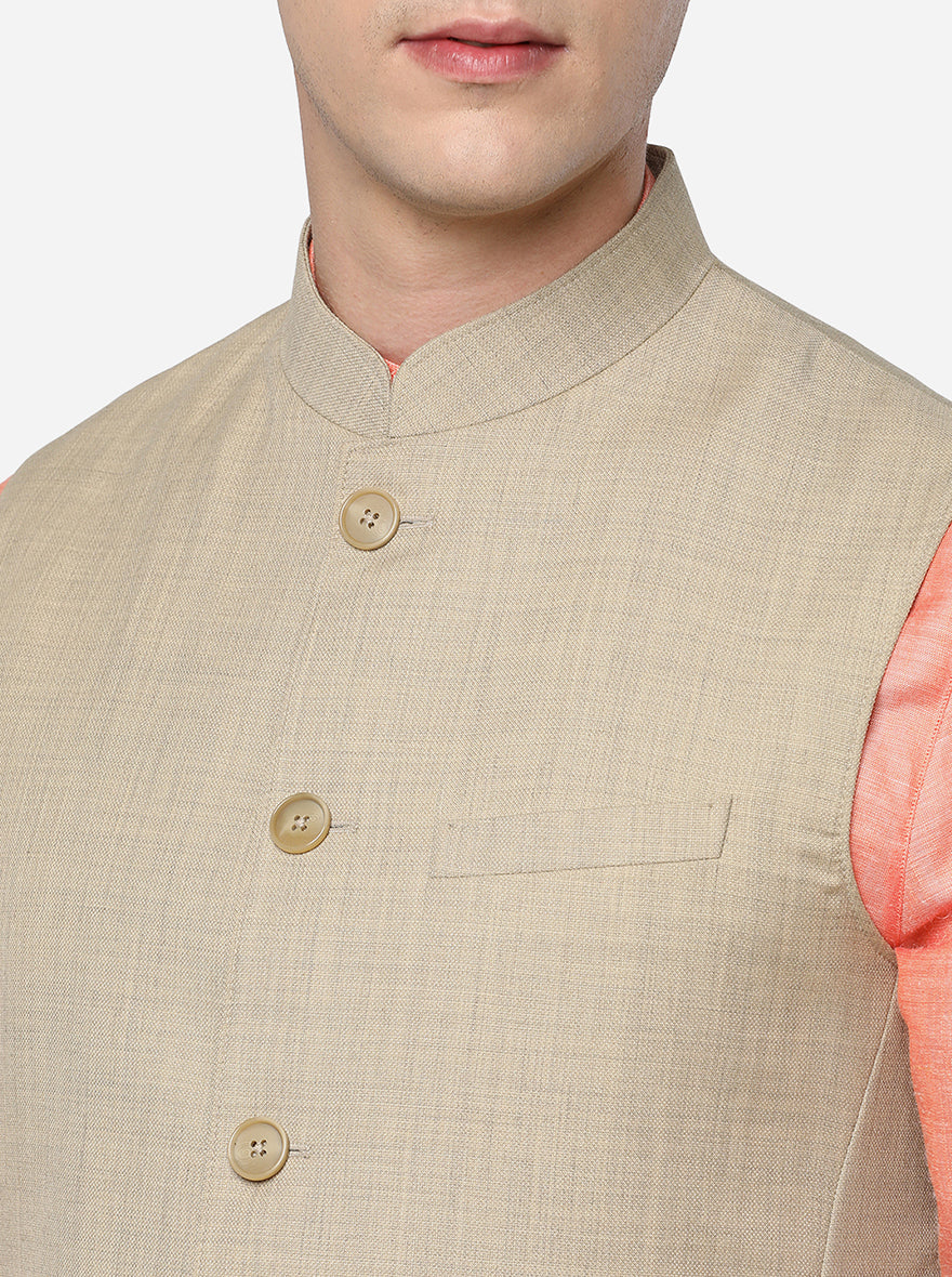 Details: Up your formal look in a snap by donning this self textured beige modi jacket designed by JadeBlue. This regular fit jacket is tailored to precision by skin-friendly poly wool fabric, which is easy on your skin and offers you great wearing comfort from morning to night. This outerwear has certain features like mandarin collar, front buttons placket, short side slits, 1 chest pocket and 2 bottom welt pockets, which adds a meaningful touch. When styled over a light orange modi kurta, white churidar and suede loafers, it will bestow you with a fabulous traditional look.