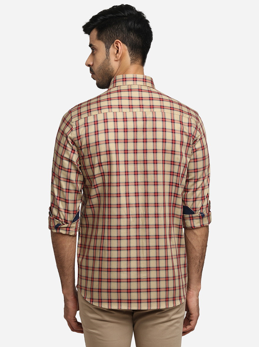 Beige & Red Checked Slim Fit Formal Shirt | Greenfibre
