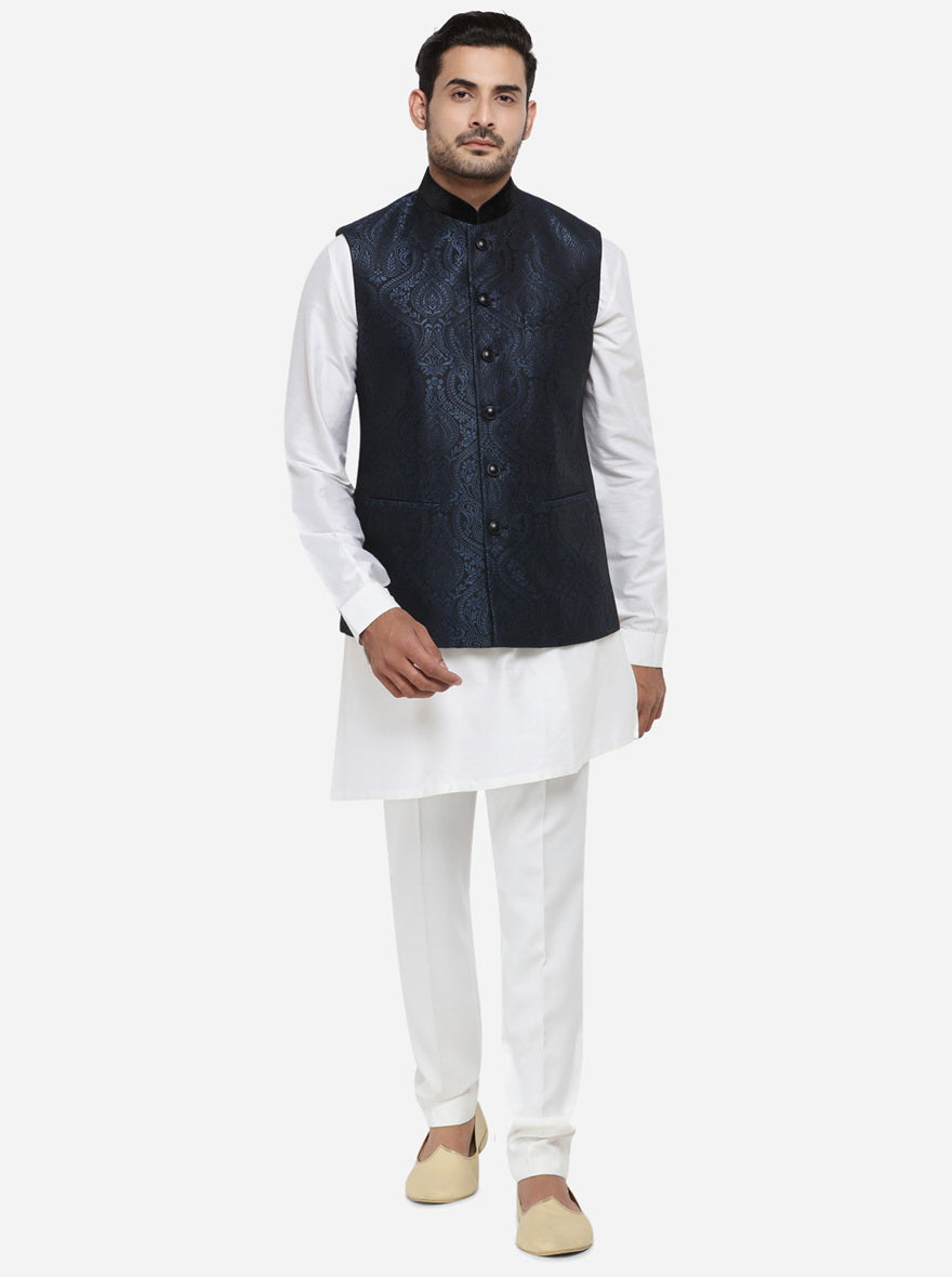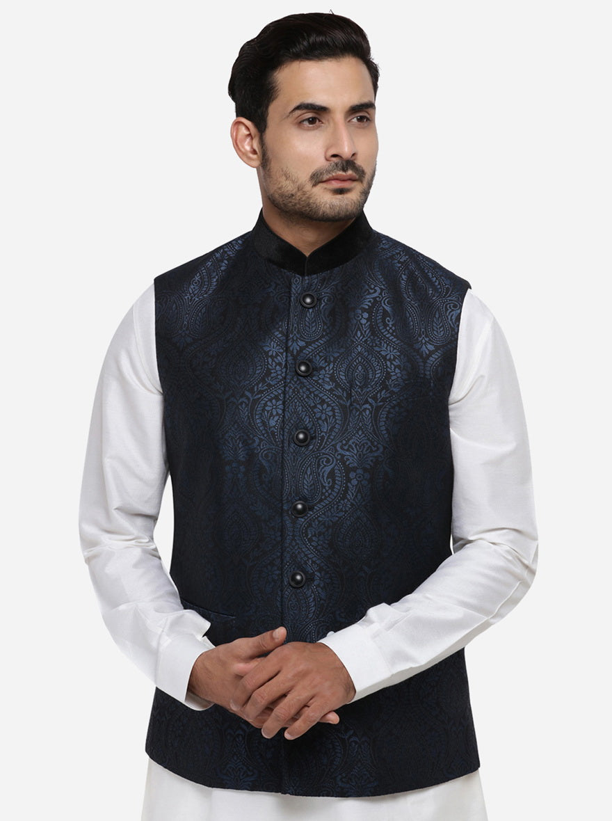 Details: Get admired for your distinct taste in waistcoats by opting for this Self Design Black & Blue Jacquard men's waistcoat, this stunning piece features 3 pockets, mandarin collar and side slits. This men's waistcoat by JadeBlue will make heads turn wherever you go. Made from quality JacquardComplete the look with a plain shirt, matching trousers and your favorite accessory for a sharp look that's sure to impress at any event. Standout from the crowd! Tailored to offer extreme comfort.