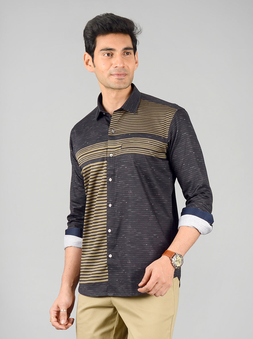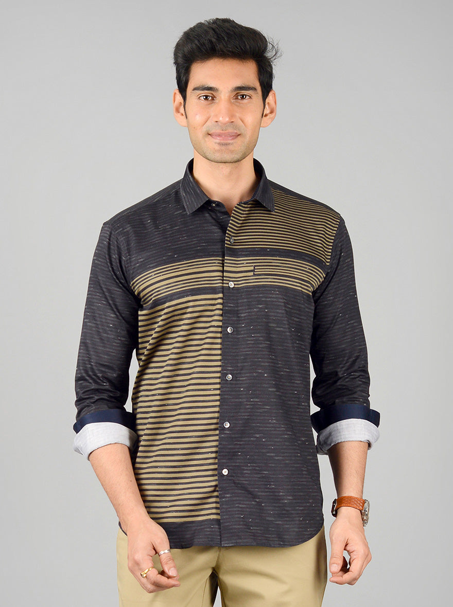 Details: This black and green party wear shirt from the house of JB Studio will let you make a grand entry at any evening party. Made from premium cotton fabric, this striped shirt features shirt collar, full sleeves and front buttons closure.