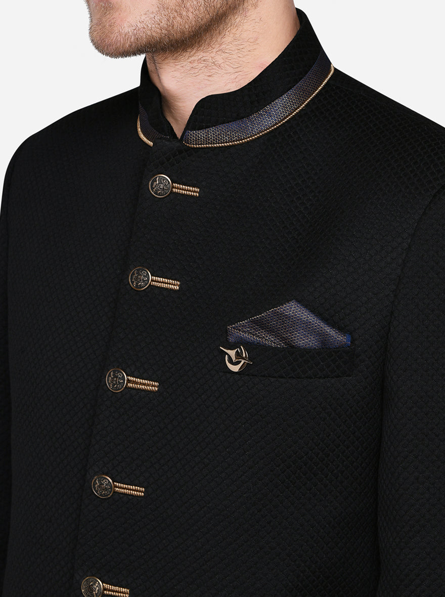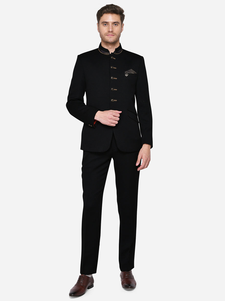 Details: Dress up in this super classy Self Textured Black Embossed JODHPURI SUIT Add a stylish edge to your ethnic wear collection by opting for this Self Textured Black JODHPURI SUIT This piece is stitched with basic features and lets you stay fashionable and comfortable all day long. Made to perfection, this JODHPURI SUIT is styled with basic features and offers all-day comfort. Own it. JadeBlue launches super comfortable for men's bottom wear, they come tag less for additional comfort. This regular Embossed bottom wear offers a relaxed fit and is super comfortable. It is a great wear for an all-day outing. Stay comfy in our super soft Men's bottom wear.