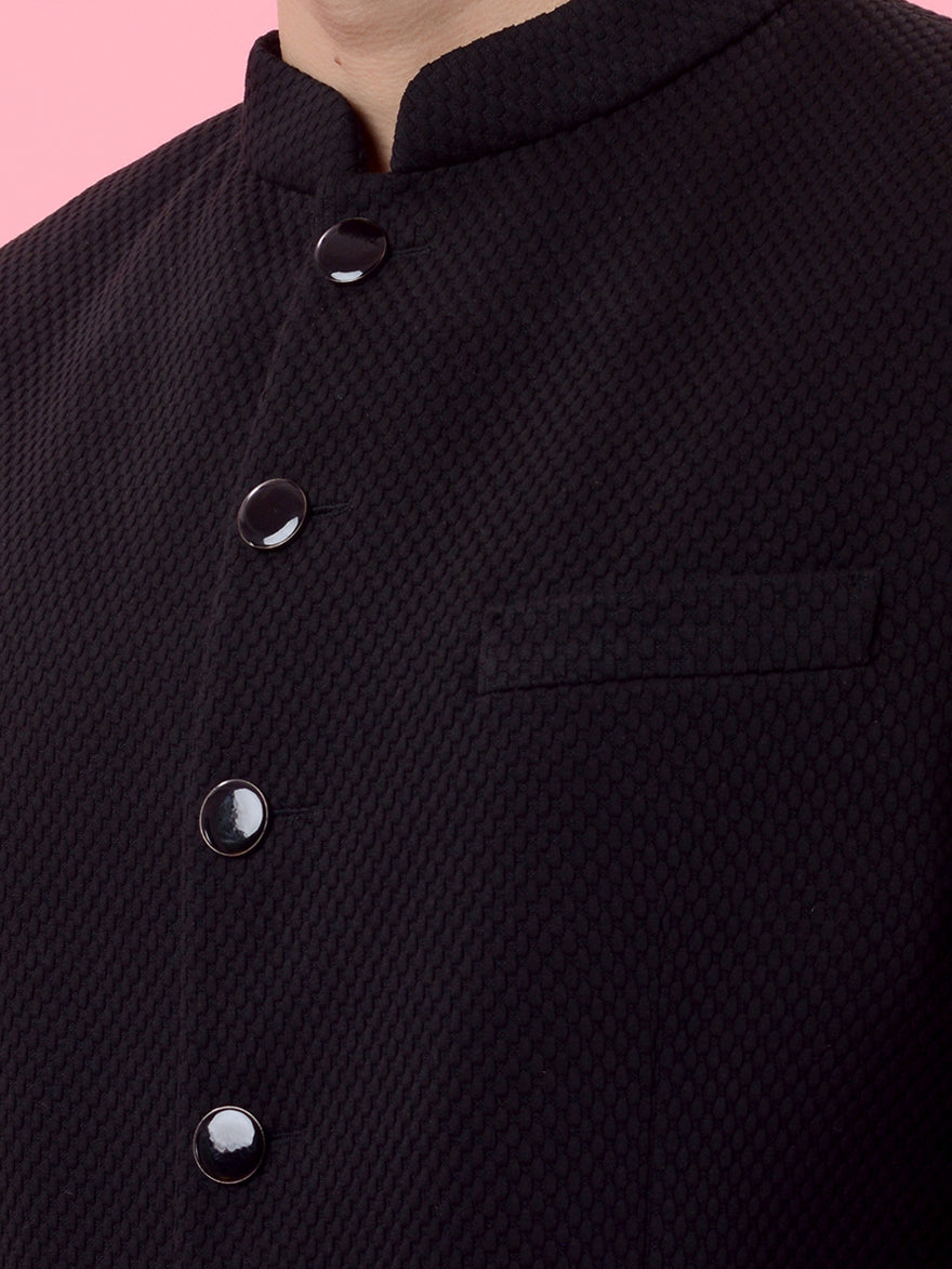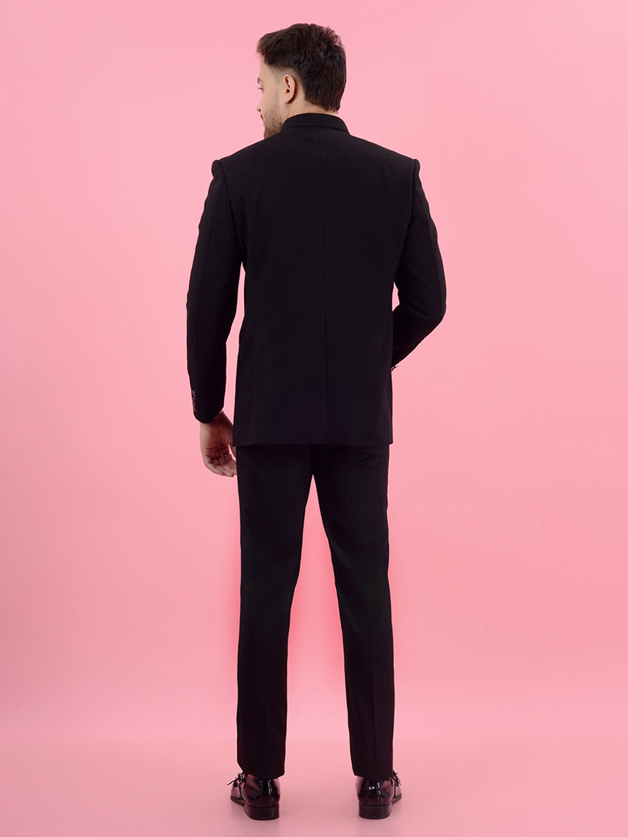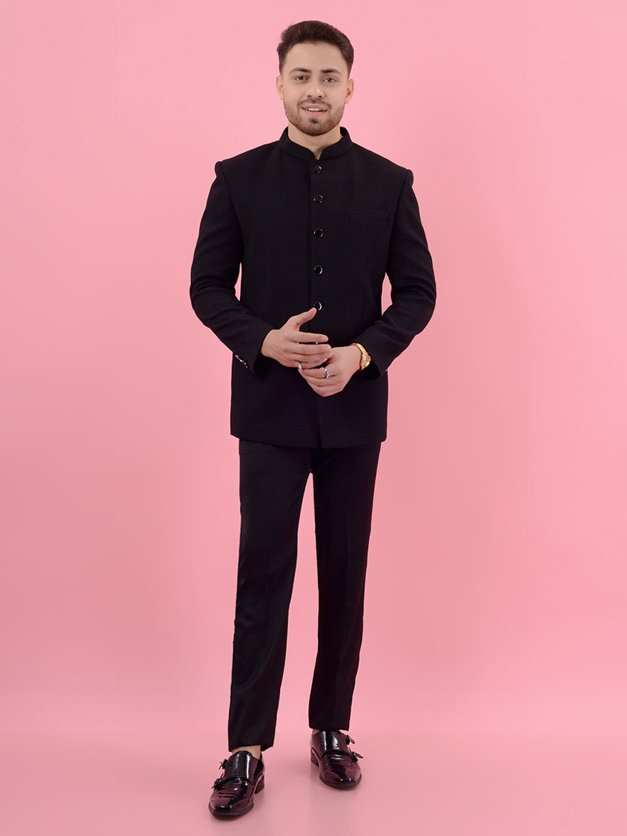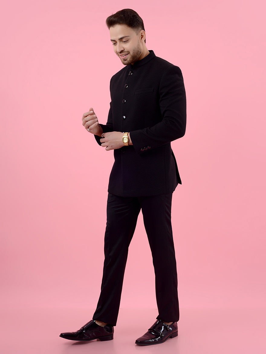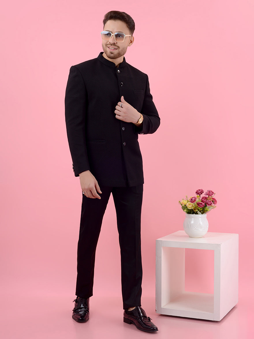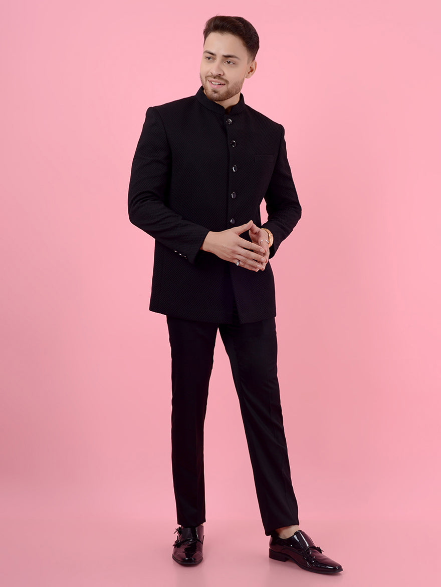 Details: Elevate your style with TULA's Men's Jodhpuri Suit, a perfect blend of tradition and modernity. Crafted from premium Jacquard fabric in a sleek black color, this suit features a classic, straight cut for a timeless look. The self-design pattern adds a touch of sophistication, while the mandarin collar brings a hint of cultural flair to your outfit. Designed for comfort and style, the regular fit suit is perfect for your friend's reception or any special occasion. With full sleeves for a polished appearance, the TULA Jodhpuri Suit is sure to turn heads and leave a lasting impression. Upgrade your wardrobe with this elegant and refined ensemble from TULA, where style and quality meet seamlessly.