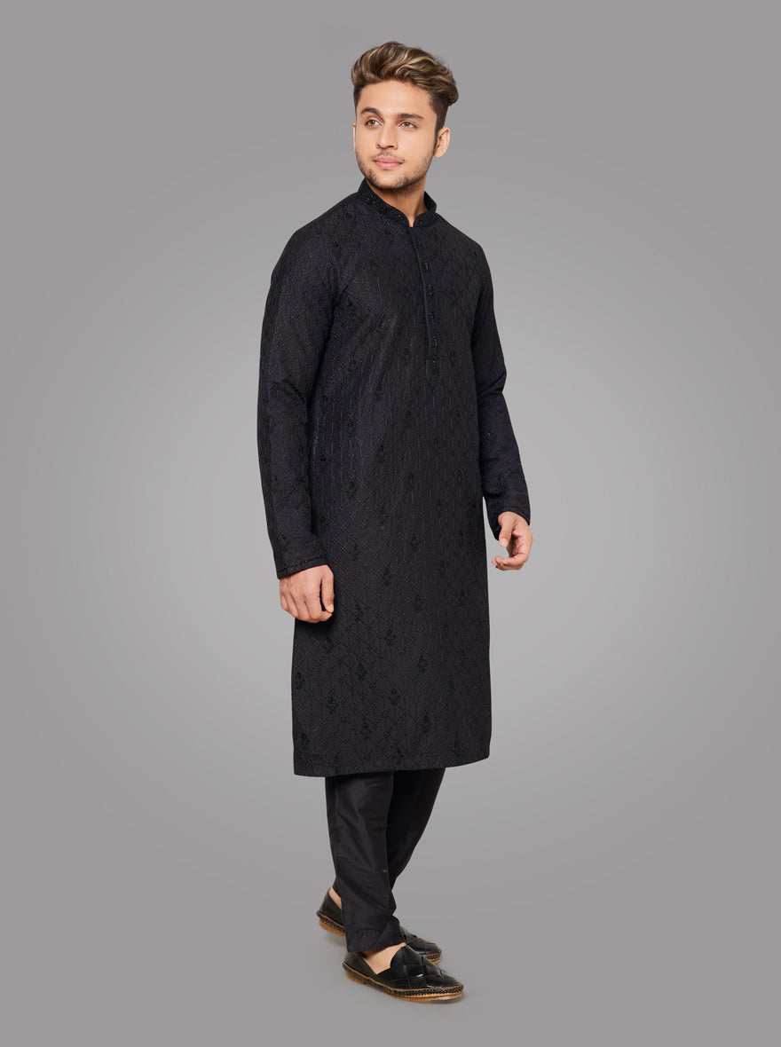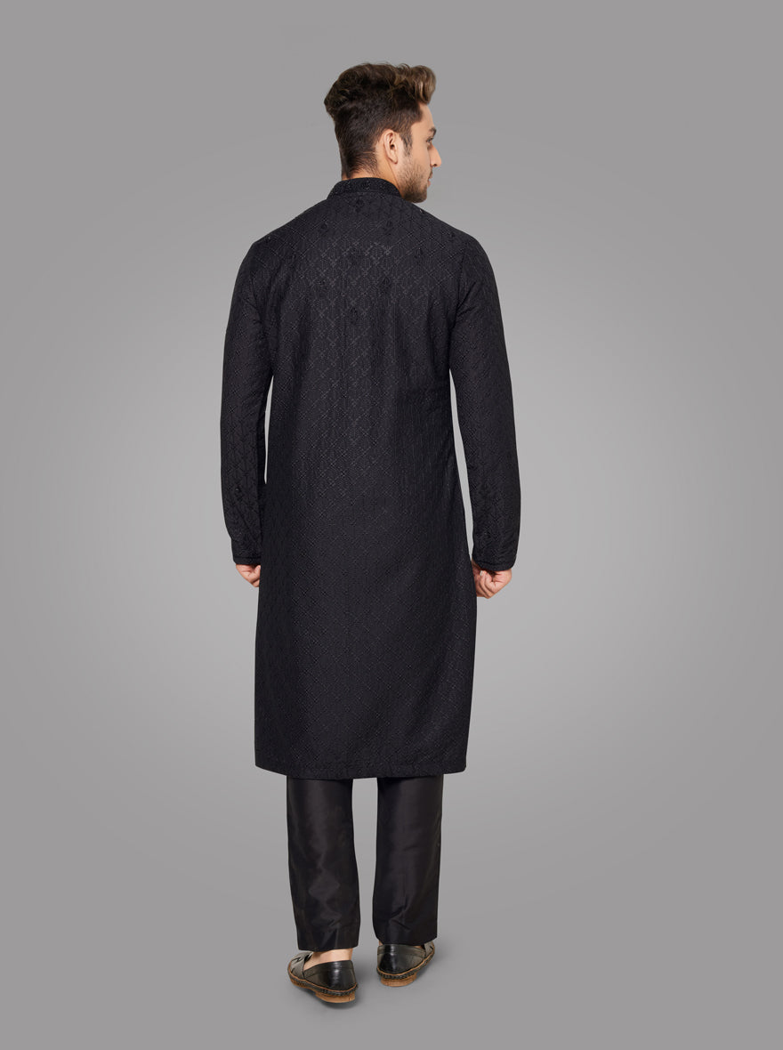 Details: Introducing the TULA Men's Silk Blend Embroidered Kurta Pyjama, a timeless ensemble that effortlessly combines traditional elegance with modern style. Crafted with meticulous attention to detail, this kurta pyjama set is designed to make you look and feel your best during pre-wedding functions and other special occasions. Made from a luxurious silk blend fabric, this kurta pyjama offers a perfect blend of comfort and sophistication. The regular fit ensures a relaxed yet polished look, allowing you to move with ease while exuding an aura of grace. The full sleeves provide coverage and add an extra touch of refinement to the overall design. Featuring exquisite embroidery work, including resham, beadwork, and cut dana, this kurta pyjama is a true testament to fine craftsmanship. The intricate detailing adds a rich texture and elevates the overall aesthetic, making it a standout piece in your ethnic wardrobe. The classic straight cut offers a timeless appeal, ensuring you make a lasting impression.