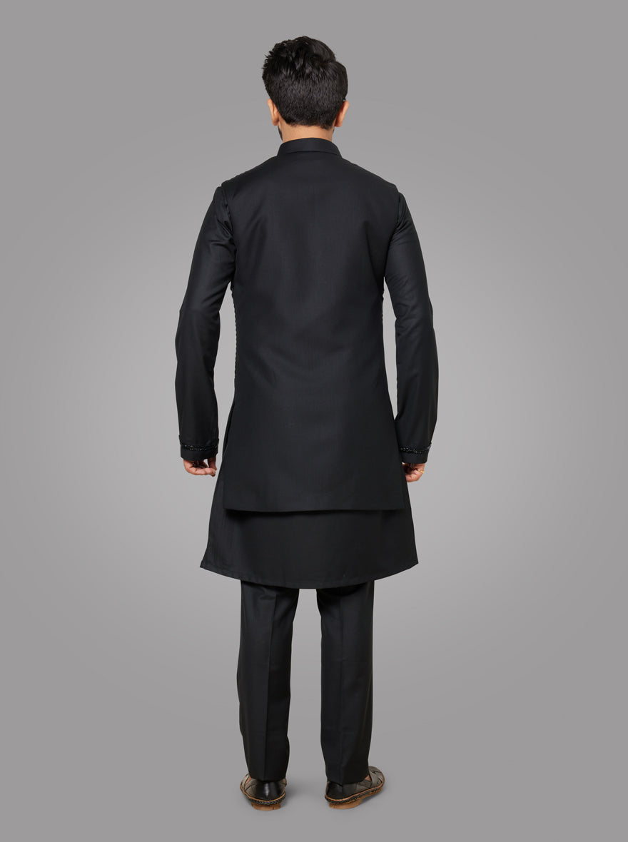 Details: Elevate your style quotient with the TULA Silk Blend Embroidered Kurta Set with Koti. This stunning ensemble is designed to make you stand out at your friend's sangeet ceremony. Crafted with care, this regular-fit kurta set offers a perfect blend of comfort and elegance. Made from a luxurious silk blend fabric, this kurta set showcases intricate embroidery, including cutdana, pearl work, and pin tux details. The embroidery adds a touch of sophistication and richness to the overall design. The full sleeves provide coverage while exuding gracefulness. Featuring a center-cut and a zipper opening straight cut, this kurta set ensures easy wearability without compromising on style. The koti, or jacket, adds an extra layer of charm and versatility to the outfit. You can wear it open or closed, depending on your preference. The black color of this kurta set is a timeless choice that exudes class and elegance. It complements various skin tones and can be accessorized with statement jewelry for a complete look. The regular collar type adds a touch of modernity, making it suitable for both formal and semi-formal occasions.