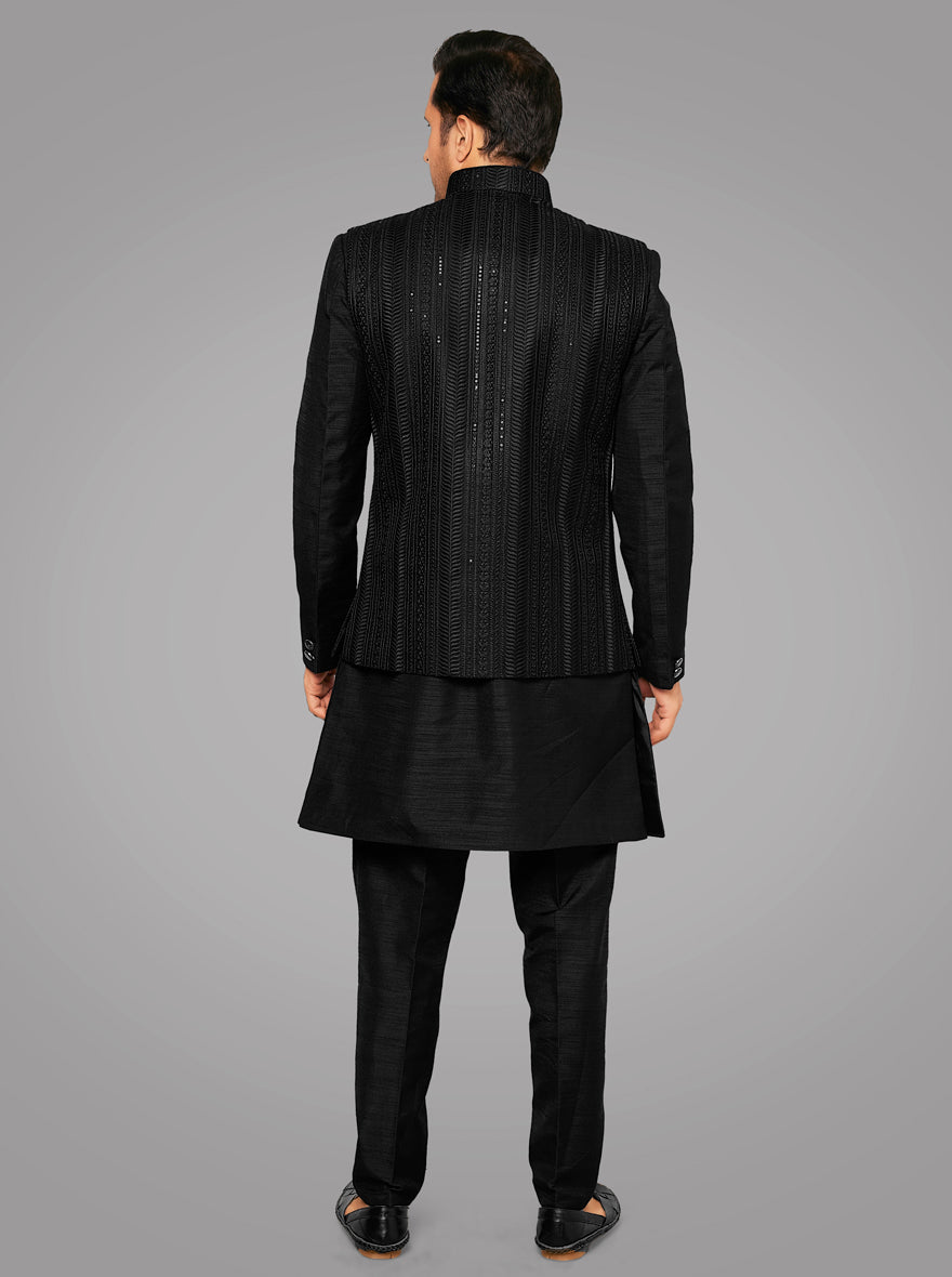 Details: This Black Kurta Set With Koti from TULA is a perfect for sangeet performance . Fabricated with Silk Blend fabric for a clean and sophisticated look. Features buttons for closure on Kurta. Offers a Straight fit for Kurta, Pyjama, and Koti with Straight Cut, embroidery along with pyjama. Perfect for the festive seasons. Compliment the look with an Aligarhi.