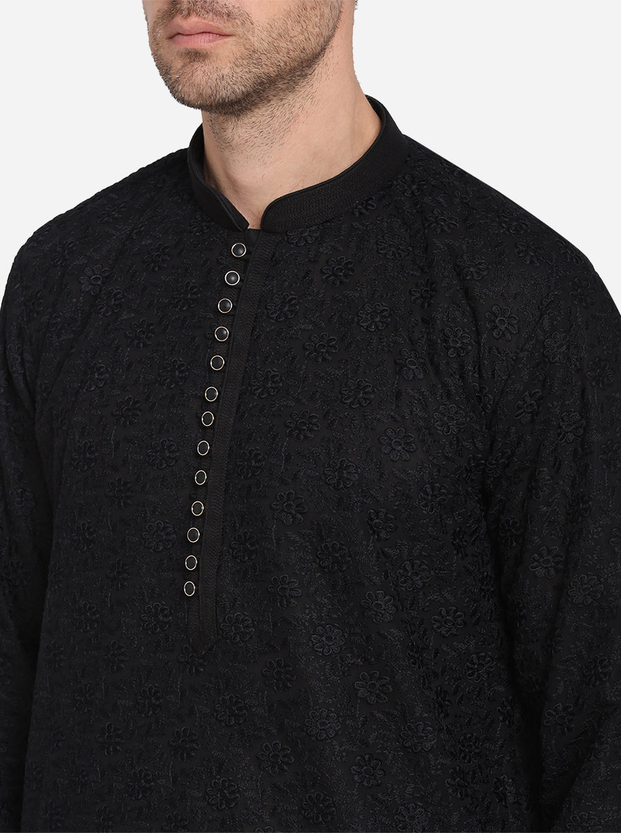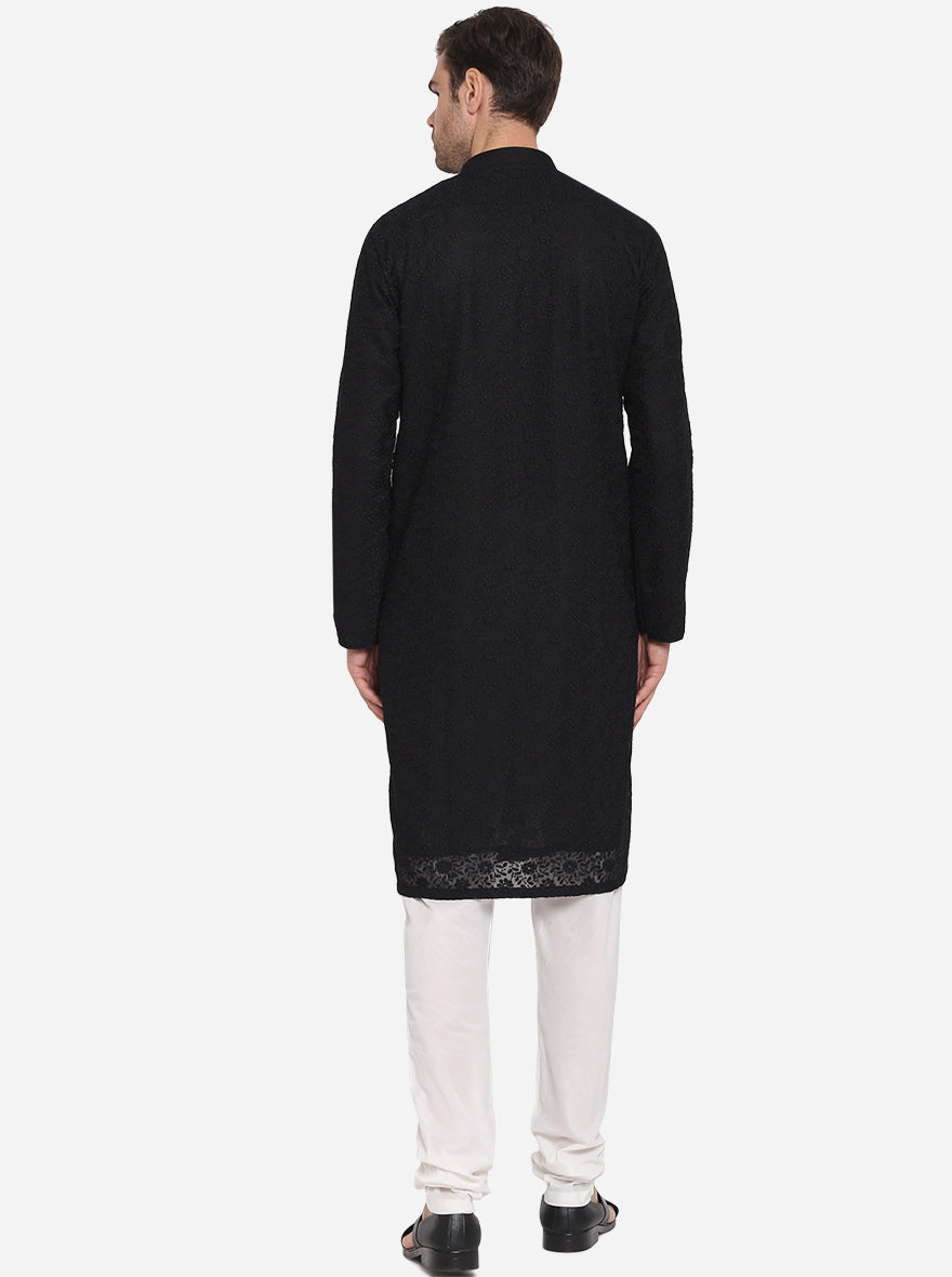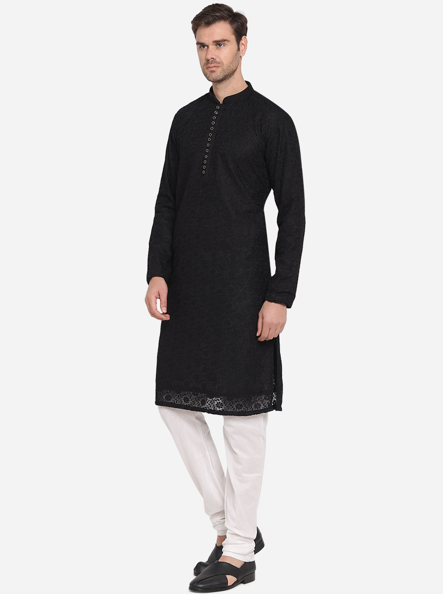 Details: Smart, stylish and comfortable is this Black Kurta Set from the brand Azania. It features a mandarin collar and has full-sleeves. Adorned with a Lucknowi Embroidery Pattern that makes up for an elegant choice. Comes with side slits on both sides. Crafted with rich Georgette that assures you a luxurious touch and a comfort like no other. Perfect for festive wear or formal parties. Offers a regular fit. Team it with a pair of juttis to achieve the desired look.