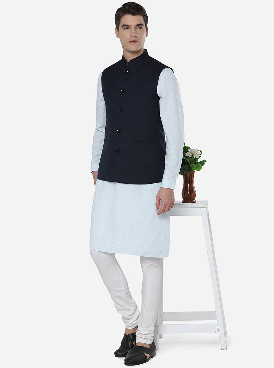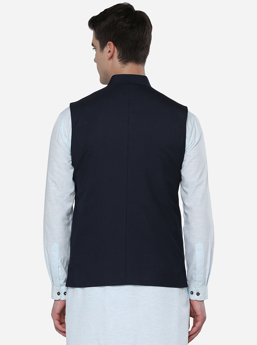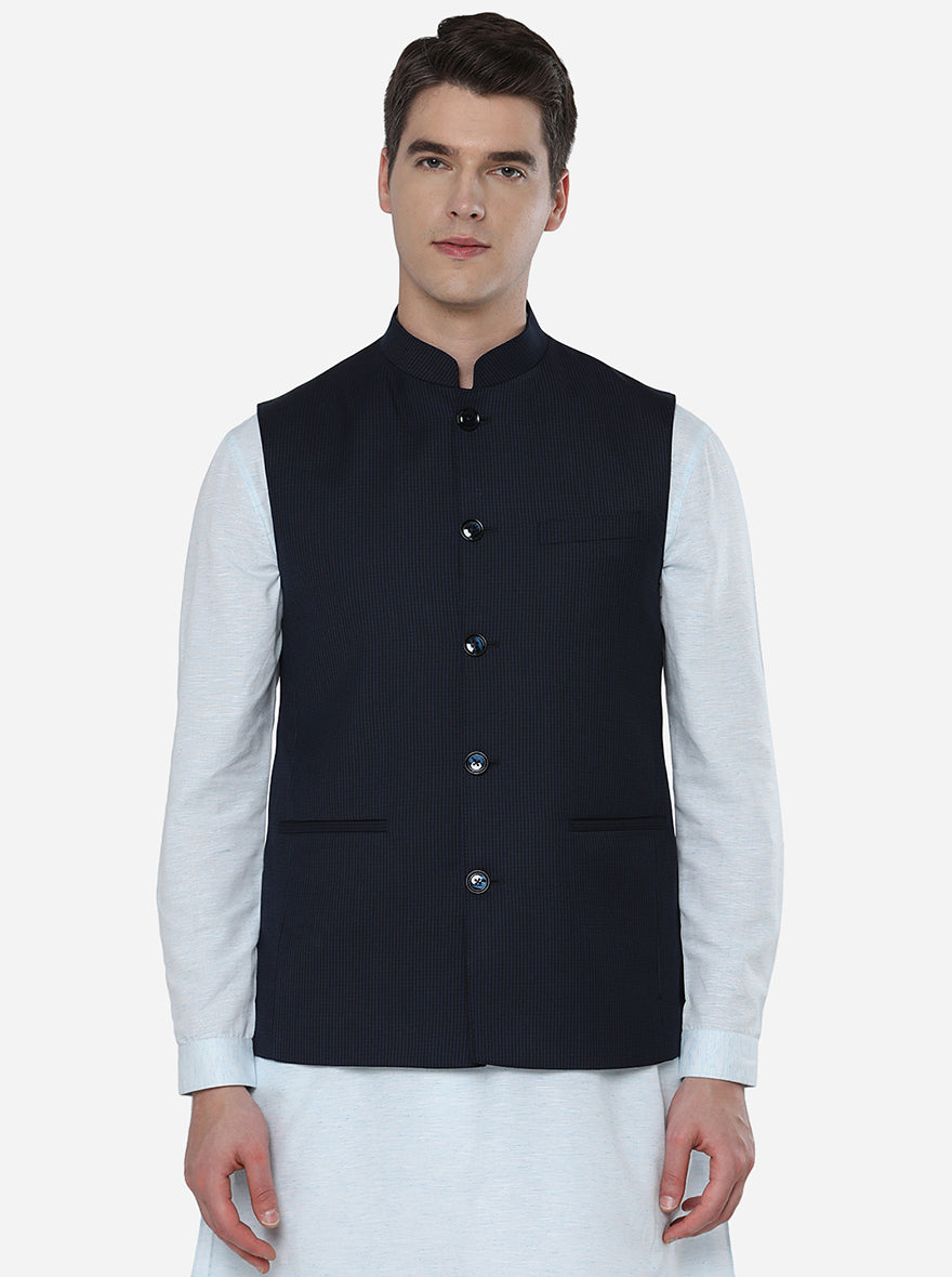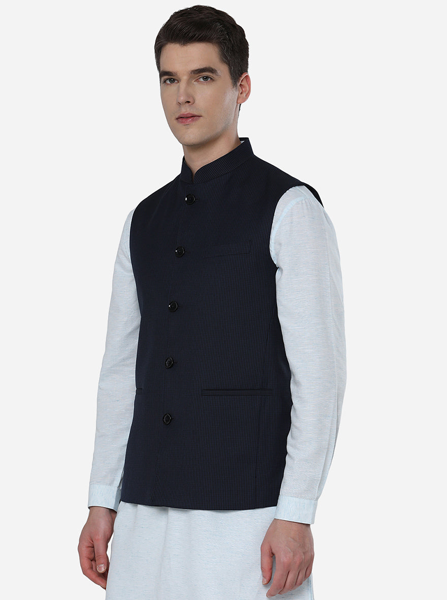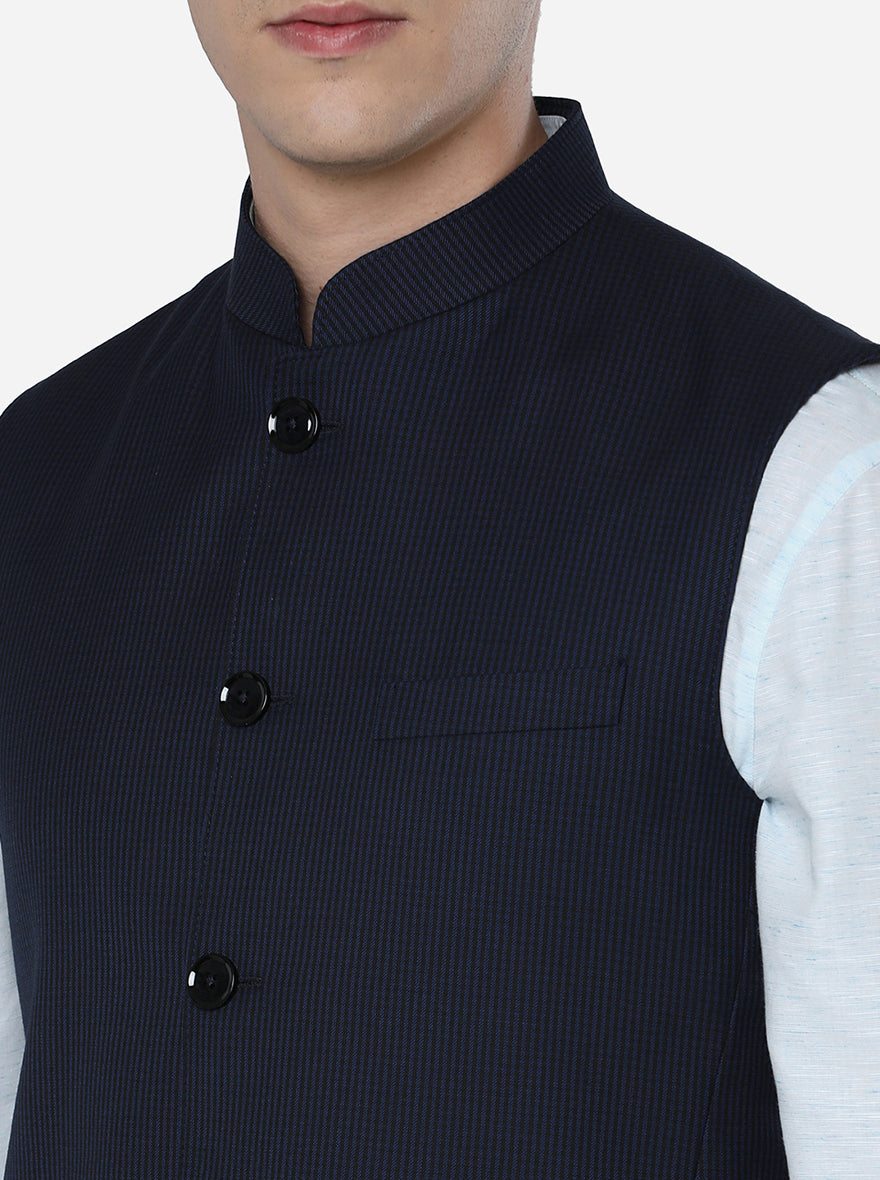 Details: Elevate your formal look in a distinct way by wearing this striped black modi jacket by JadeBlue. This regular fit jacket is made from good quality of poly wool fabric, which is high on comfort factor. This jacket is tailored to precision by including features like mandarin collar, front buttons placket, short side slits, 1 chest pocket and 2 bottom welt pockets, which adds it a functional touch. Wear this jacket with white modi kurta, churidar and suede loafers for fashion-forward look. Invest in this wardrobe staple now!