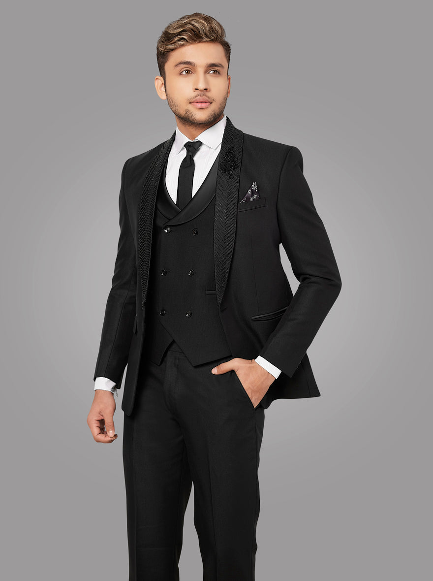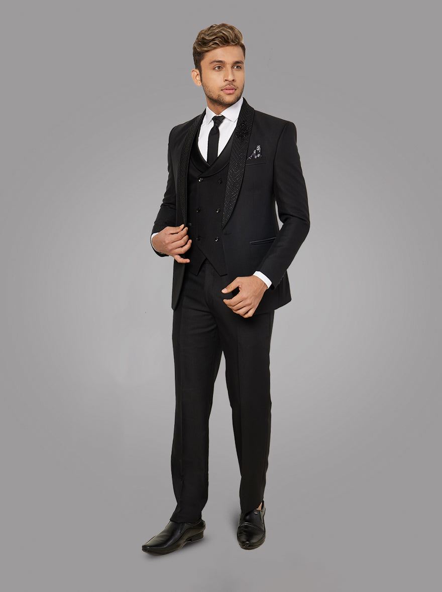 Details: This Black Suit from the latest collection of JadeBlue is the most loved piece of this season. Crafted with premium Terry Rayon Fabric that gives formal and partywear look as well as is comfortable. Featuring one button for closure along with three pockets on blazer and white shirt & vest. Embroidery on the Blazer. Offers a classic fit for a look with a peak lapel collar. Perfect for Formal Dinner and other occasions.