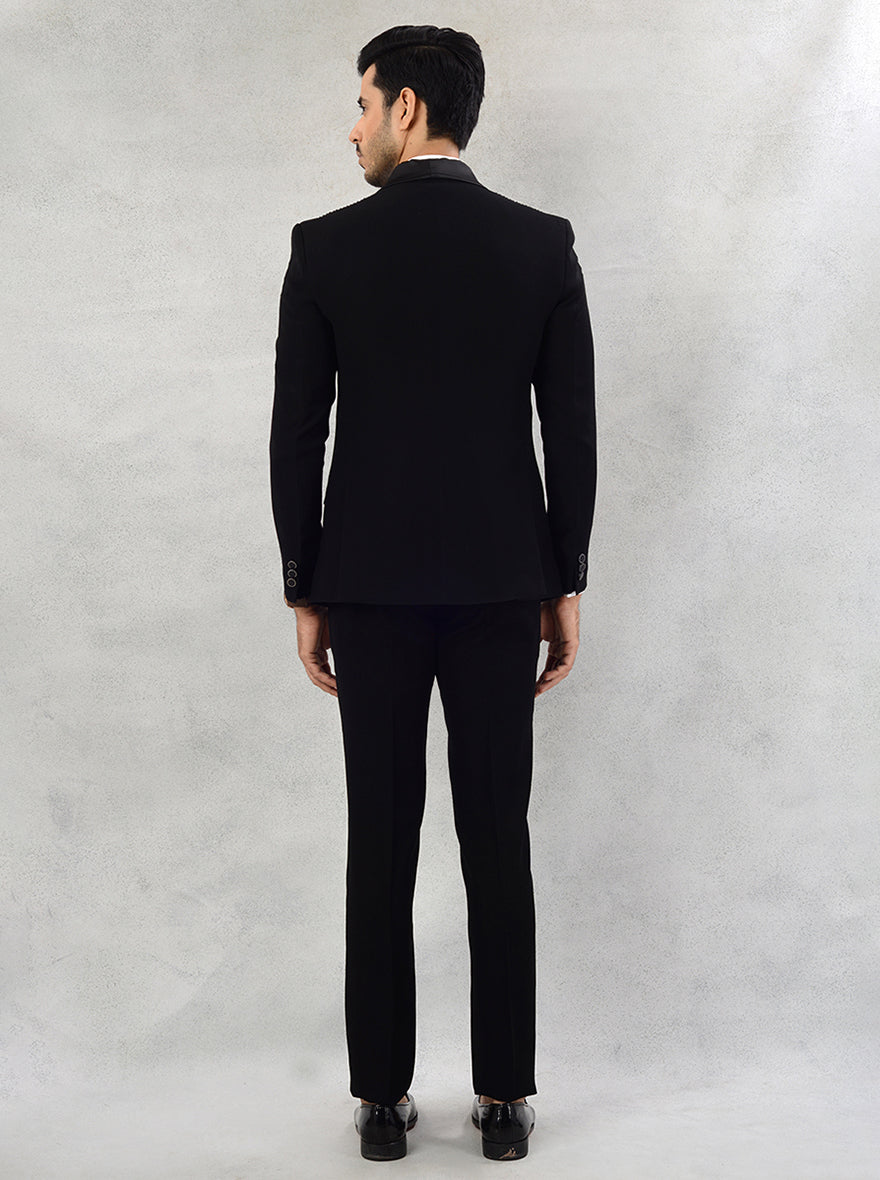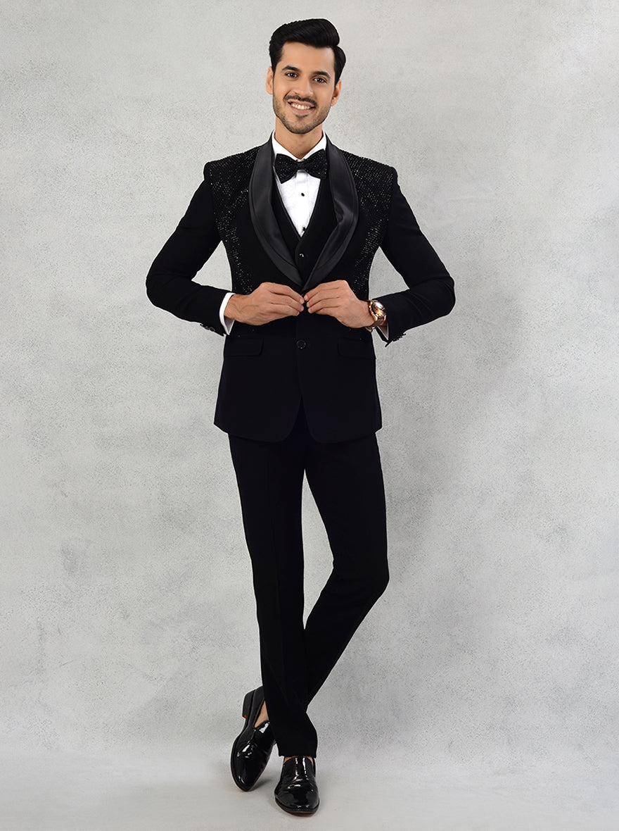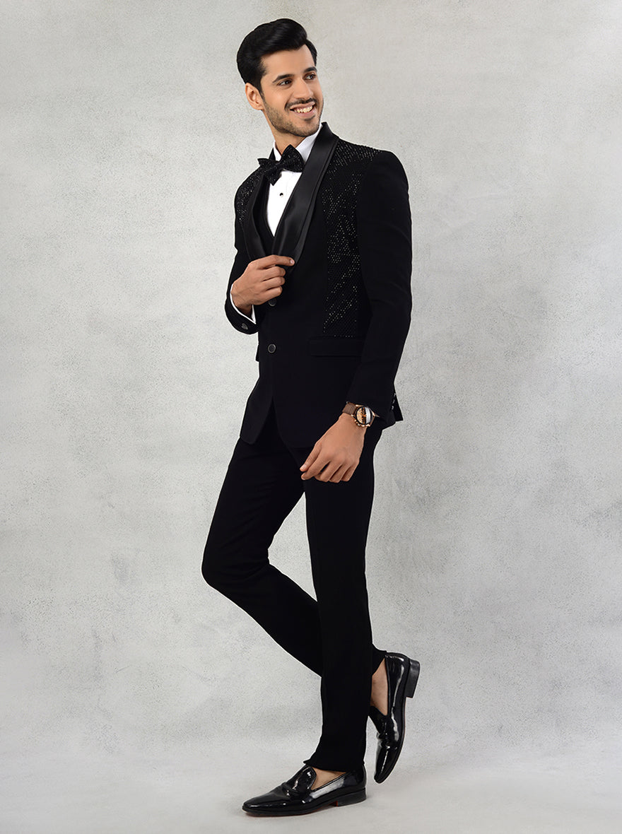 Details: Introducing the epitome of timeless sophistication - JadeBlue's Black Embroidered Suit. Immerse yourself in the world of luxury and refinement with this meticulously crafted ensemble. Made from Sun Silk fabric, our suit exudes opulence and ensures utmost comfort, making you feel like a true gentleman at any occasion. The intricate embroidery detailing, featuring dori and diamond embroidery, adds a touch of regality to the suit, making you stand out effortlessly. The shawl lapel, 2-button design, and straight cut enhance your silhouette, exuding confidence and charm with every step you take. Perfect for receptions and musical nights, this Black Embroidered Suit becomes your ultimate style statement. The versatile color effortlessly complements any skin tone and the subtle yet captivating embroidery elevates your fashion sense to new heights. At JadeBlue, we understand that the right attire can make or break your confidence, which is why we go above and beyond to create pieces that not only exude sophistication but also boost your self-assurance. Step into the world of classic elegance with JadeBlue's Black Embroidered Suit and experience the perfect blend of style, comfort, and luxury.