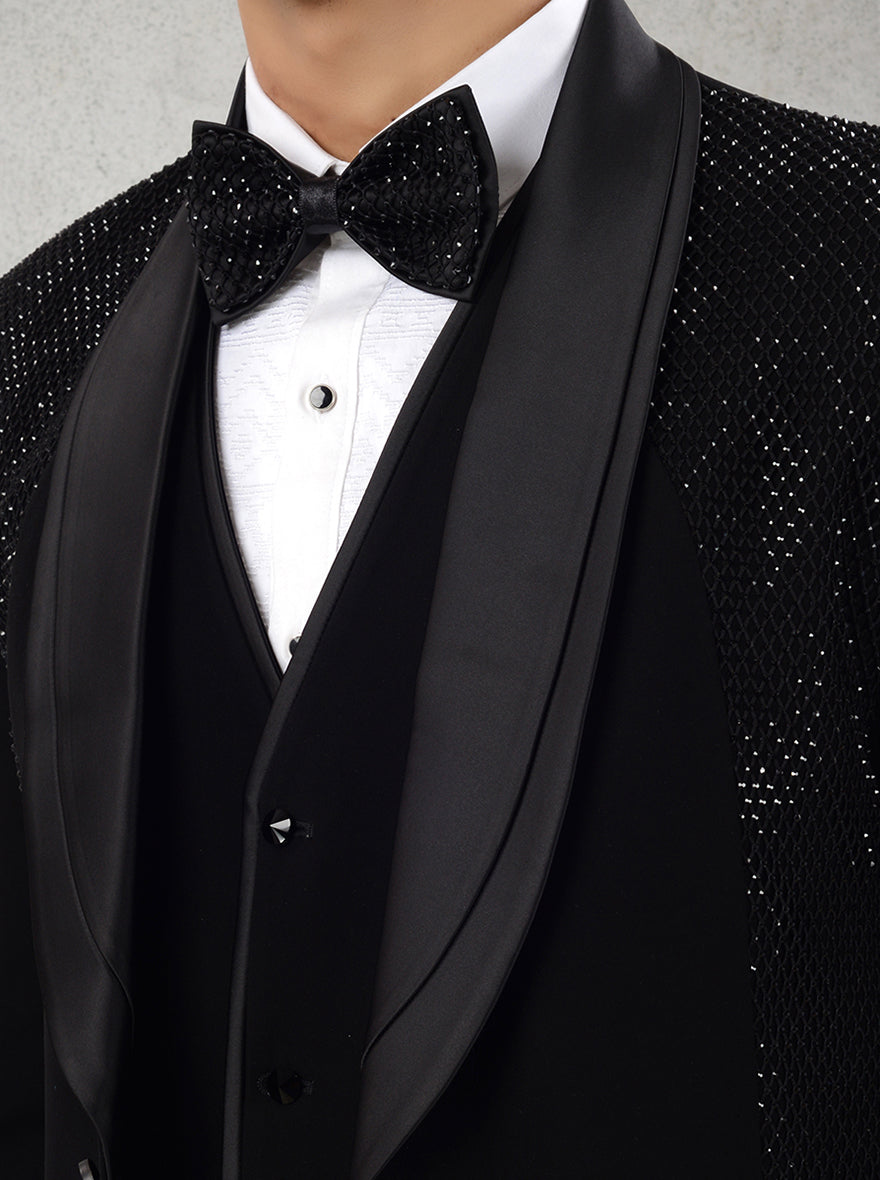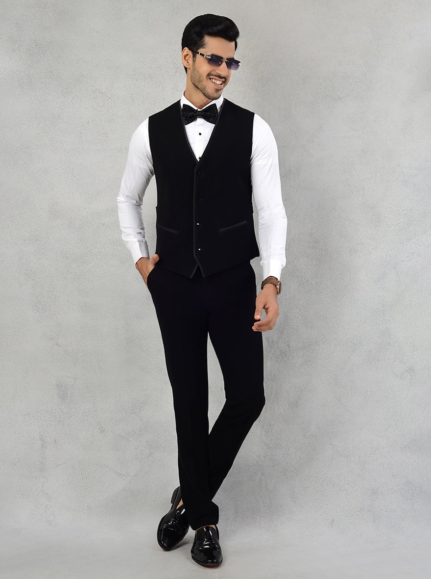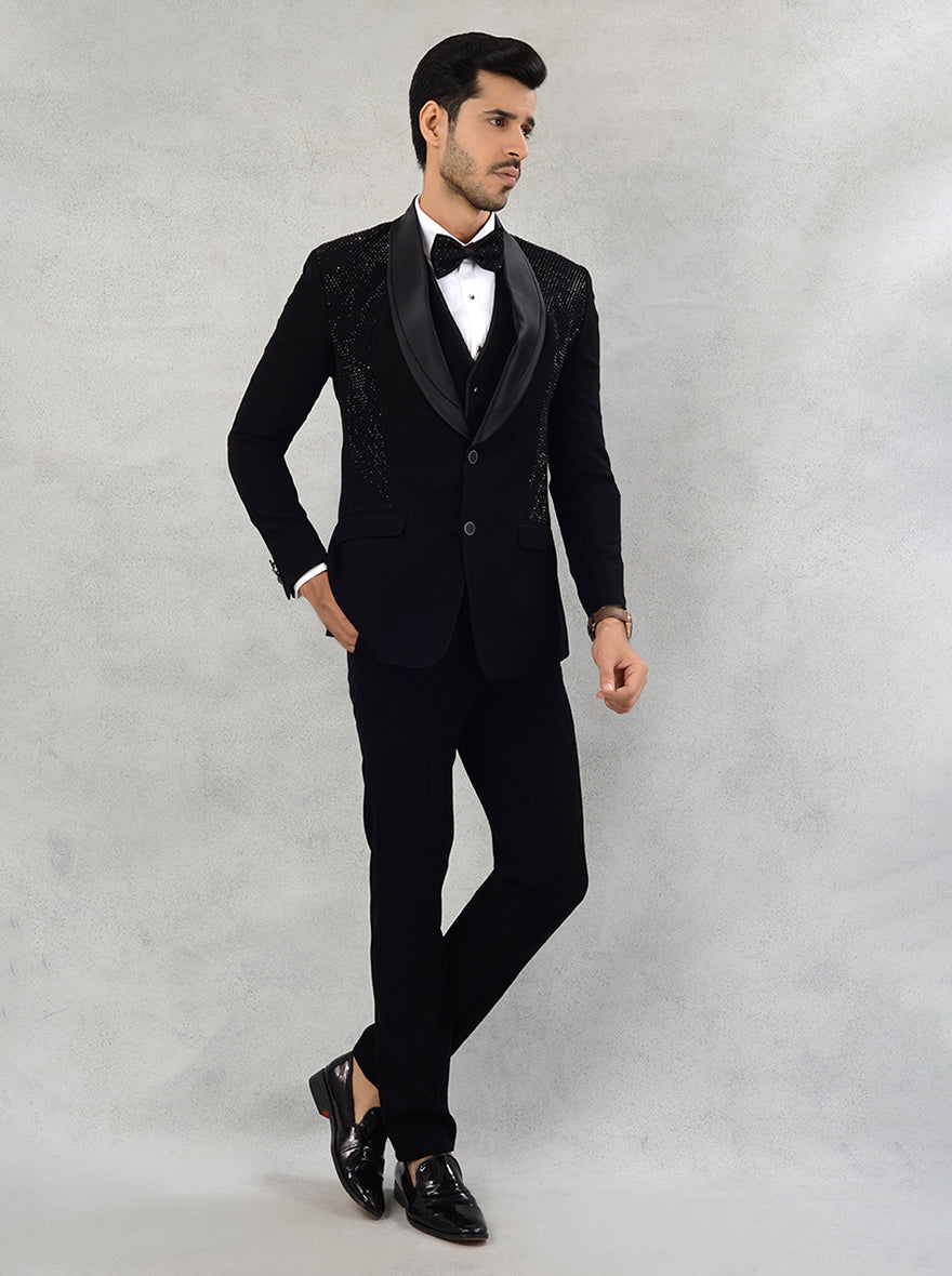 Details: Introducing the epitome of timeless sophistication - JadeBlue's Black Embroidered Suit. Immerse yourself in the world of luxury and refinement with this meticulously crafted ensemble. Made from Sun Silk fabric, our suit exudes opulence and ensures utmost comfort, making you feel like a true gentleman at any occasion. The intricate embroidery detailing, featuring dori and diamond embroidery, adds a touch of regality to the suit, making you stand out effortlessly. The shawl lapel, 2-button design, and straight cut enhance your silhouette, exuding confidence and charm with every step you take. Perfect for receptions and musical nights, this Black Embroidered Suit becomes your ultimate style statement. The versatile color effortlessly complements any skin tone and the subtle yet captivating embroidery elevates your fashion sense to new heights. At JadeBlue, we understand that the right attire can make or break your confidence, which is why we go above and beyond to create pieces that not only exude sophistication but also boost your self-assurance. Step into the world of classic elegance with JadeBlue's Black Embroidered Suit and experience the perfect blend of style, comfort, and luxury.