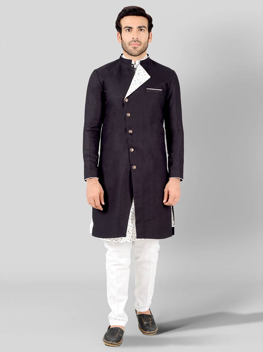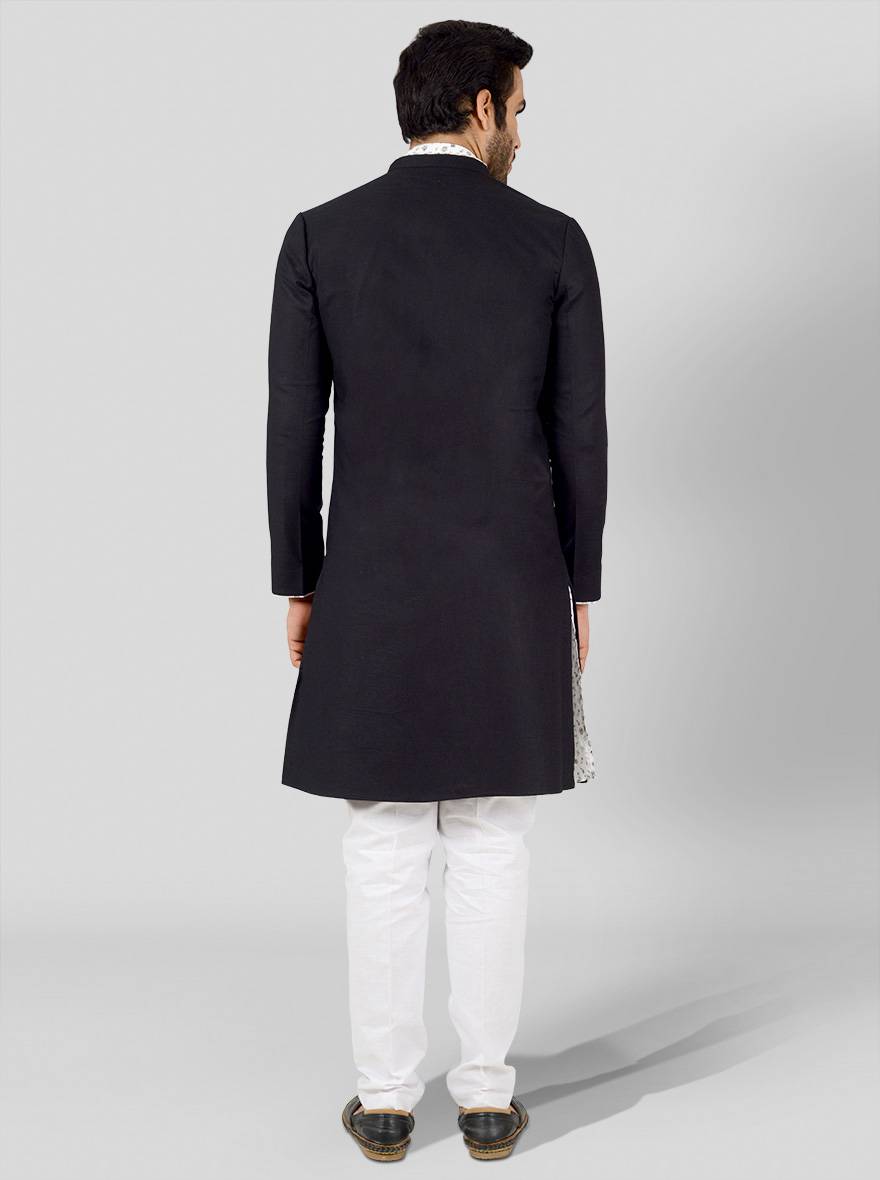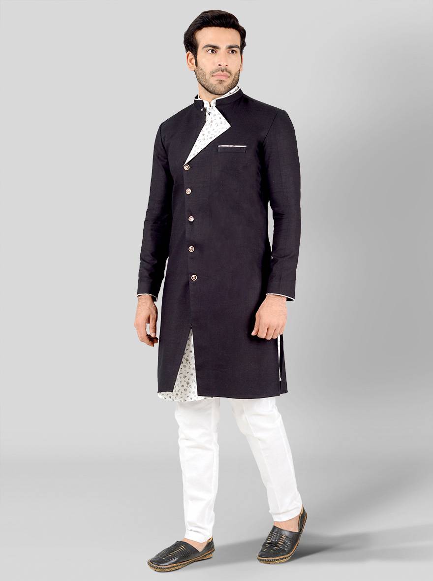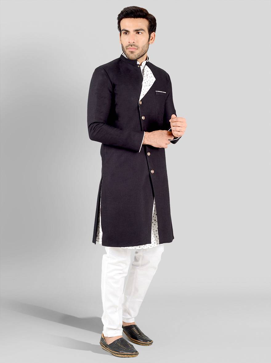 Details: This fashionable semi indo-western black and white kurta will let you stay in style from AM to PM. It is made from cotton linen fabric and features mandarin collar, asymmetric buttons and chest pocket. Side slit allows free leg movement.