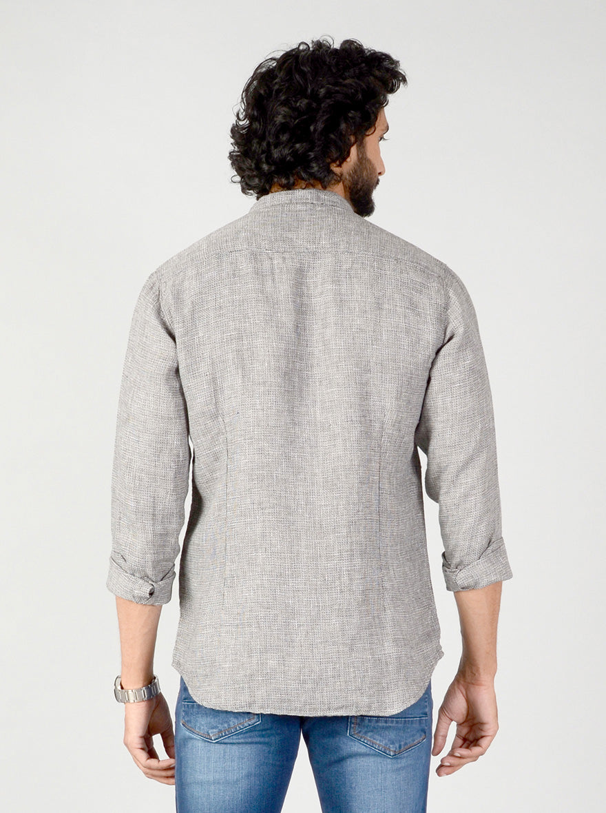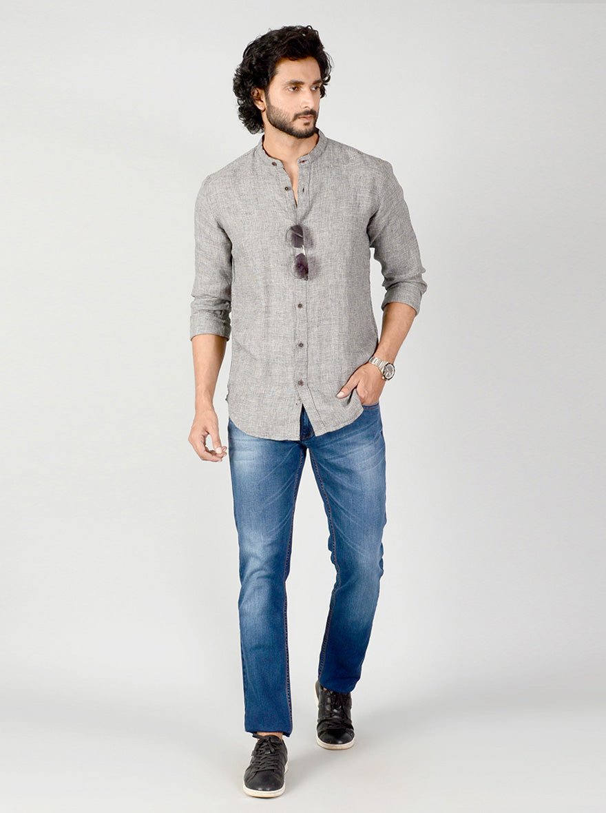 Details: Slay in style by adorning this black casual shirt. A must-have piece for fashion savvy man. This cotton slim fit shirt features mandarin collar, front buttons fastening and curved hem.