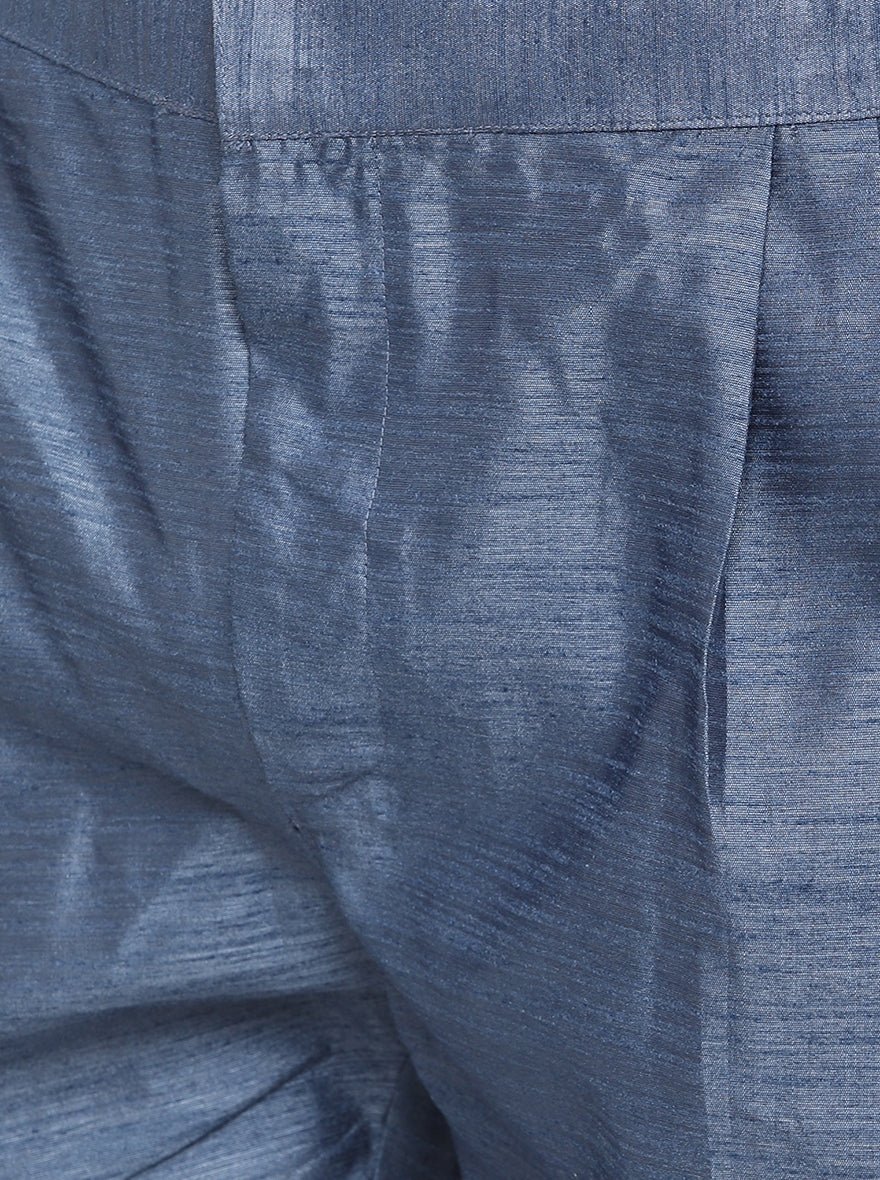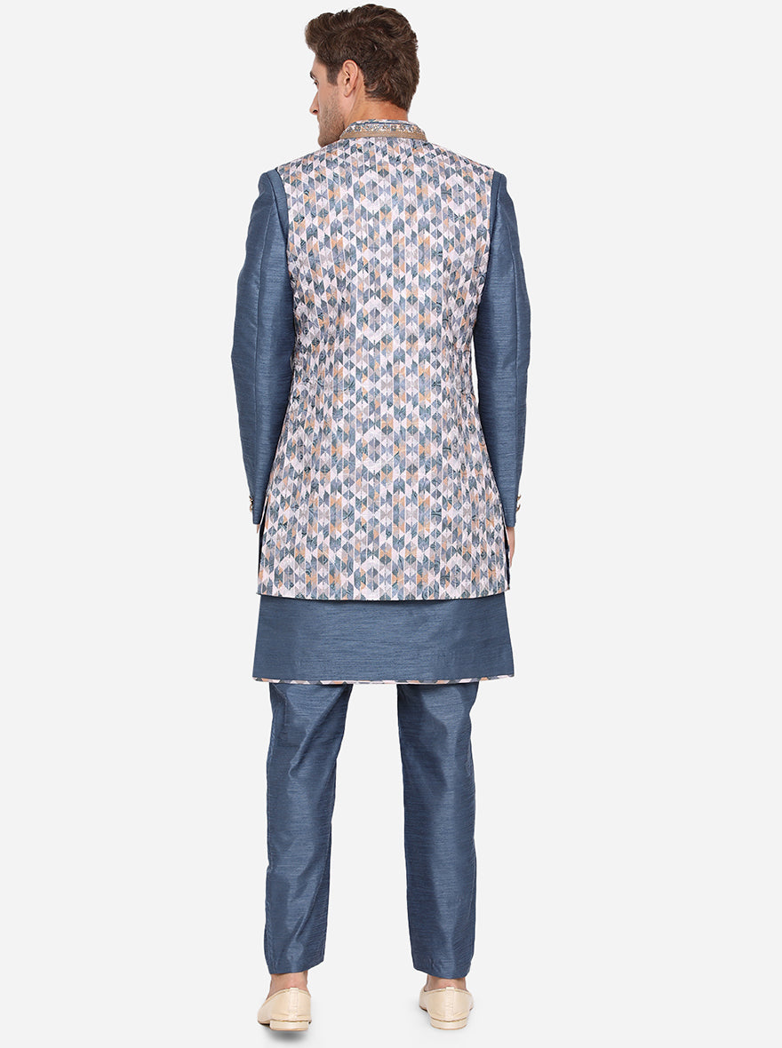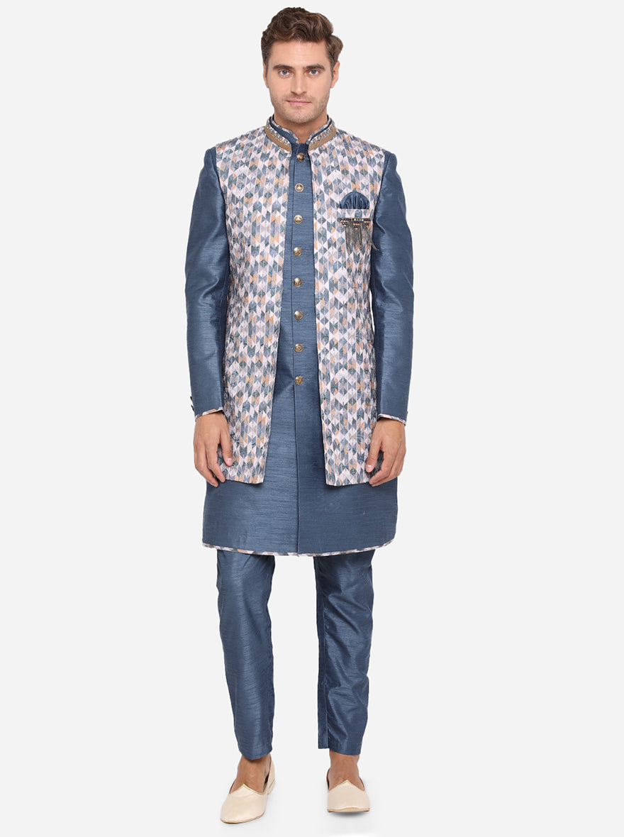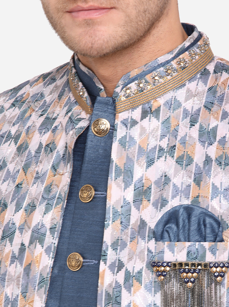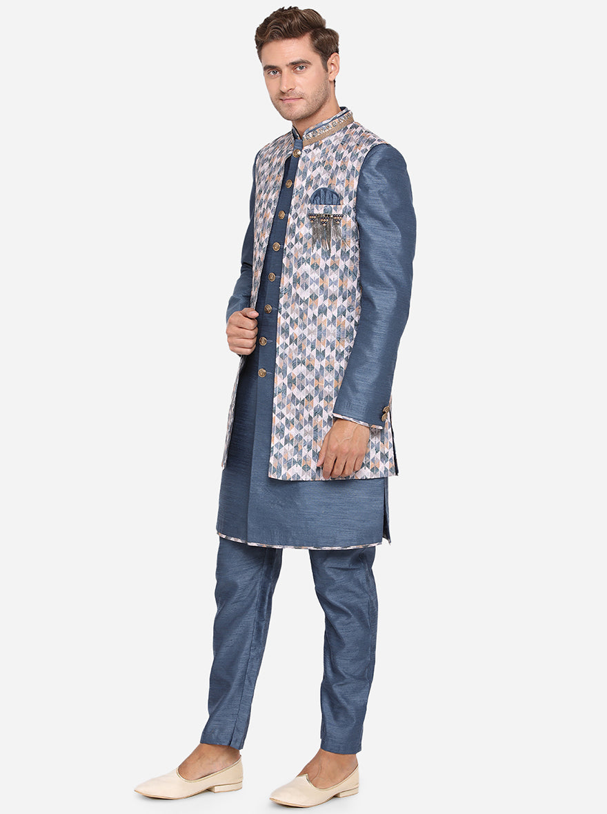 Details: This classic Blue and Beige indowestern from the latest collection of Azania is perfect for the wedding season. The kurta features a mandarin collar, full sleeves and has buttons on the front. It comes with a sleeveless floral printed jacket on it, making up for a beguiling choice. The matching pant comes in a self-design pattern, in blue color. Crafted with good quality silk blend, it ensures a rich look and the utmost comfort during extended hours. Perfect for Indian parties, festivals and weddings. Match it with a pair of jutti and you are all set to go.