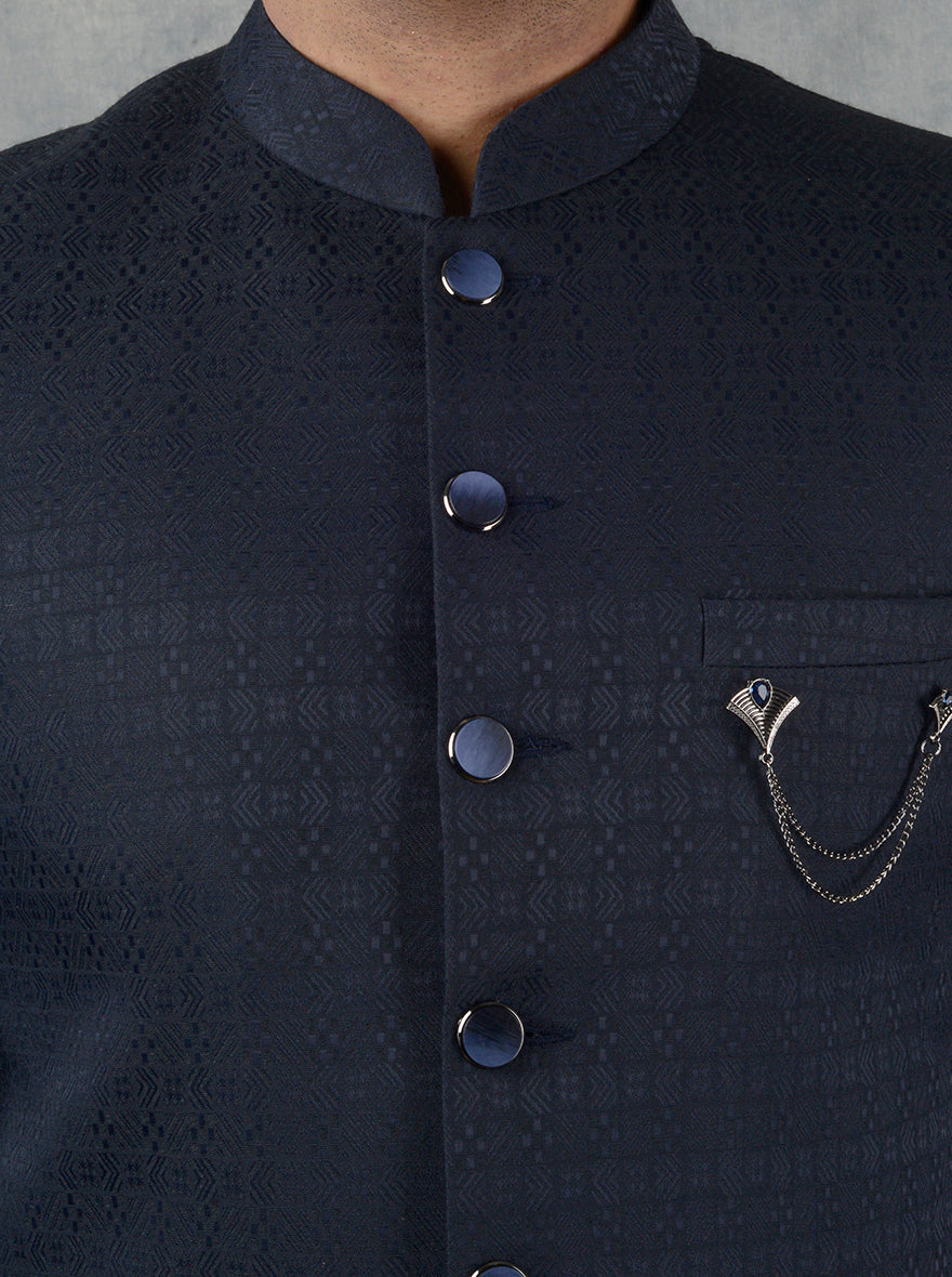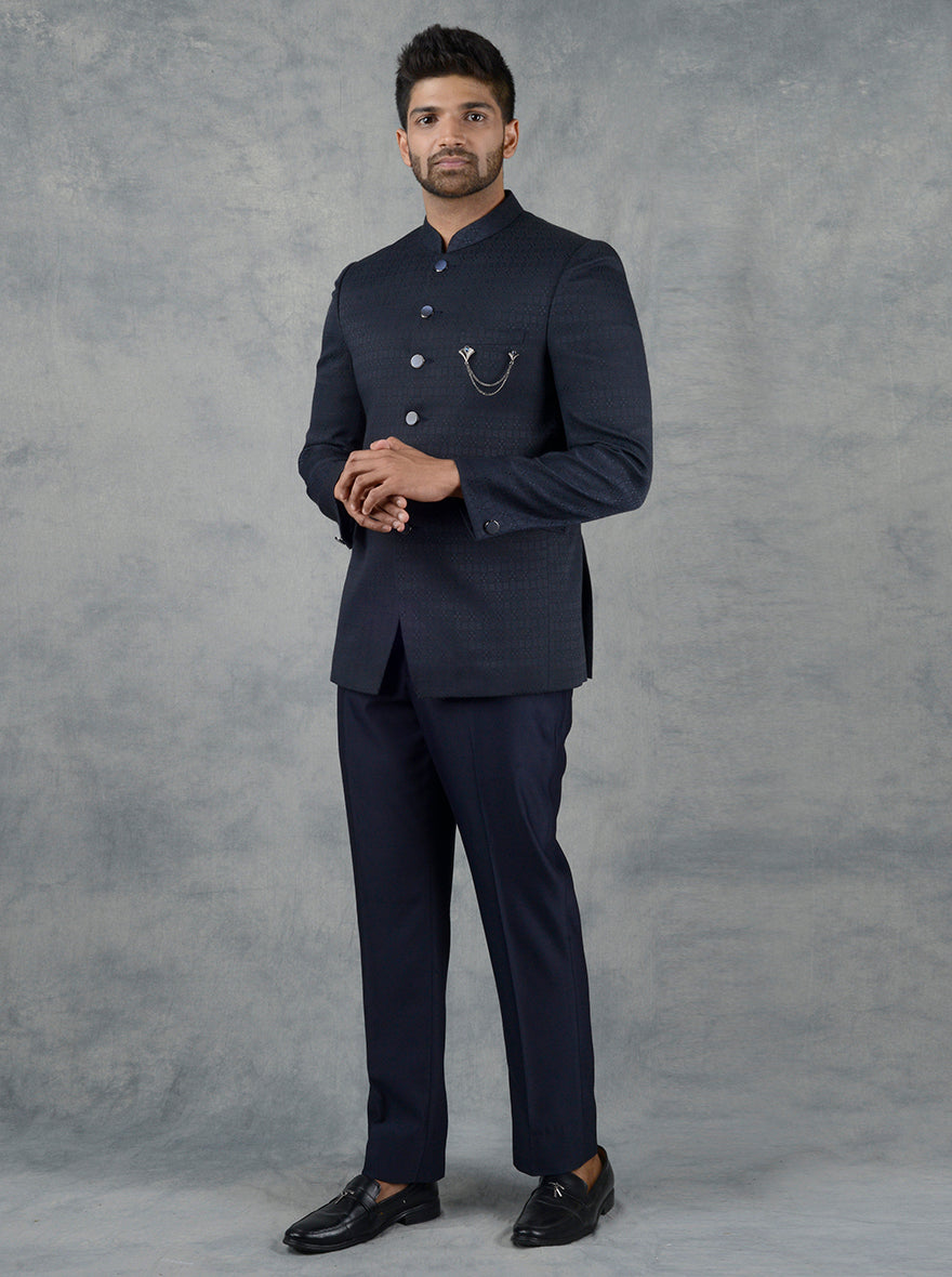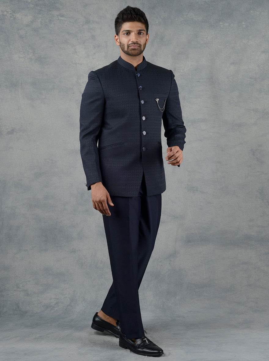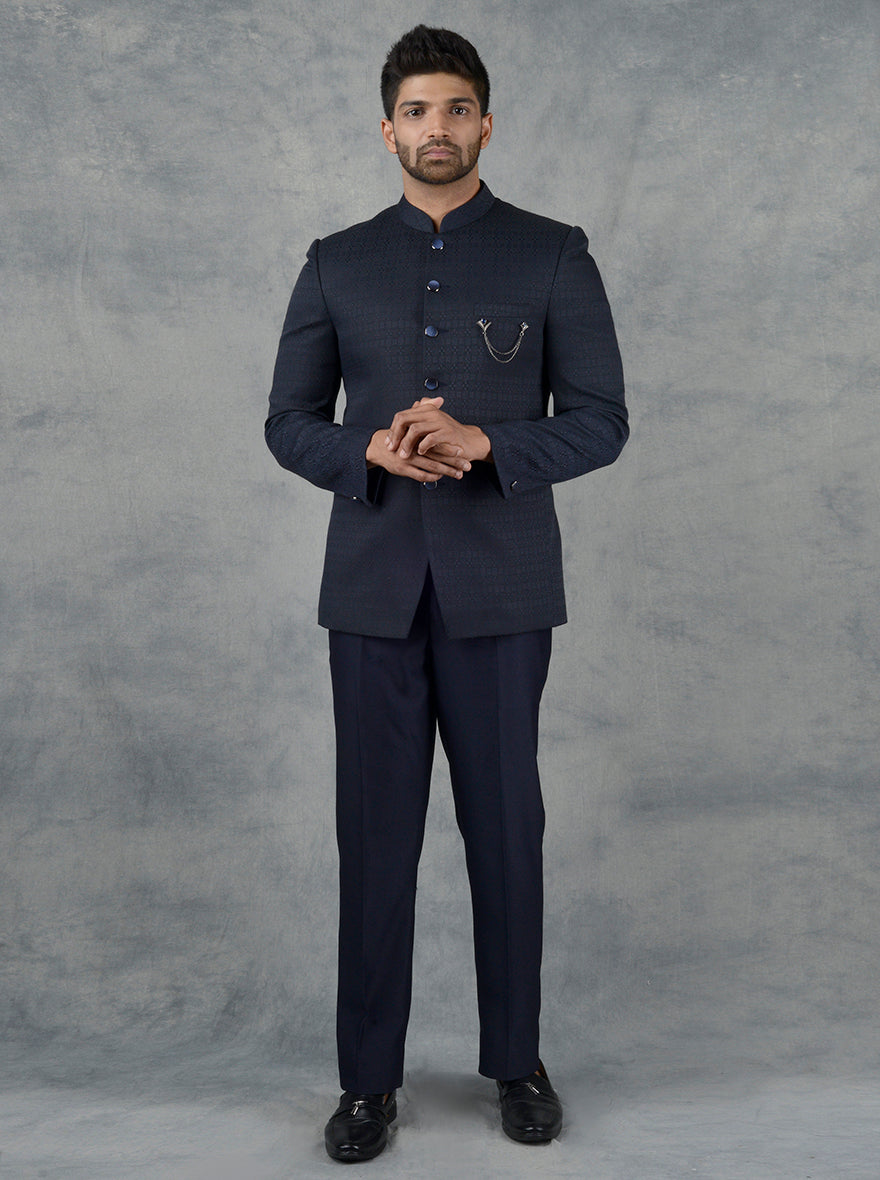 Details: Enjoy the royal vibe by dressing up in this stunning Blue Jodhpuri Suit from the latest collection of JadeBlue. It includes a jacket and a matching pant. The Jacket features a mandarin collar, full-sleeves, button placket and a pocket on the front. It is adorned with a self design pattern, making up for a timeless choice. It is perfect for formal events and wedding functions. Crafted with premium quality Terry Rayon, it assures a great fit and a great comfort all day long. Tag it with a pair of Black oxford shoes to complete the attire like a pro.