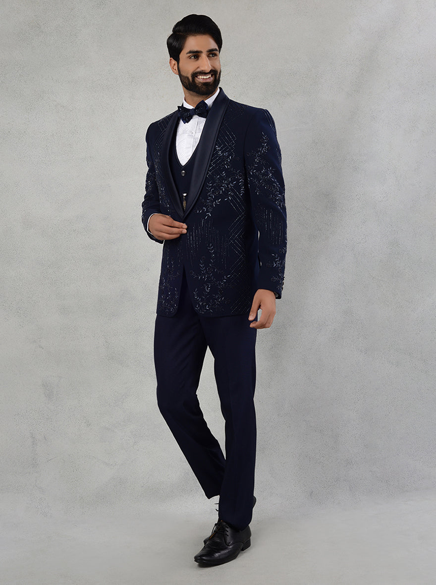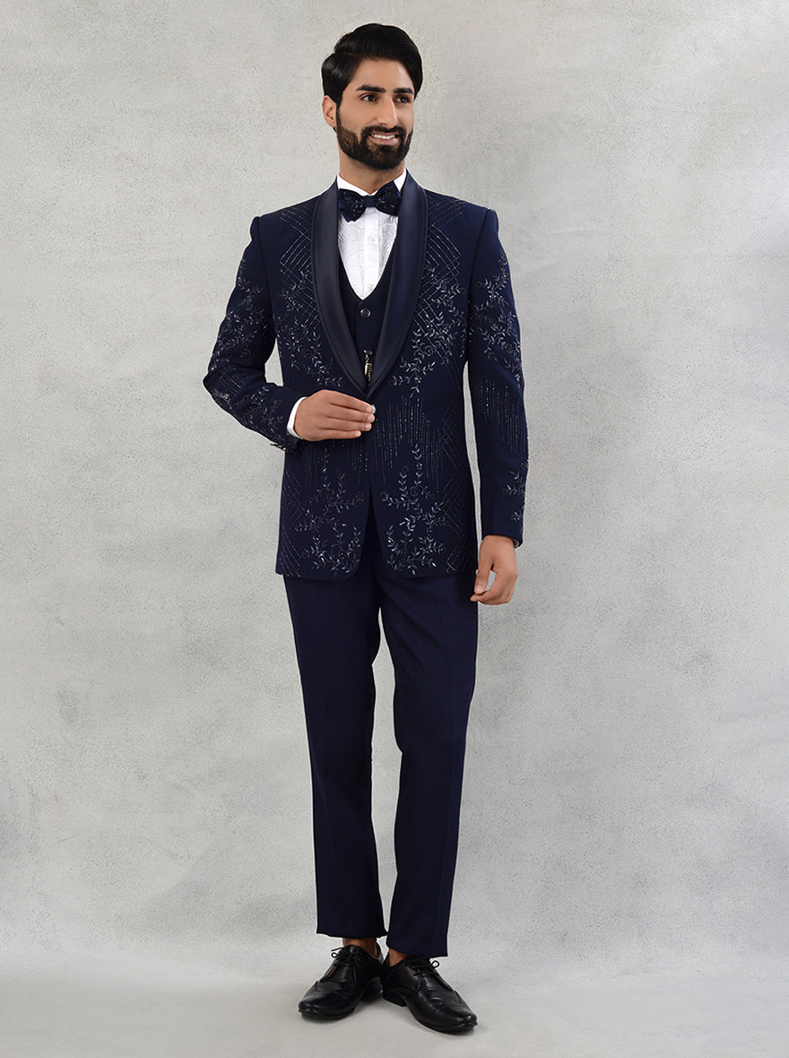 Details: Introducing JadeBlue's exceptional Suit collection, where timeless elegance meets modern sophistication. Our Suit, impeccably tailored with utmost precision, celebrates the harmonious fusion of classic charm and contemporary trends. Crafted with the finest Sun Silk fabric, this Suit exudes luxury while ensuring unparalleled comfort and confidence. Intricately embroidered with exquisite cutdana, Sali, and beadwork, our Suit in the captivating shade of Blue showcases a mesmerizing pattern that demands attention. The attention to detail is evident in every stitch, embracing the artistry of embroidery. Featuring a shawl lapel and a sleek 1-button design, our Suit offers a straight cut that accentuates your impeccable style. The meticulous craftsmanship ensures a flawless fit that flatters your silhouette, making you stand out at every occasion. Whether it's a grand sangeet or an elegant reception, JadeBlue's Suit is the perfect choice for any festive gathering. It adds a touch of regality that seamlessly blends with the joyous atmosphere, making you the center of attention with its captivating presence. The collar type has been carefully designed to complement the overall look of the Suit, rounding off its exceptional allure with grace and sophistication. Upgrade your style and elevate your confidence with JadeBlue's Suit, a statement of impeccable taste and refined fashion. Embrace the essence of luxury and let your charisma shine with every step you take.