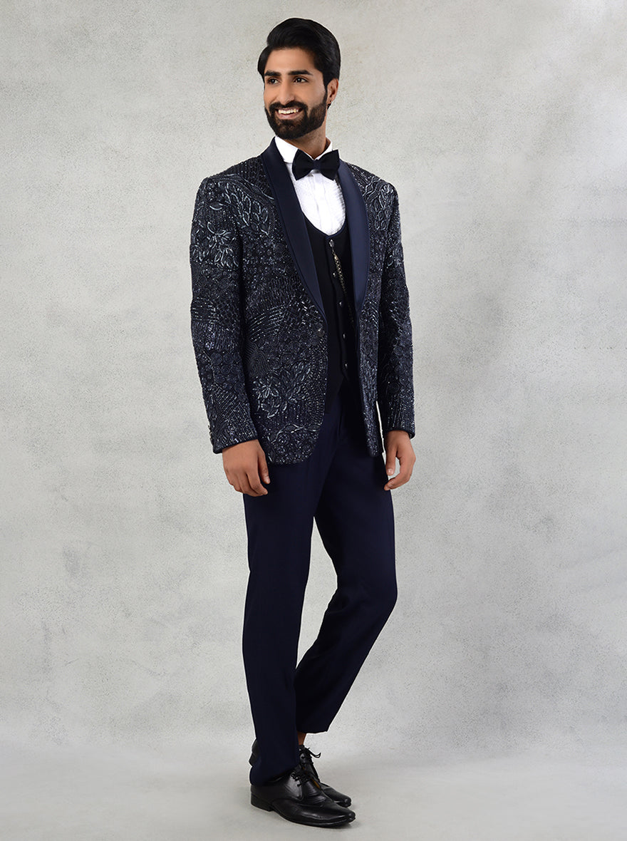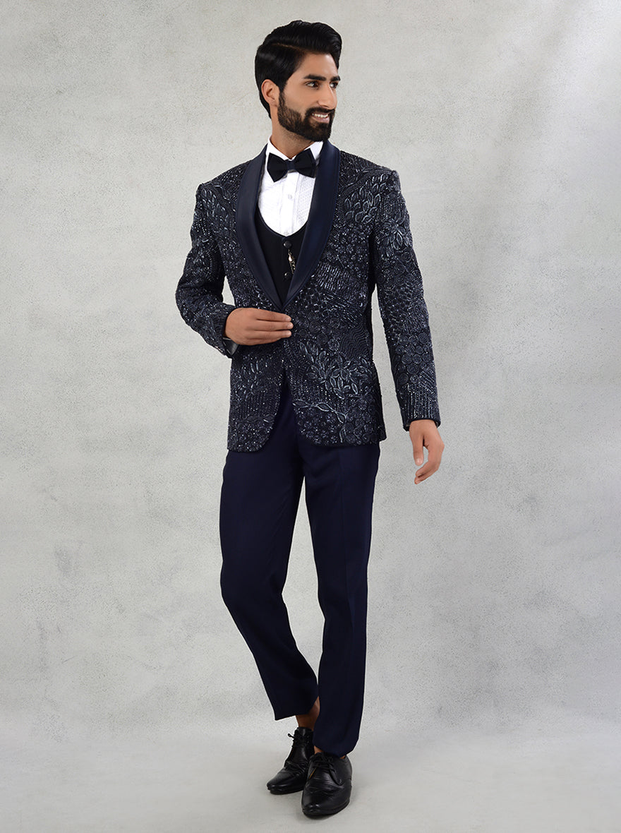Details: Introducing JadeBlue's exceptional Suit collection, where timeless elegance meets modern sophistication. Our Suit, impeccably tailored with utmost precision, celebrates the harmonious fusion of classic charm and contemporary trends. Crafted with the finest Sun Silk fabric, this Suit exudes luxury while ensuring unparalleled comfort and confidence. Intricately embroidered with exquisite cutdana, Sali, and beadwork, our Suit in the captivating shade of Blue showcases a mesmerizing pattern that demands attention. The attention to detail is evident in every stitch, embracing the artistry of embroidery. Featuring a shawl lapel and a sleek 1-button design, our Suit offers a straight cut that accentuates your impeccable style. The meticulous craftsmanship ensures a flawless fit that flatters your silhouette, making you stand out at every occasion. Whether it's a grand sangeet or an elegant reception, JadeBlue's Suit is the perfect choice for any festive gathering. It adds a touch of regality that seamlessly blends with the joyous atmosphere, making you the center of attention with its captivating presence. The collar type has been carefully designed to complement the overall look of the Suit, rounding off its exceptional allure with grace and sophistication. Upgrade your style and elevate your confidence with JadeBlue's Suit, a statement of impeccable taste and refined fashion. Embrace the essence of luxury and let your charisma shine with every step you take.