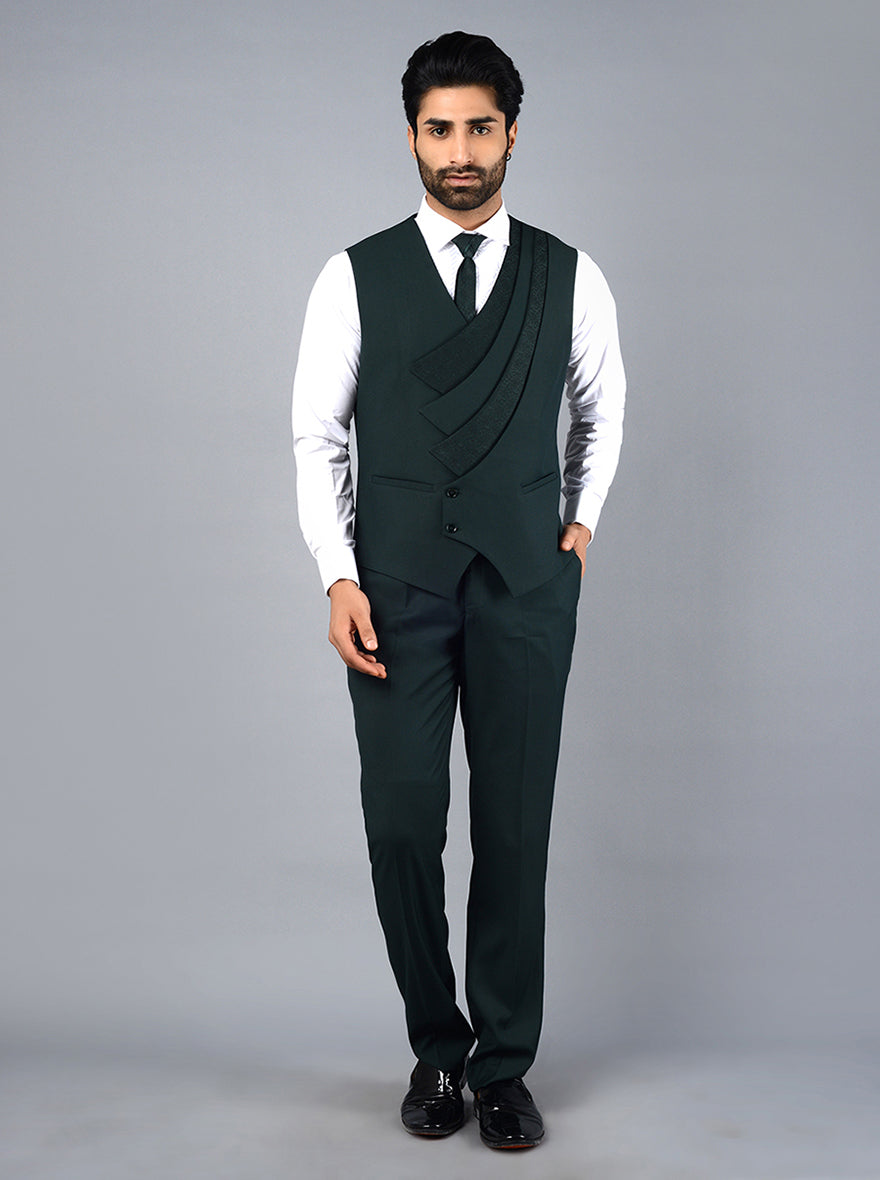 Details: This Bottle Green Suit from the latest collection of JadeBlue has made to the show stopper list. Crafted with premium Terry Rayon Fabric that gives formal and partywear look as well as is comfortable. Featuring one button for closure along with three pockets on blazer and white shirt & vest. Self-designed texture on the Blazer. Offers a classic fit for a look with a collar. Perfect for Formal Parties and other occasions.