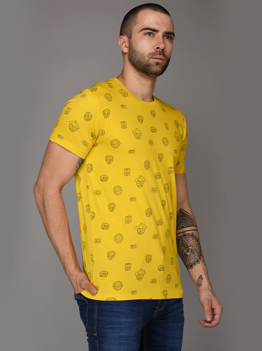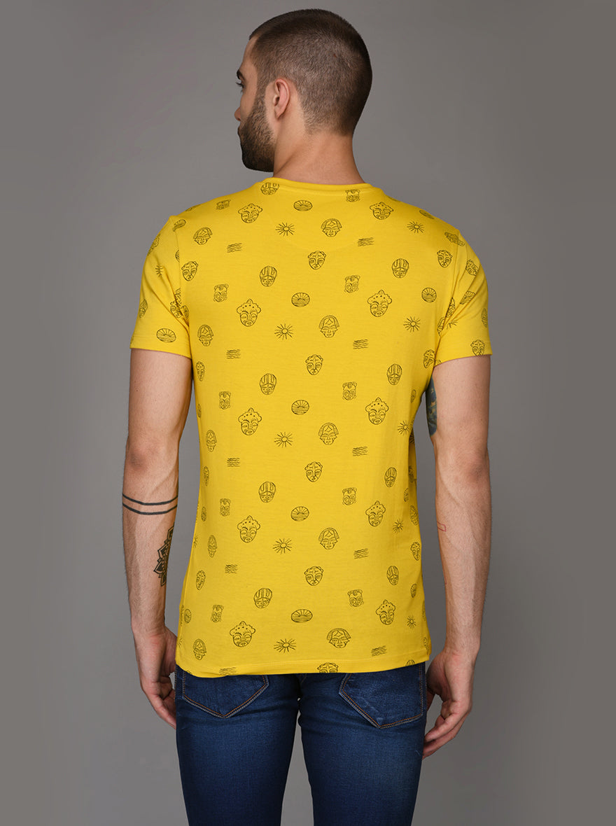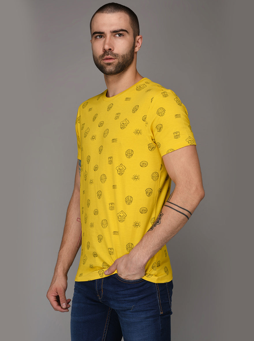 Bright Yellow Printed Slim Fit Round Neck T-Shirt | JadeBlue