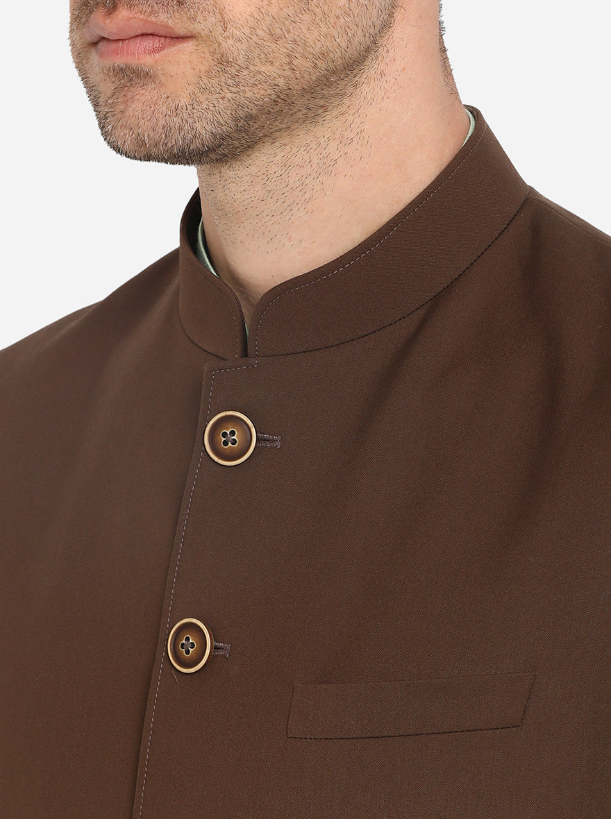 Details: Flaunt a stunning styling sense wearing this amazing Brown Nehru Jacket from the brand Modi Jacket. Featuring a mandarin collar and is sleeveless. Tailored to a regular fit, it is adorned with a self-design pattern, ehancing the overall design of this piece. Has a button placket and three pockets on the front. Perfect for formal wear. Made with premium Terry Rayon that assures a great comfort at all times. Match it with a smart kurta and pant to achieve the desired look.