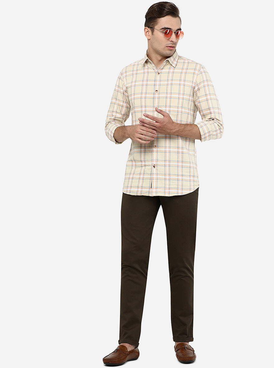 Details: Wear this stylish and comfy solid brown casual trouser by Greenfibre. This neo fit casual trouser is stitched to perfection by using skin-friendly cotton fabric, which promises great fit, comfort and flexibility from day to night. This trouser is styled with must-have features like belt loops, 2 side slant pockets, 2 rear welt buttoned pockets, single button closure and zip fly fastening, which lends it a functional touch. Wear this trouser with checks casual shirt, suede loafers and a watch to achieve a comfy casual look instantly.