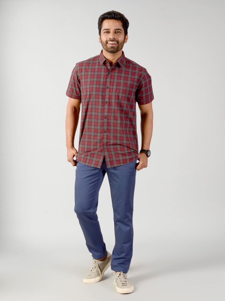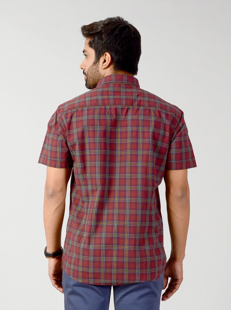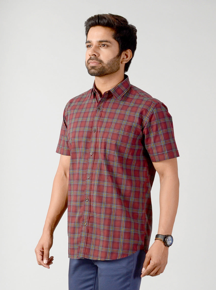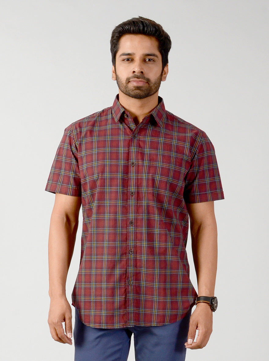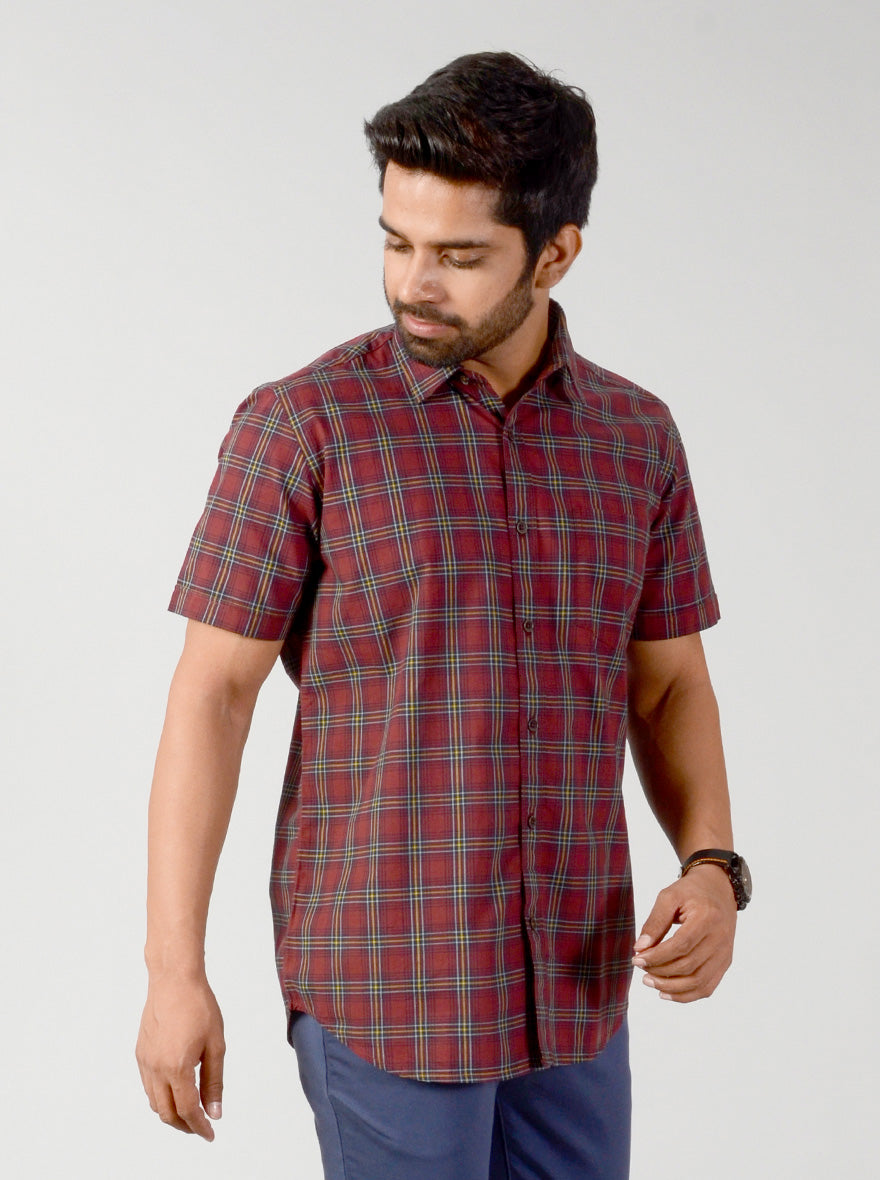 Details: Upgrade your overall style in a casual way by donning this dark brown checks shirt. This slim fit cotton shirt features chest pocket, shirt collar, curved hem and half sleeves. For closure, it features front buttons.