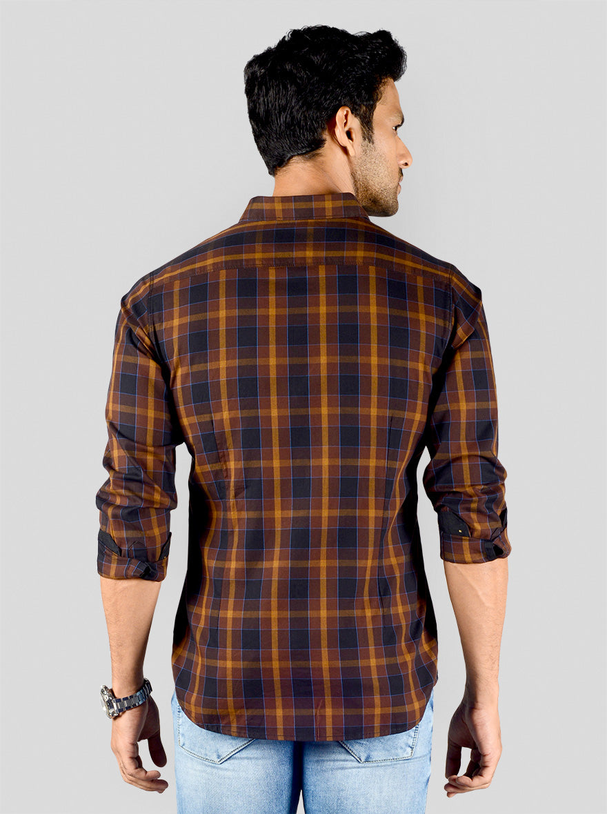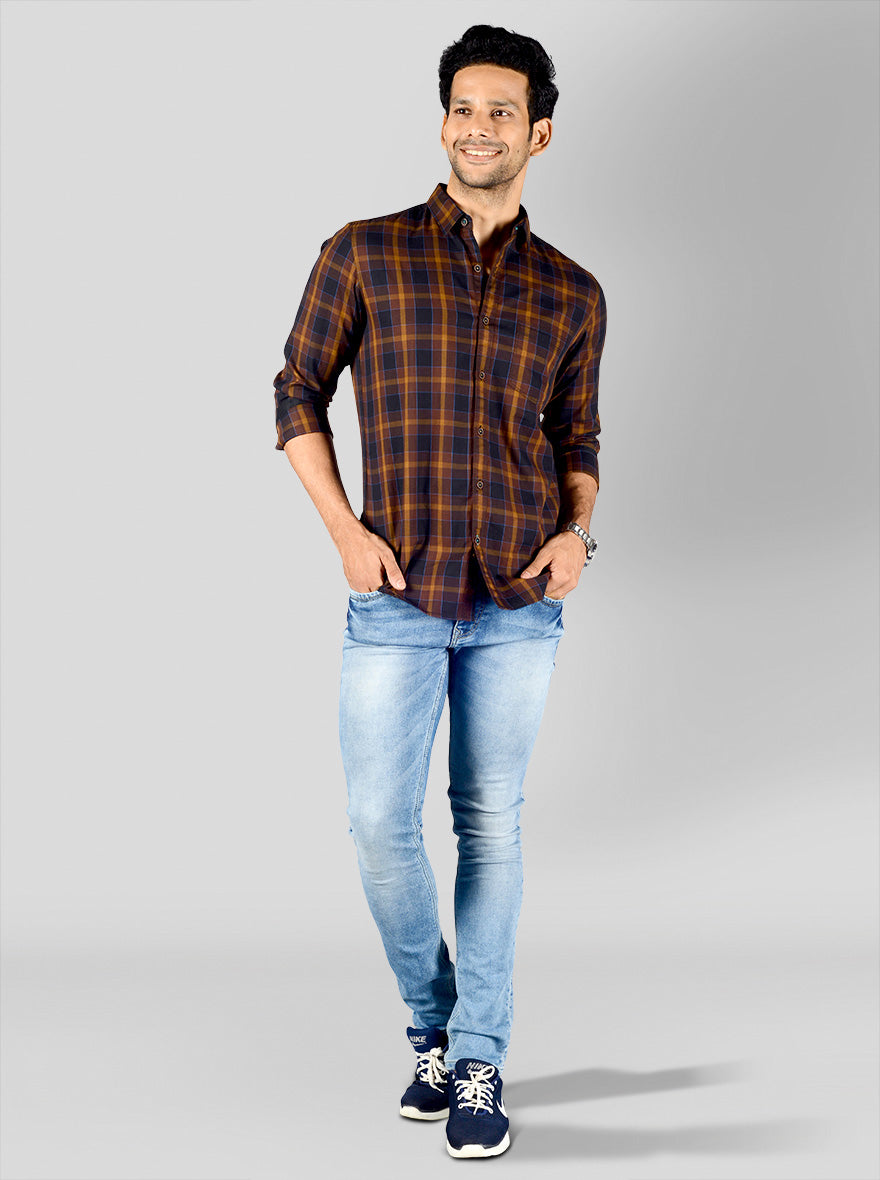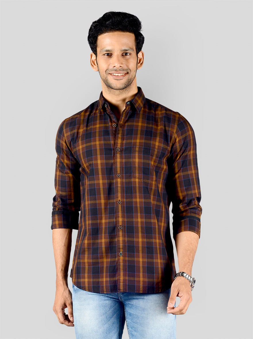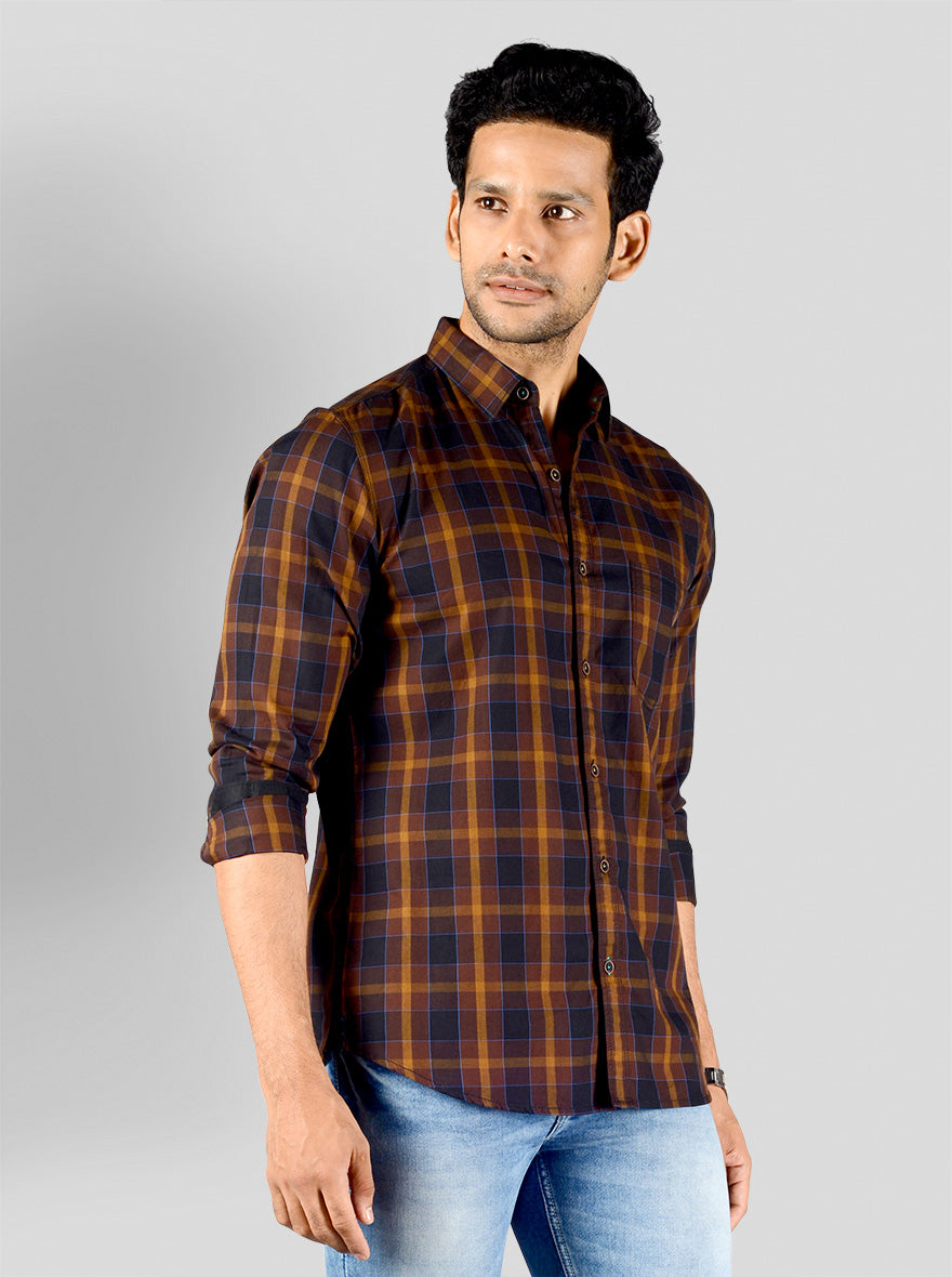 Details: This season achieve a new casual look by adding this fashionable brown checks shirt. Made from cotton blend fabric, this slim fit shirt features chest pocket, standard classic collar and front buttons fastening.