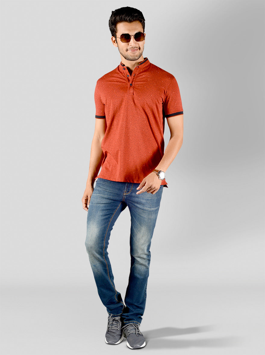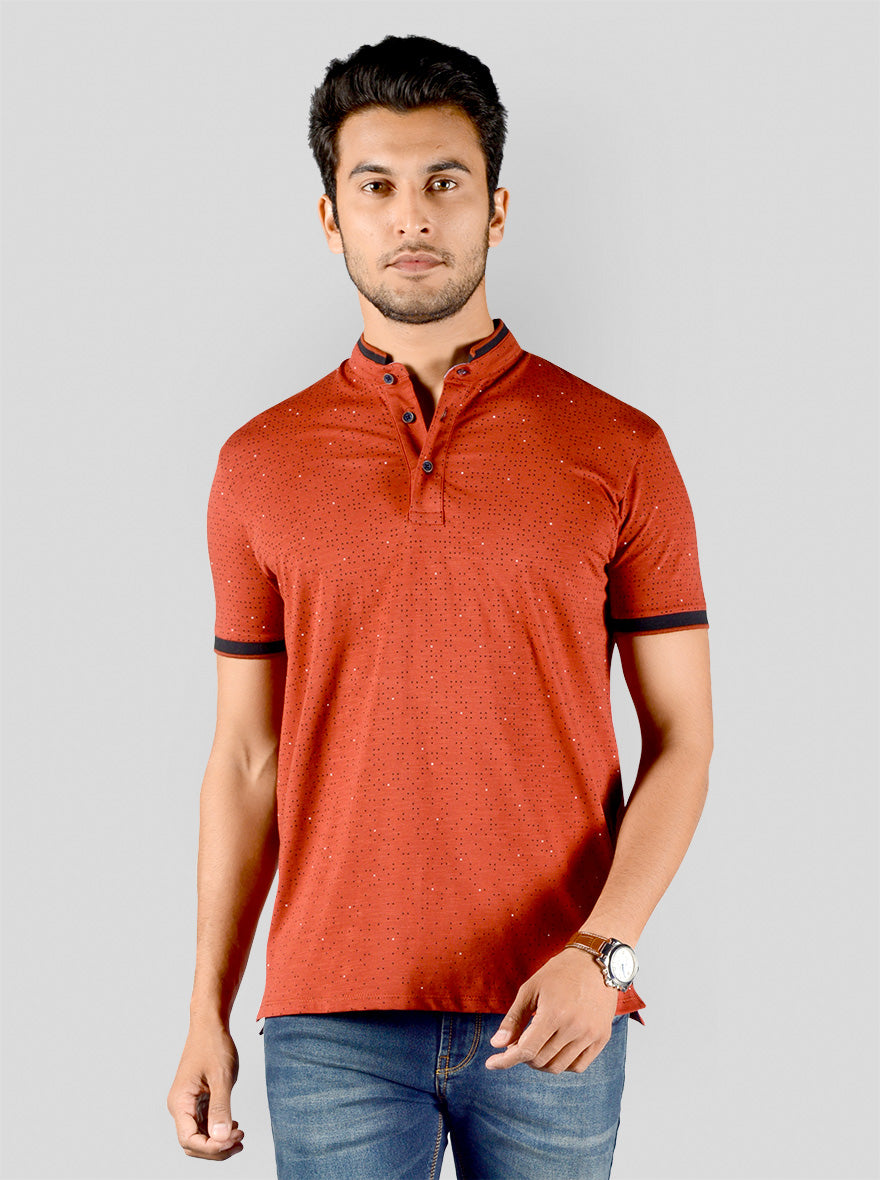 Details: Upgrade your polo t-shirts collection in a classy way by adding this red printed t-shirt to it. It is made from cotton blend fabric and features polo collar, short button placket and half sleeves. Short side slits add a perfect finishing touch.