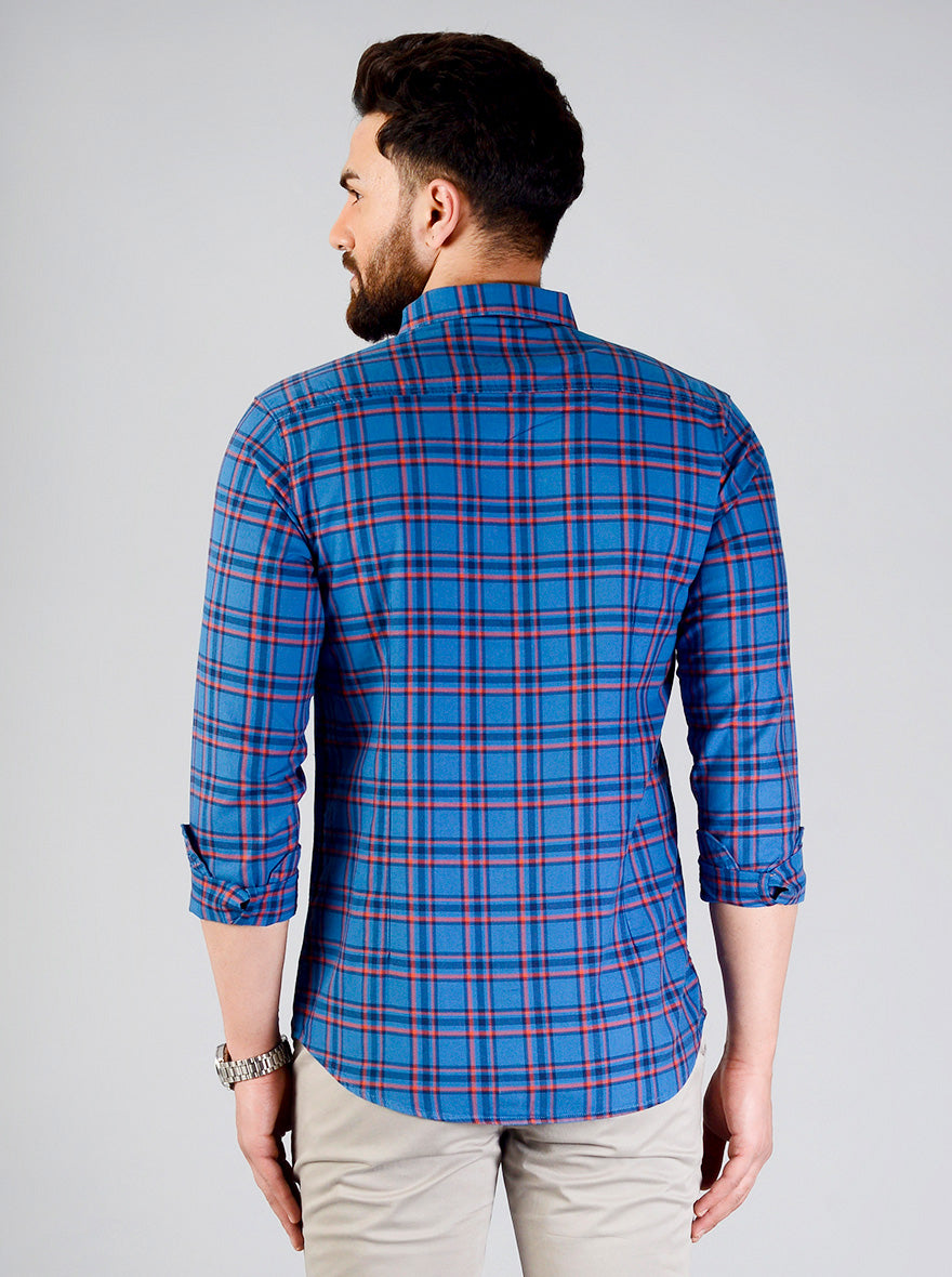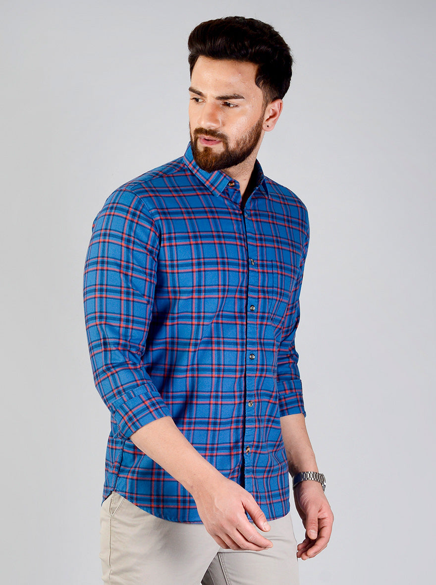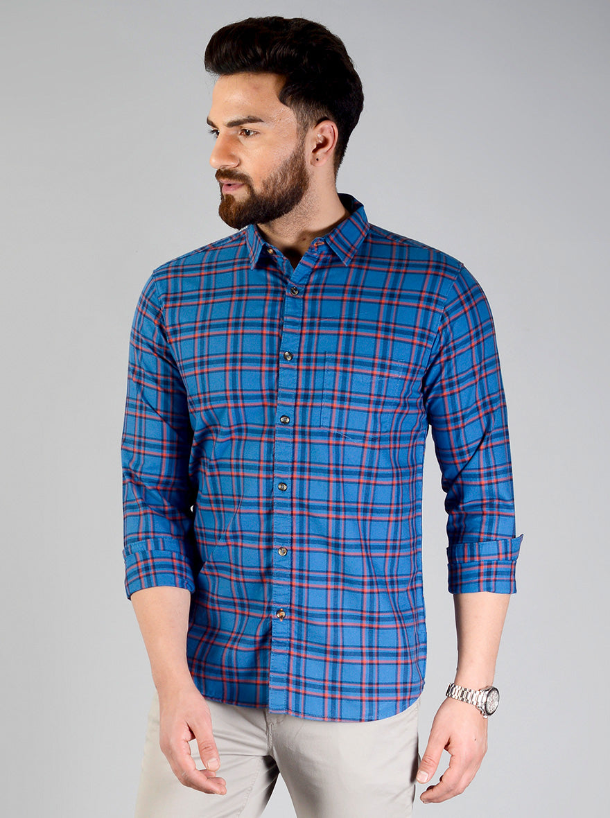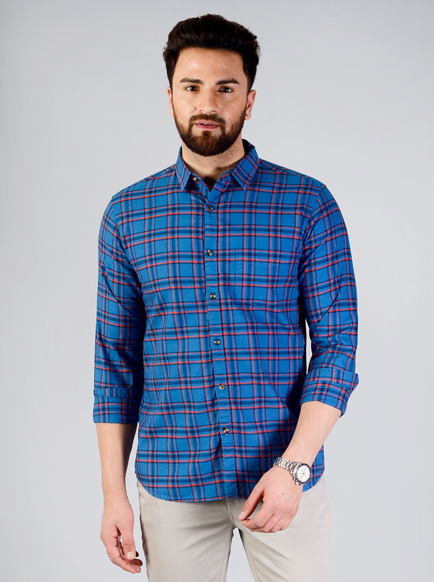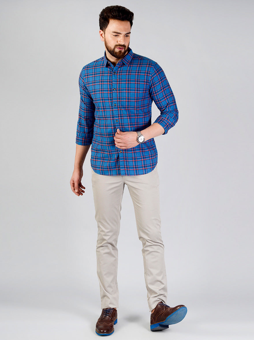 Details: Be the trendsetter this season by wearing this blue checks casual shirt. Made to perfection using premium cotton fabric, this slim fit shirt features chest pocket, shirt collar and front buttons for comfy closure.