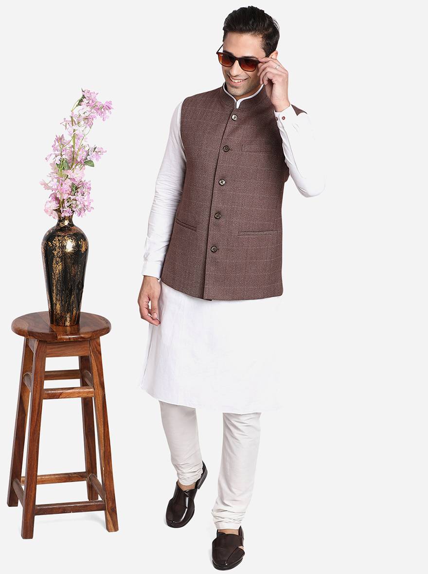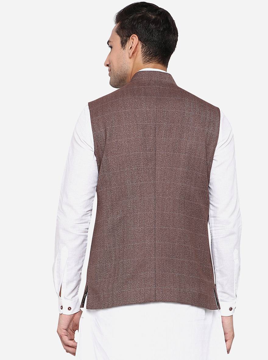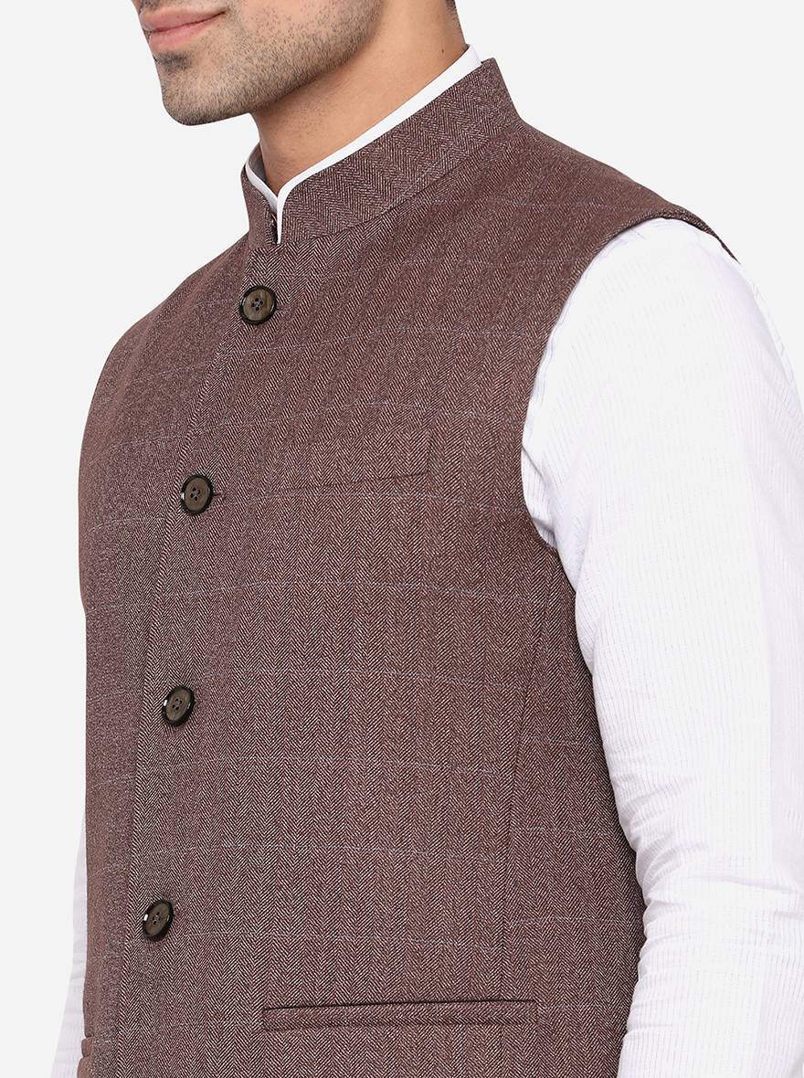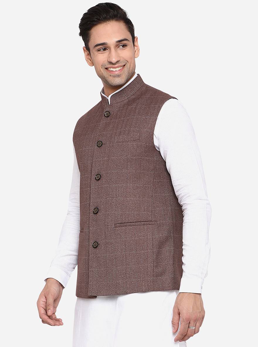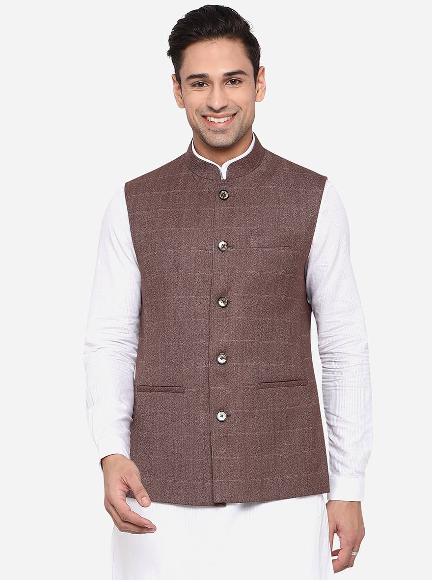 Details: It's time to update your Indian ethnic wear wardrobe by investing in this elegant Coffee Brown jacket from the brand JadeBlue. Featuring a mandarin collar neck along with a front button closure and is sleeveless. Adorned with a checkered pattern, it makes up for a versatile choice. Perfect for formal and semi-formal events. Offers a regular fit. Crafted with good quality terry rayon, it assures a great comfort all day long. Tag it with a contrast traditional kurta and pants to complete the look like a pro.