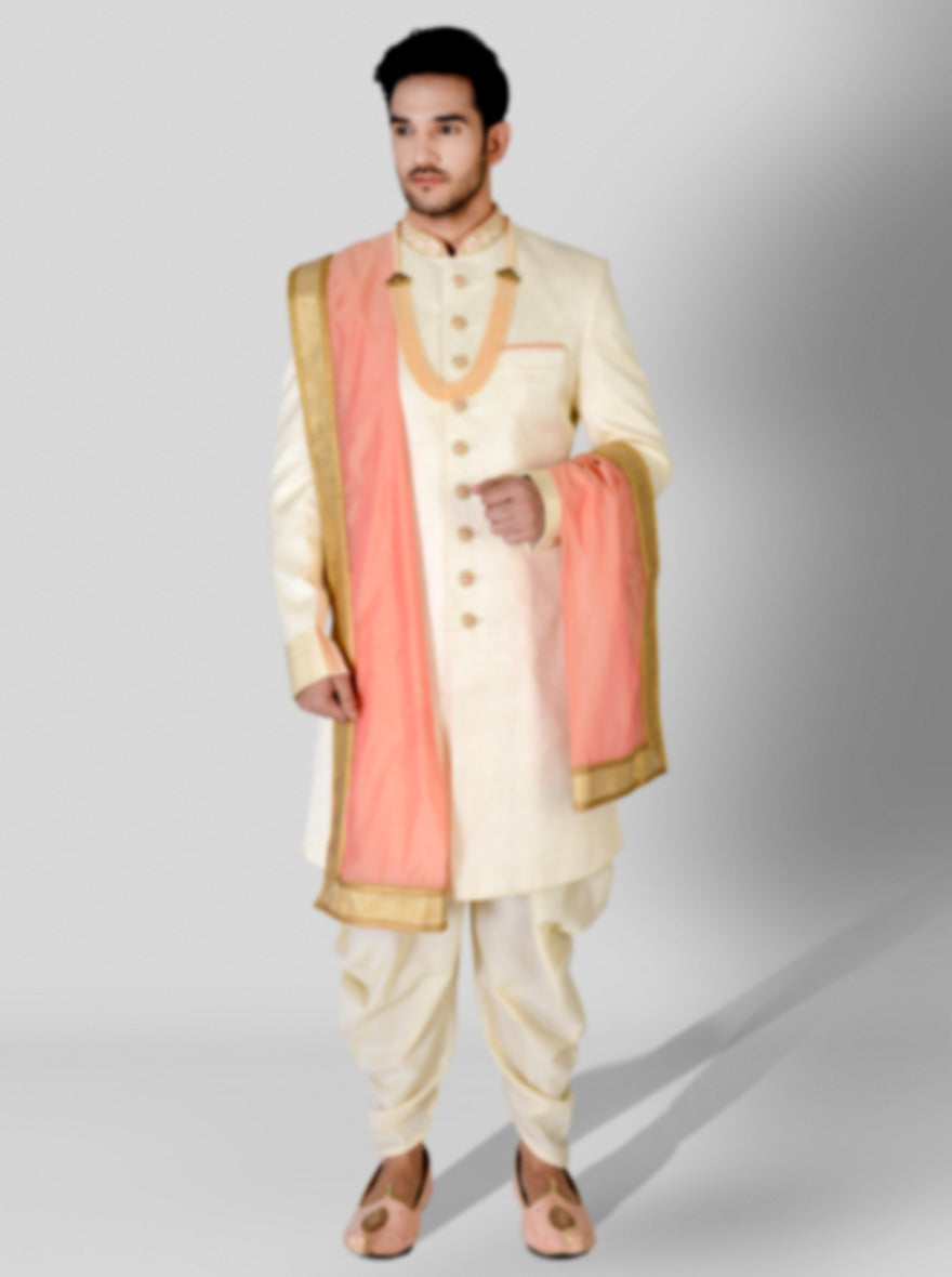 Details: This attractive cream indo-western from the house of Azania will add to your overall style. Made from premium silk fabric, this regular fit kurta features mandarin collar, chest pocket and front buttons fastening.