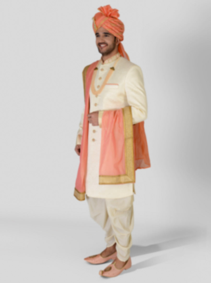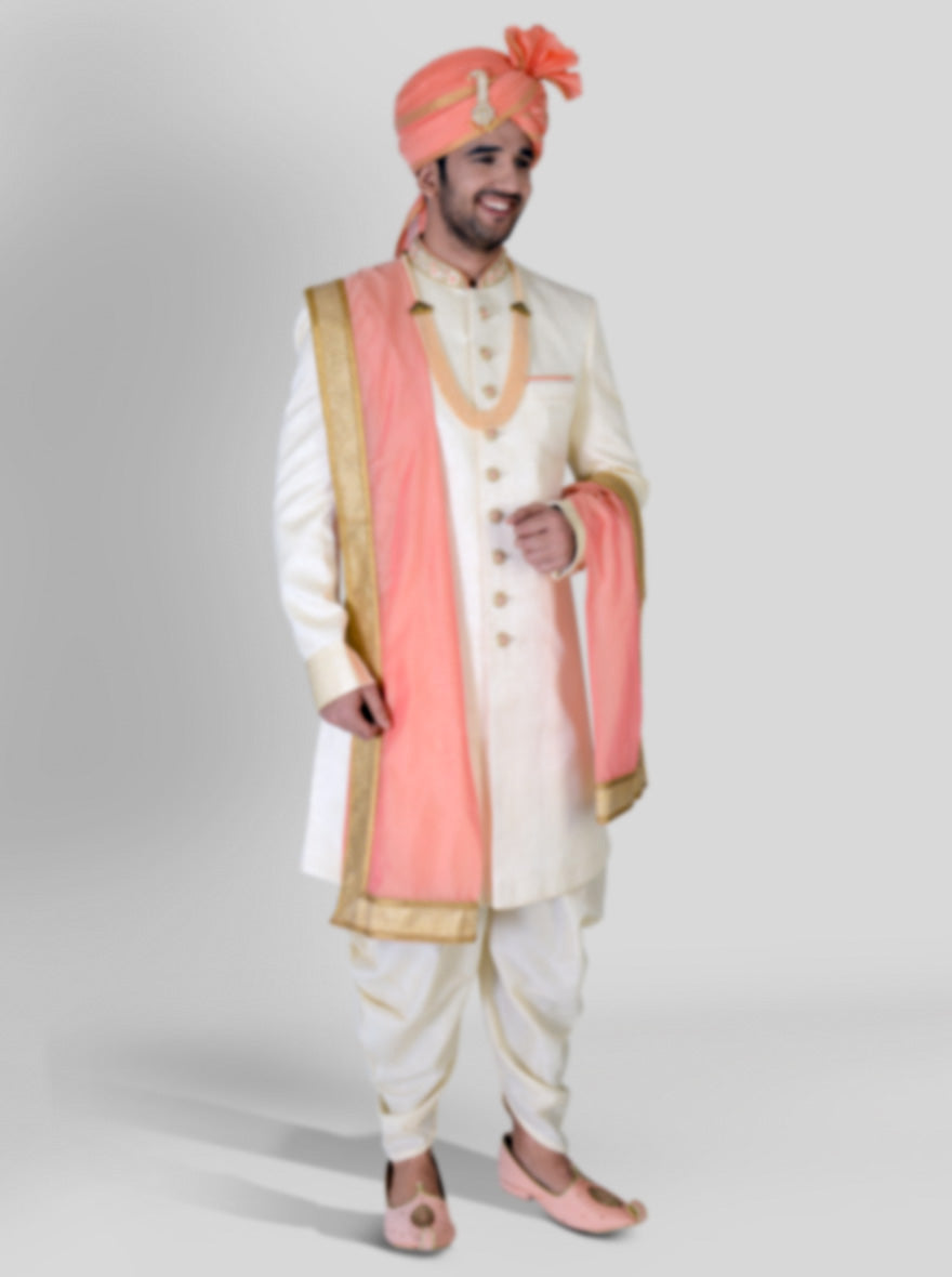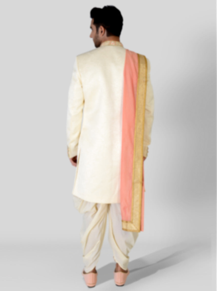 Style Tip: This stunning piece is teamed with cream dhoti pants, saafa, kalangi, neckpiece, khes and mojaris. You can also team it with Suitable pick for wedding day.
