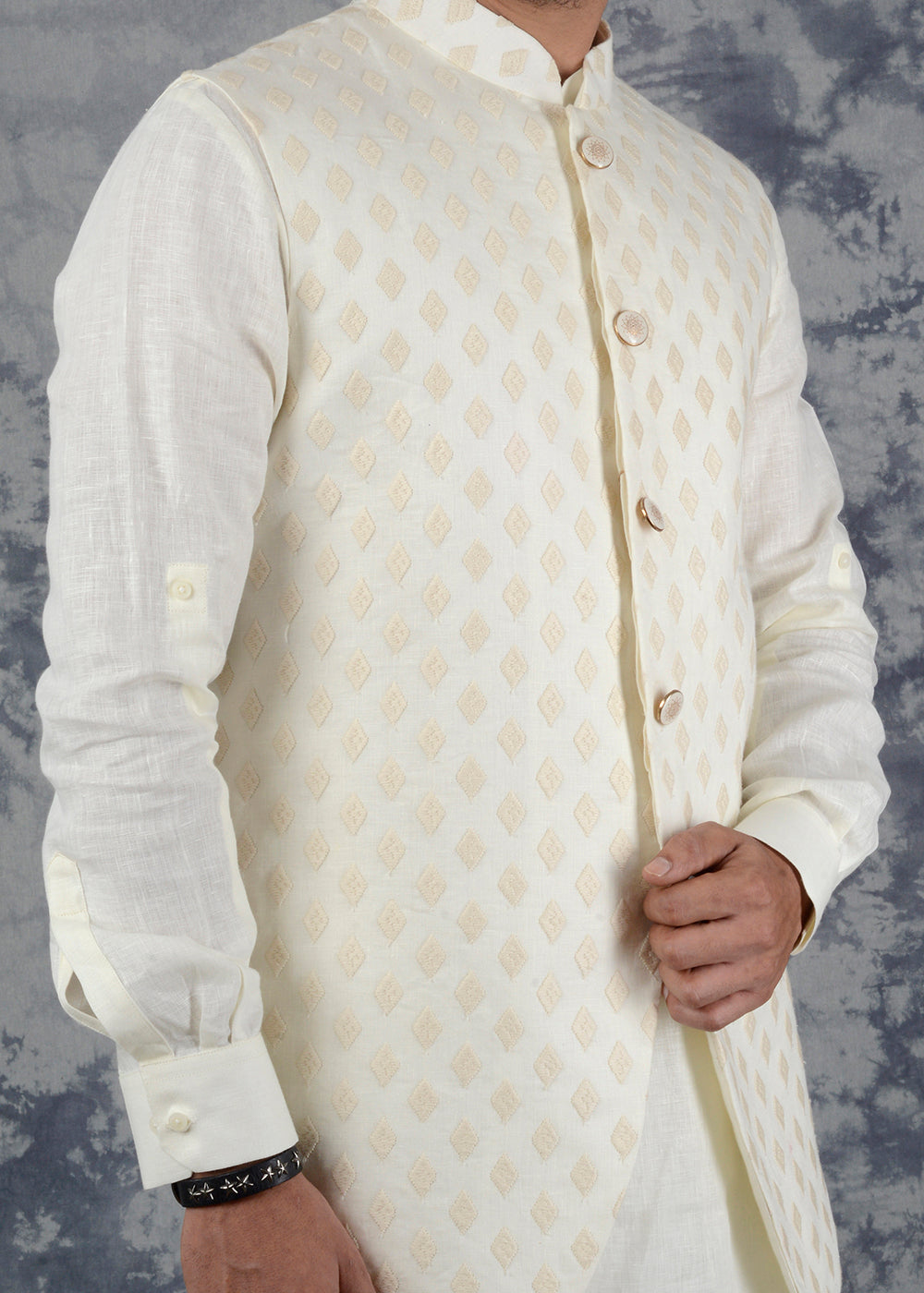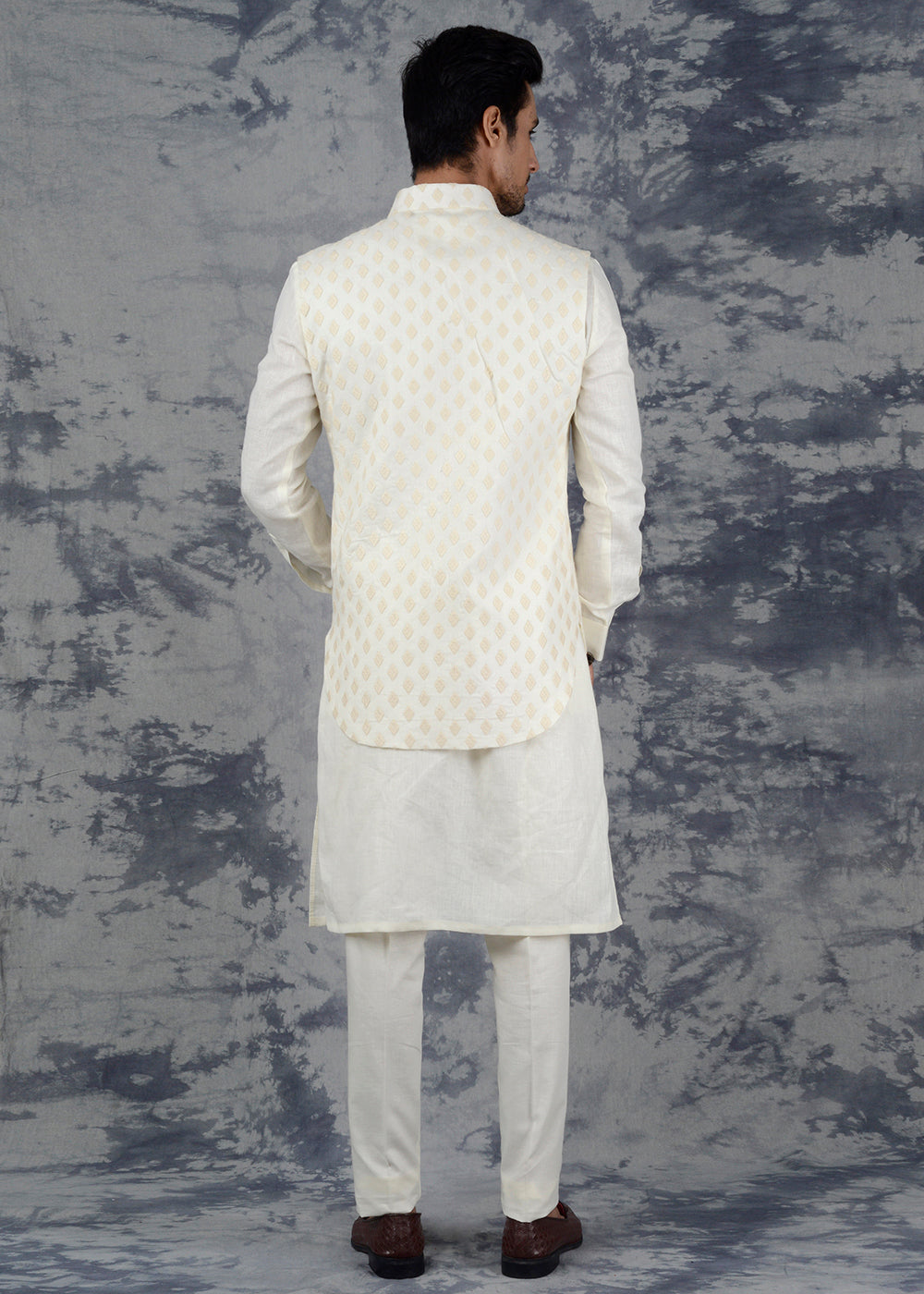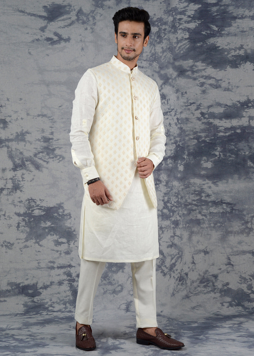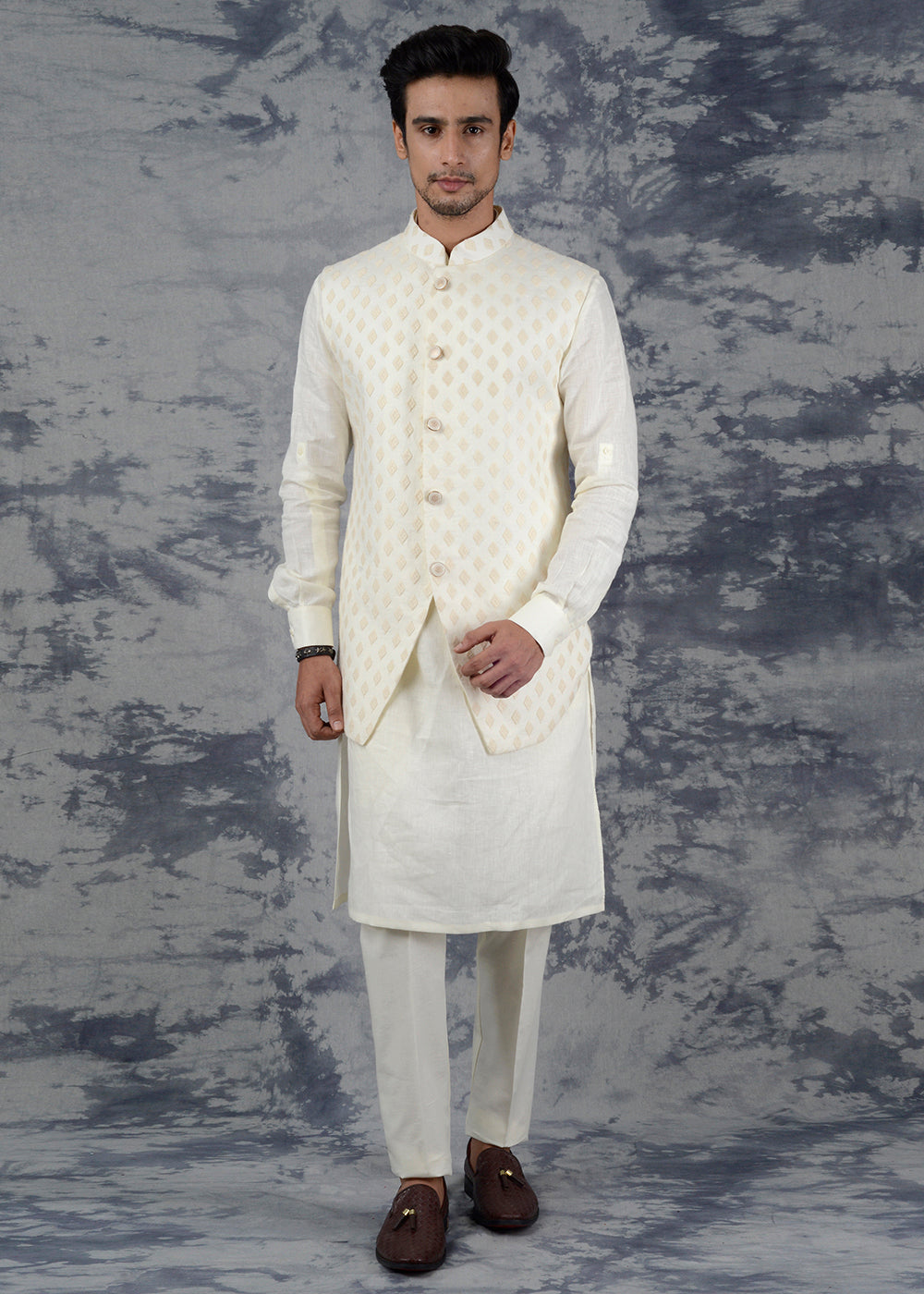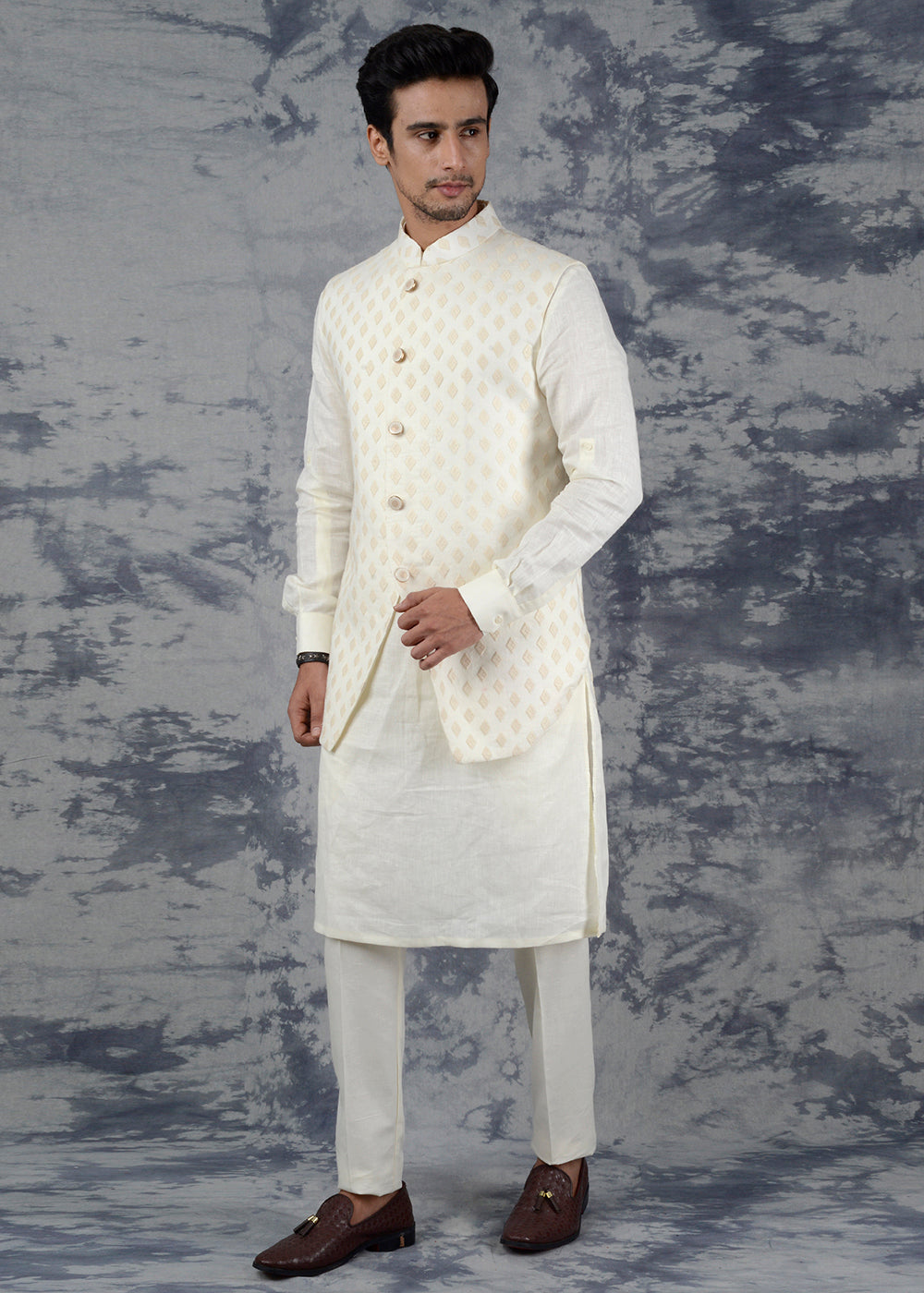 Details: You are sure to win a lot of compliments wearing this Cream Kurta Set with Jacket from the latest collection of TULA. Kurta features a mandarin collar, has full-sleeves. It comes with a solid matching churidar along with it. The jacket is adorned with a lovely self-embroidered pattern, which makes it a smart choice. Perfect for weddings, special events and festivals. Made with premium Linen, it ensures the utmost comfort all day long. Team it with a pair of White Jutti to achieve the desired look.
