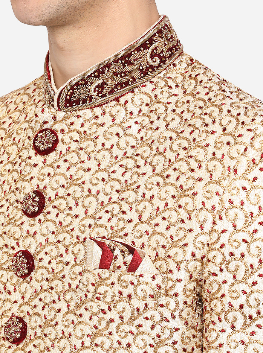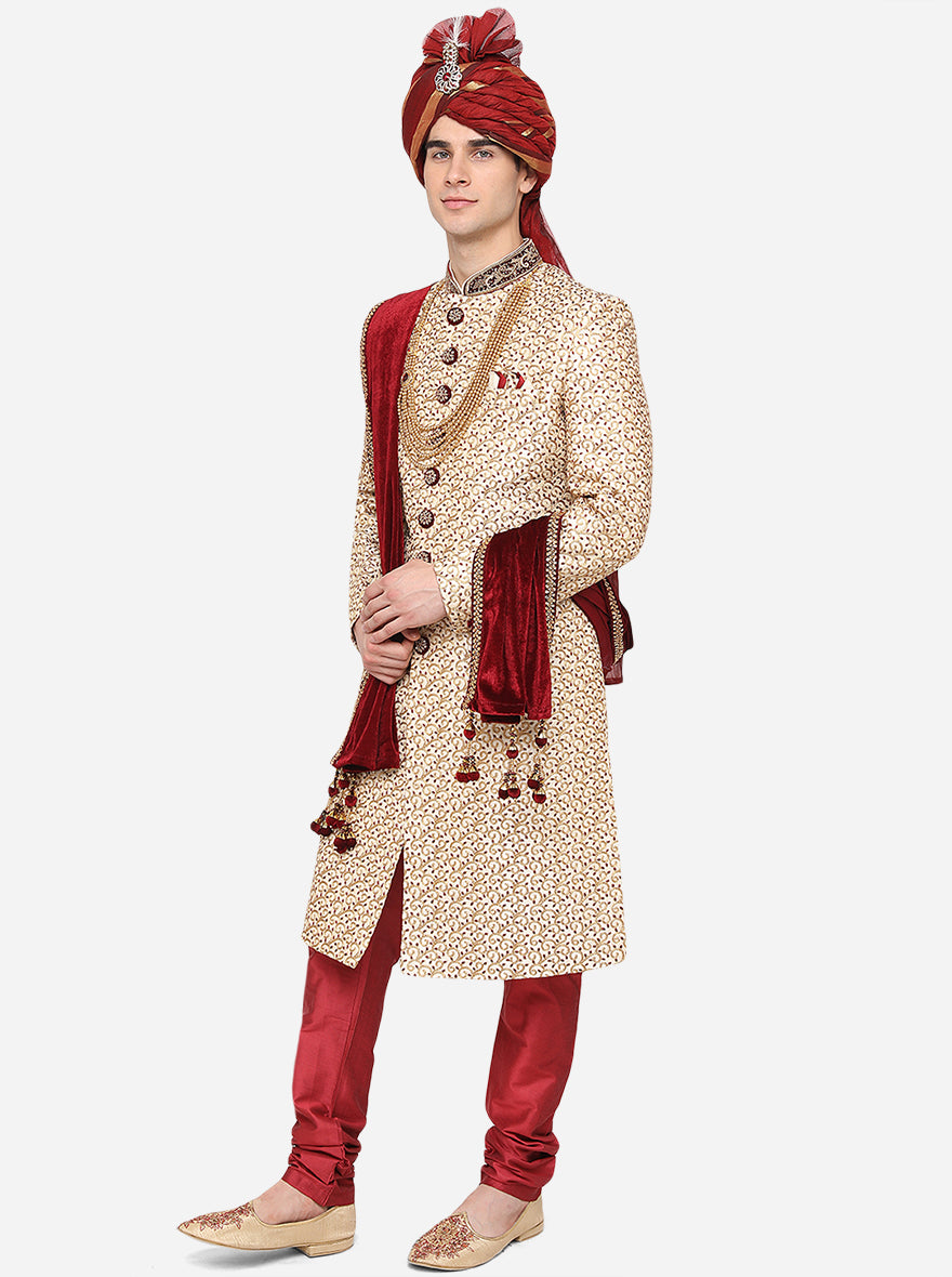 Details: Look absolutely stunning on your big day by dressing up in this Cream Sherwani from the latest collection of Azania. It includes a sherwani and a churidar. Featuring a mandarin collar, full-sleeves and a regular fit. Has fancy button placket on the front and embroidered work around the neckline. Overall, the sherwani is embroidered with golden work. It is accompanied with a solid contrast churidar. Made with Poly Silk fabric, it assures a great comfort during long hours. All you need is a Maroon mala and safa to complete the attire.