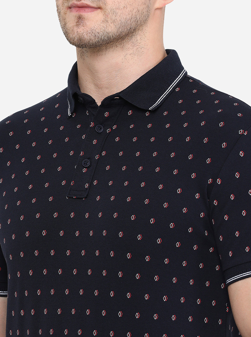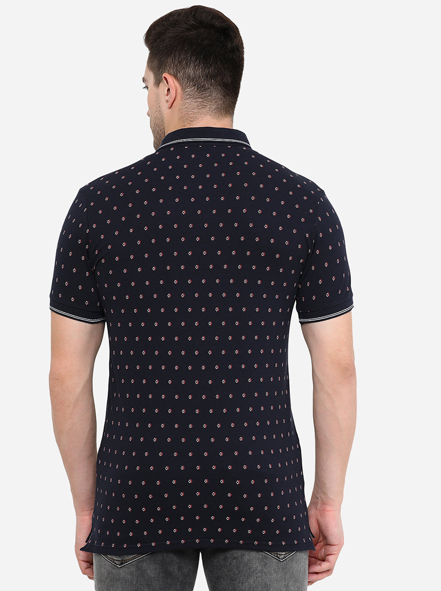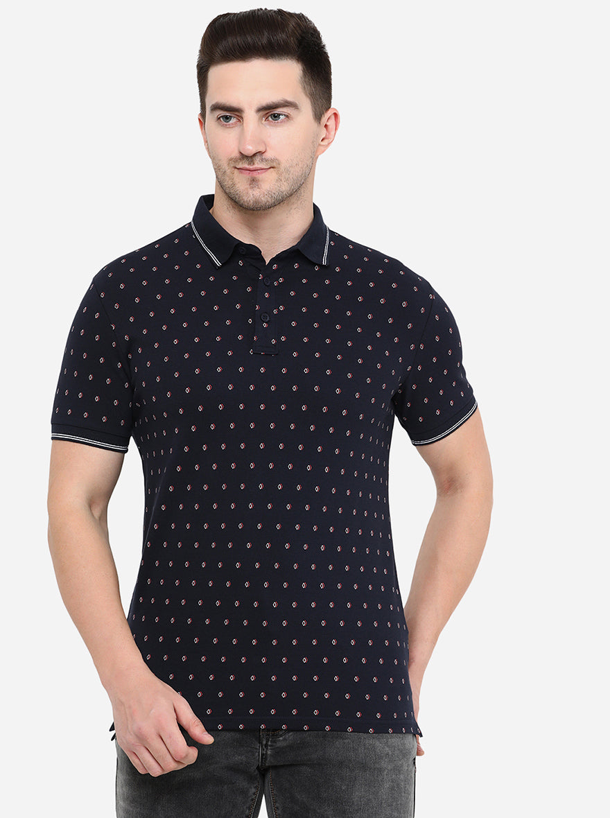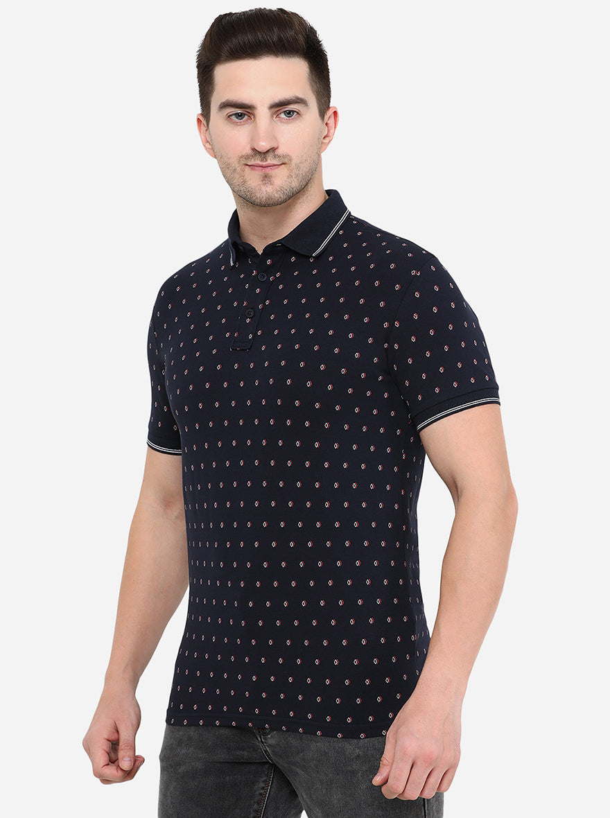 Dark Blue Printed Slim Fit Polo T-Shirt | JadeBlue