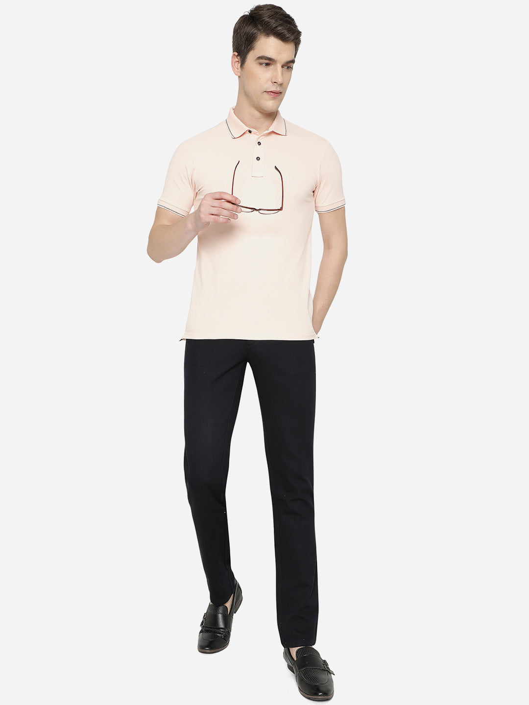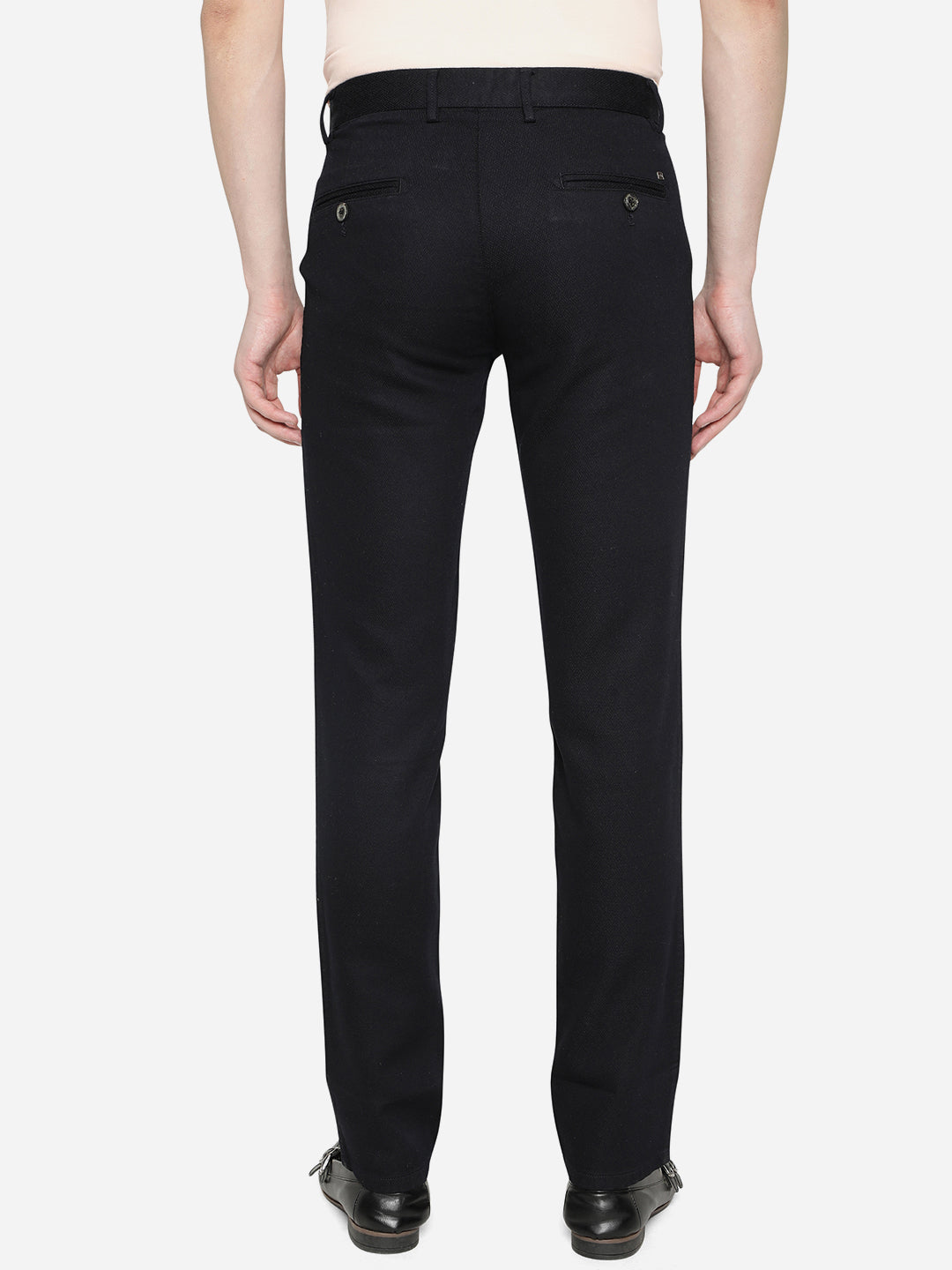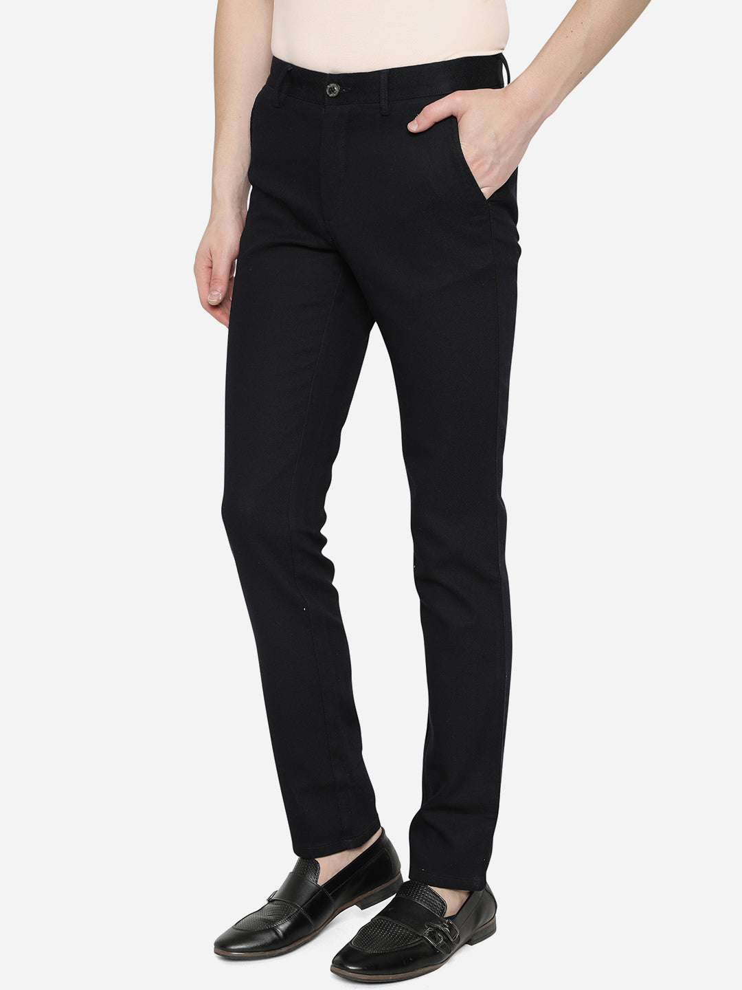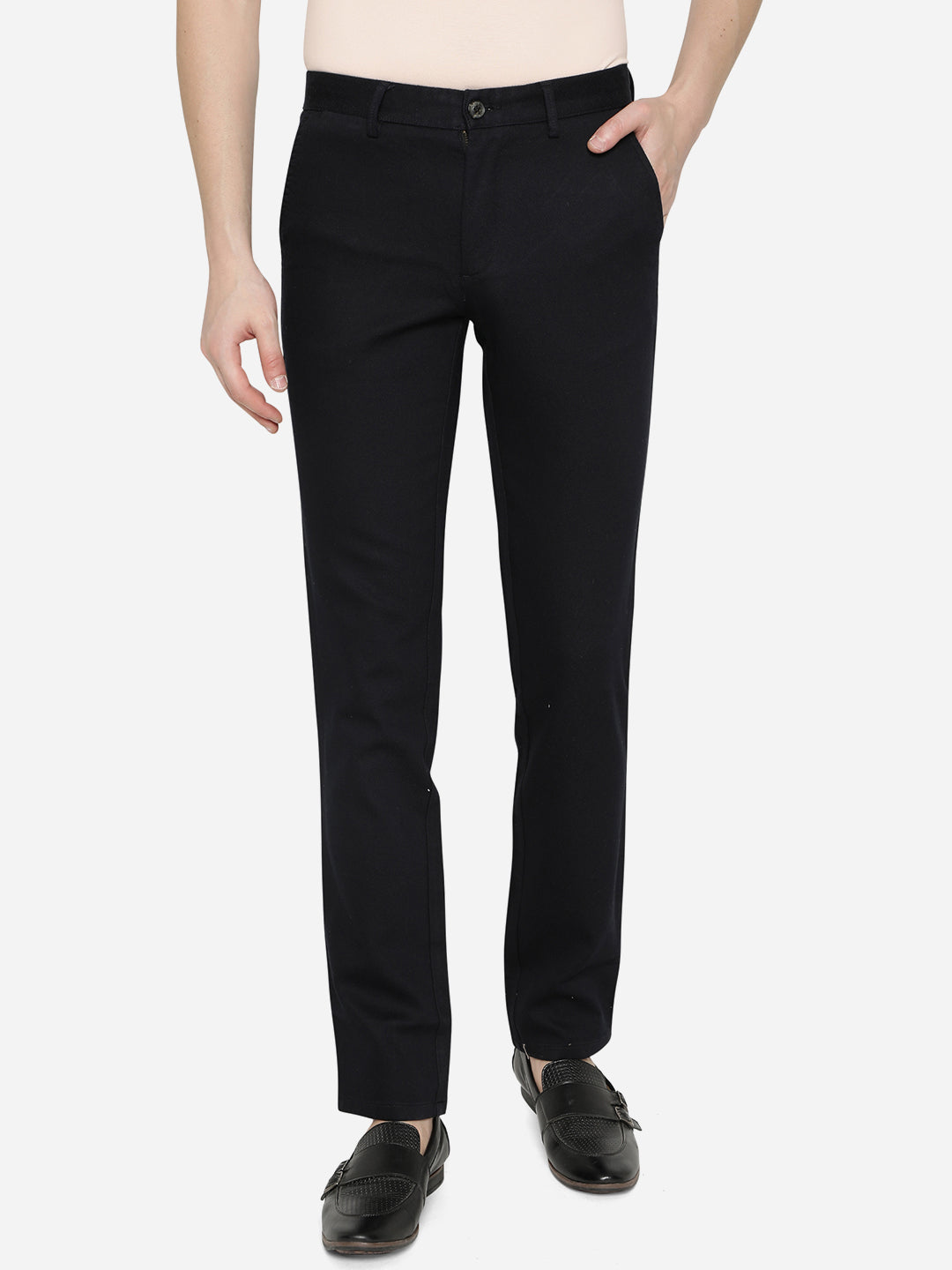 Details: Give a chic addition to your casual wear collection by opting for this solid dark blue casual trouser to it. Designed by JadeBlue, this uno fit trouser is crafted using good quality of skin-friendly cotton fabric, which is easy on your skin and offers all day wearing comfort. This trouser is tailored to precision and features belt loops, single button closure, side slant pockets, rear welt buttoned pockets and zip fly fastening, which lends it a functional touch. Pair this trouser with a printed T-shirt, watch and casual footwear.