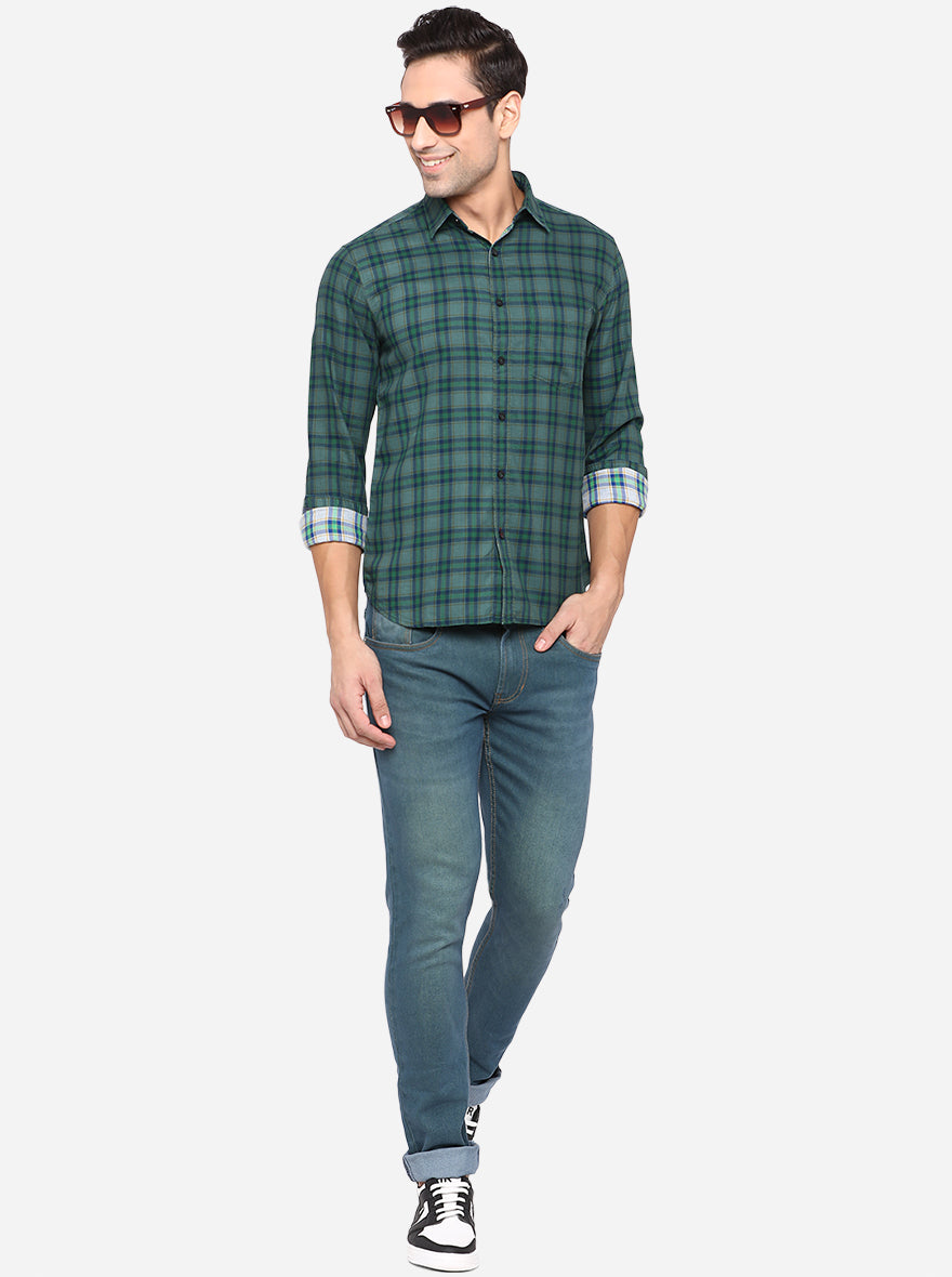Details: Splash some color to your wardrobe by getting yourself this Dark Green Shirt from the latest collection of Greenfibre. It features a shirt collar, full-sleeves and offers a slim-fit. It is adorned with a checked pattern, which makes it a versatile pick. Perfect for semi-casual wear or weekend wear. Crafted with pure cotton, it allows a great comfort and a great breathability during long hours. Team it with a well-fitted Black denim and sneakers to complete the look.