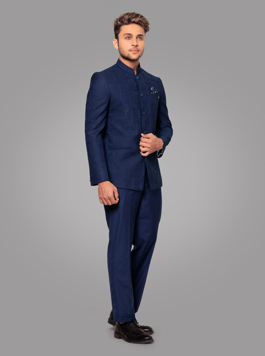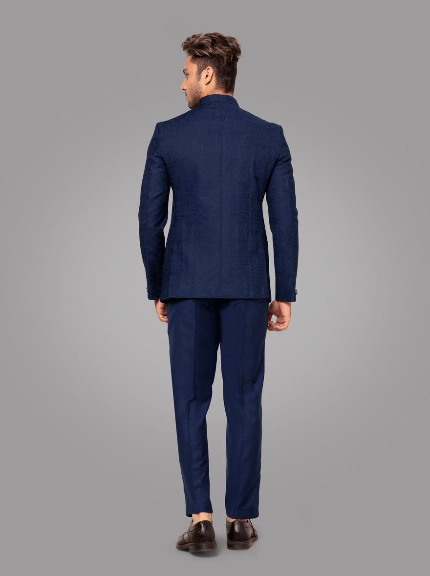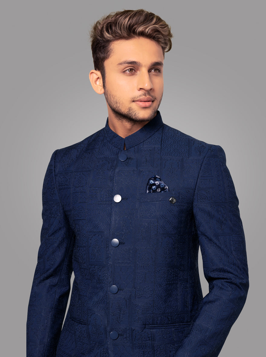 Details: Elevate your style quotient with the JadeBlue Men's Jodhpuri Suit. Crafted from a luxurious silk blend fabric, this suit offers a perfect blend of sophistication and comfort. The intricate Resham embroidery adds a touch of elegance, making it a standout choice for special occasions. Whether you're attending your brother's sangeet or reception, this Jodhpuri suit will make you the center of attention. With its regular fit and classic, straight cut, this Jodhpuri suit is designed to flatter your physique and provide unrestricted movement. The full sleeves add a refined touch, while the deep blue color exudes confidence and charm. The regular collar enhances the overall appeal, making it suitable for both traditional and contemporary settings.