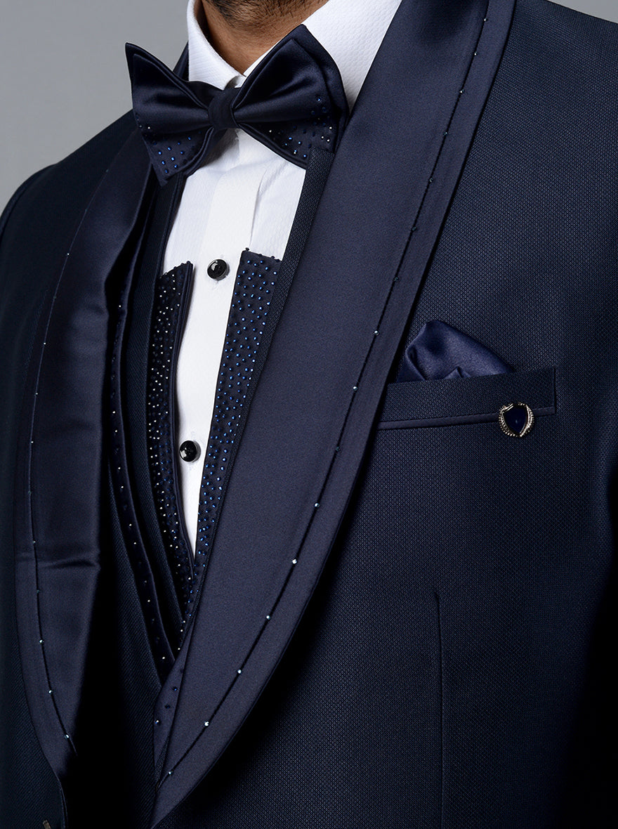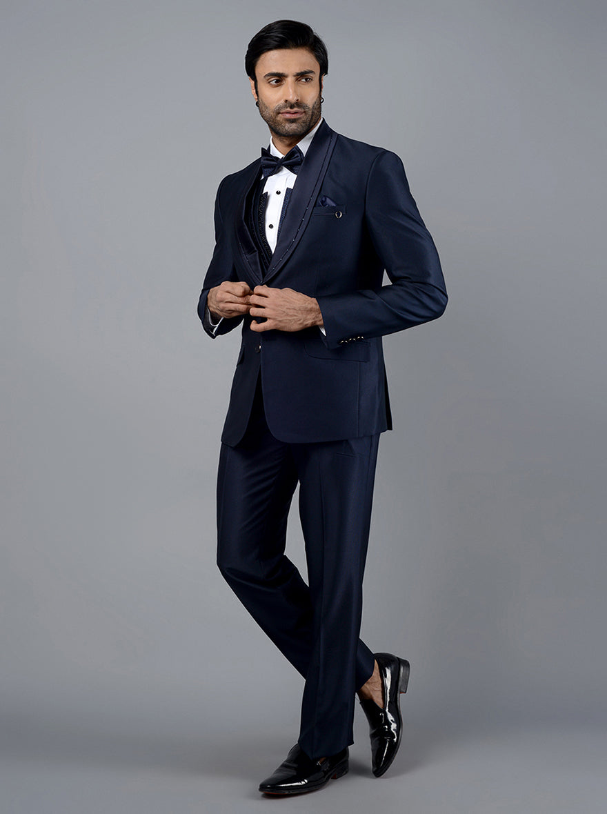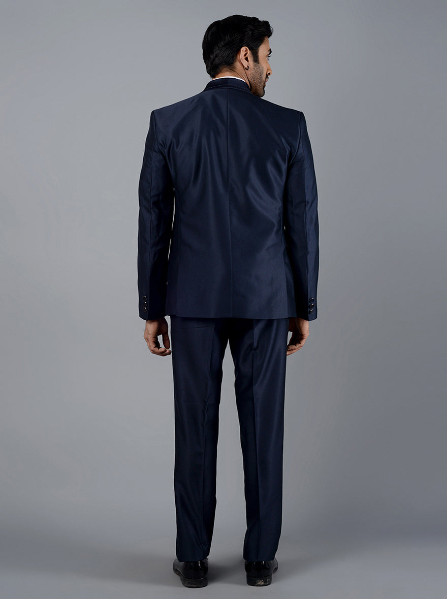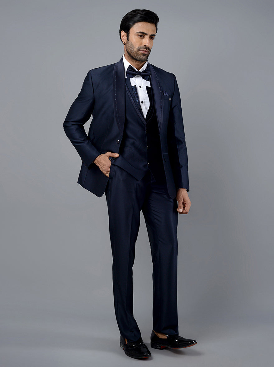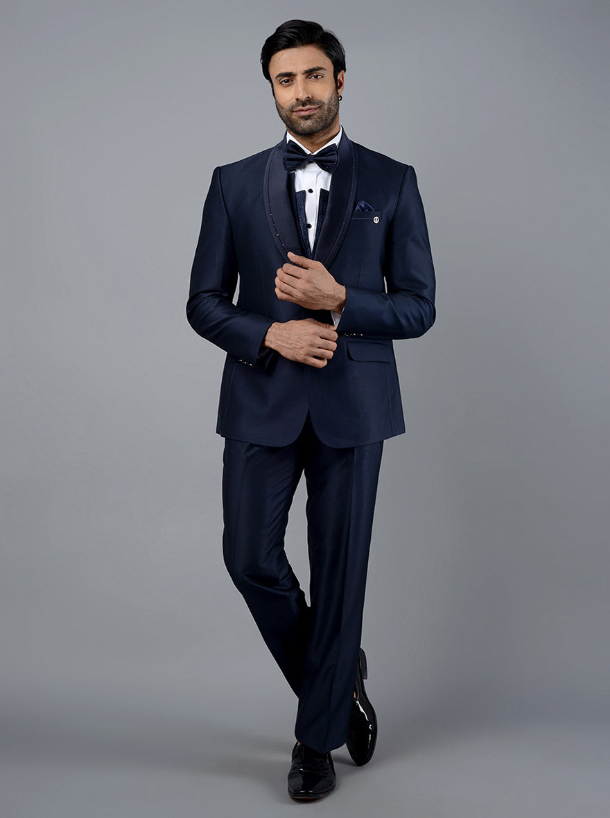 Details: Get imperially into class with this Deep Blue Self Textured Suit from Latest arrival of the JadeBlue. Crafted with Lightweight, Strong yet super comfortable Terry Rayon Fabric to hug you well round the clock. Adorned with Diamond Embroidery for the rich glimpse. Skilled Tailoring of Single breasted, 2 buttons, shawl lapel with the comfort fit makes it the modest choice. Comfort Fit feature for smart aesthetic spirit. Teaming the attire with Black Formal Shoes will stablish the class out of fashion. Authentic for big family functions, Wedding receptions and Corporate Events.