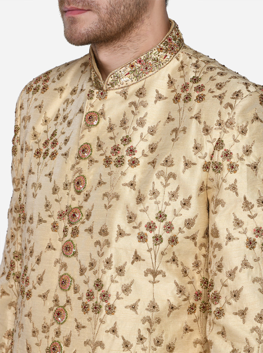 Details: Get admired for your distinct taste in Sherwani by opting for this Embroidered Golden men's Sherwani . Crafted using Silk this stunning piece features mandarin collar and side slits. his men's Sherwani by JadeBlue will make heads turn wherever you go. Made from quality SilkComplete the look with a matching bottomwear and your favorite accessory for a sharp look that's sure to impress at any event. Standout from the crowd! Tailored to offer extreme comfort.